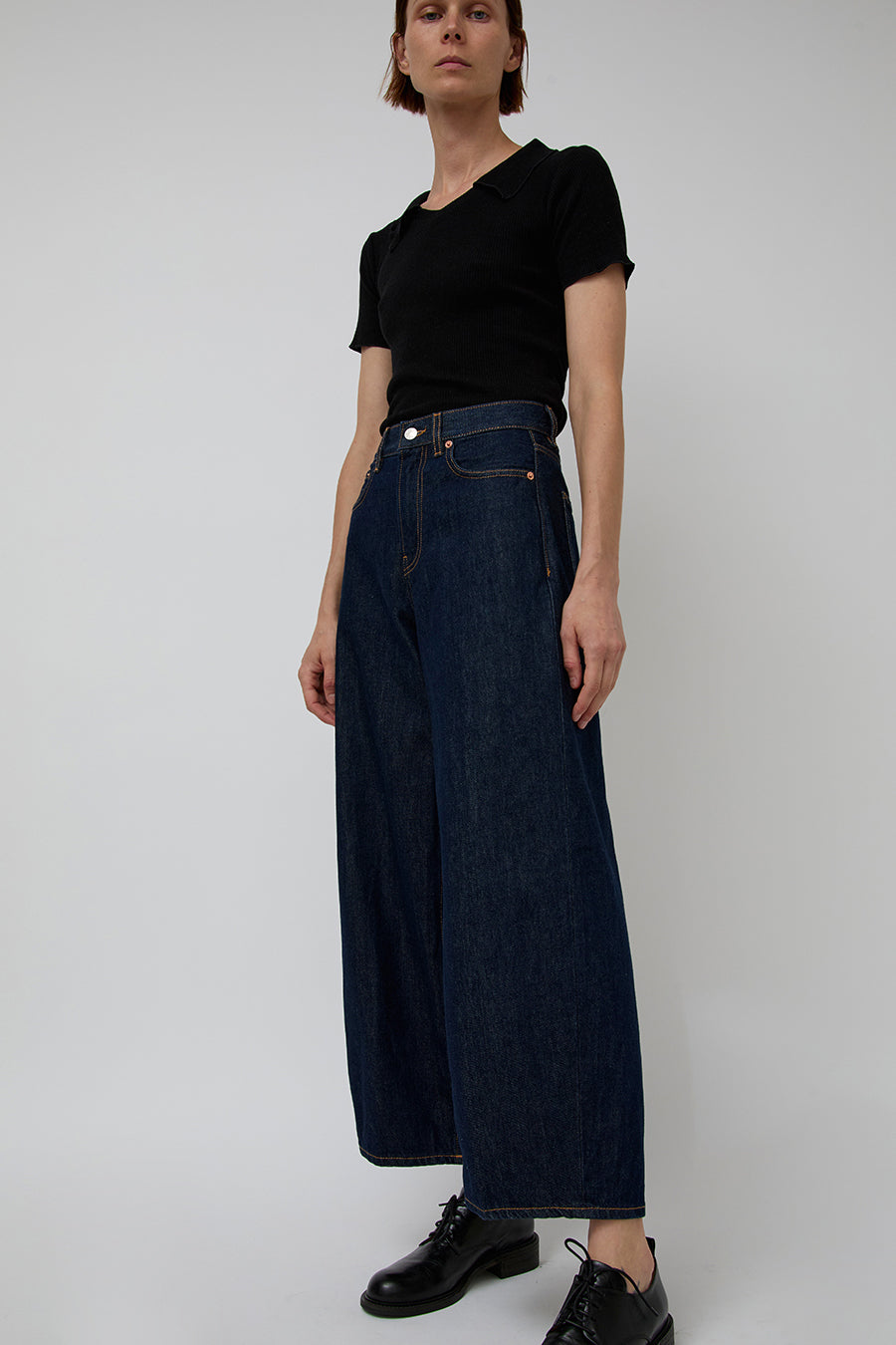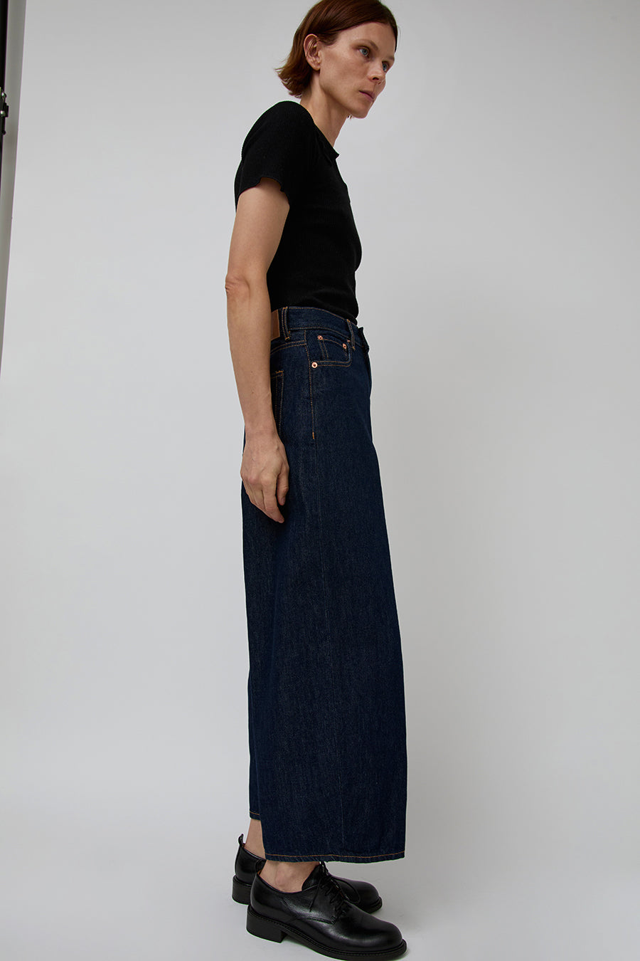 The Cropped Roomy Jean in Rinsed Raw has a super wide, cropped leg. The jean is designed to sit at the waist and has traditional 5-pocket details. Fits true to size.