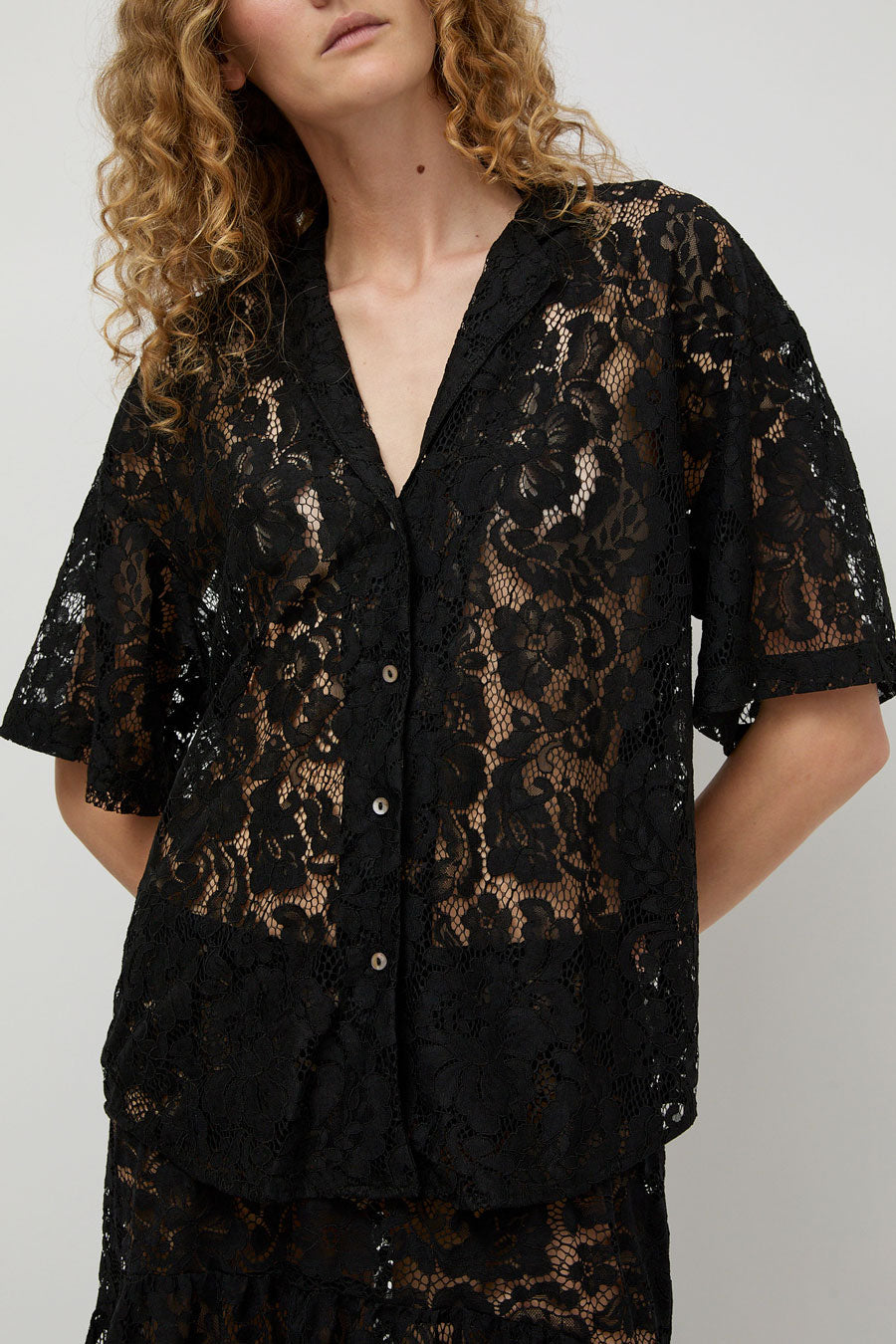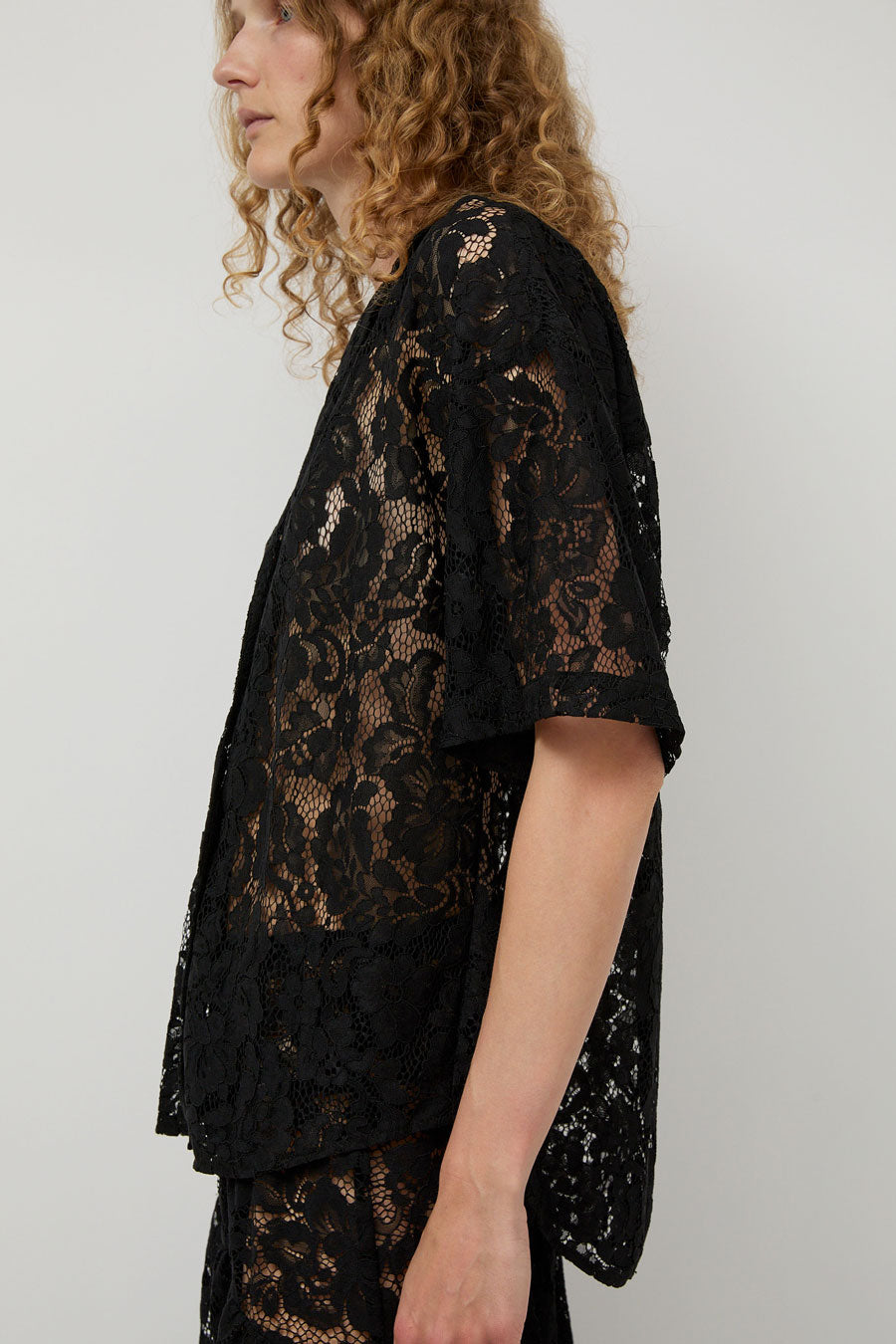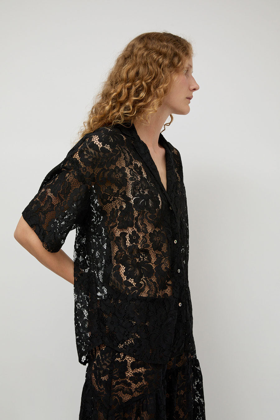 Oversized button down with short sleeves cut in a romantic cotton blend lace. Narrow, notched lapel collar and back yoke detail. Wear with the Field Skirt in Black Lace from A Bronze Age for the complete set.