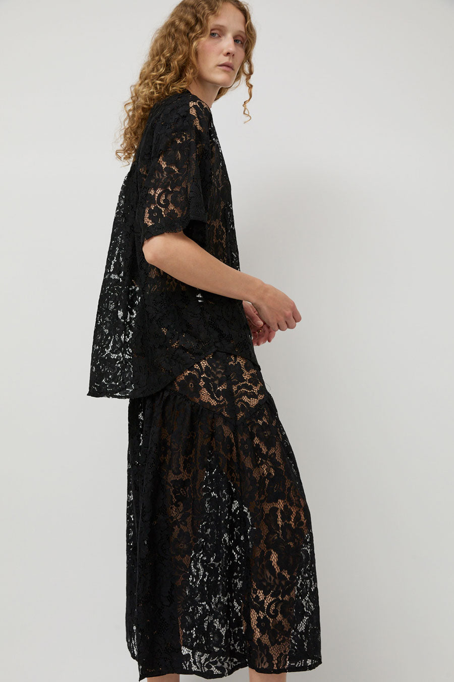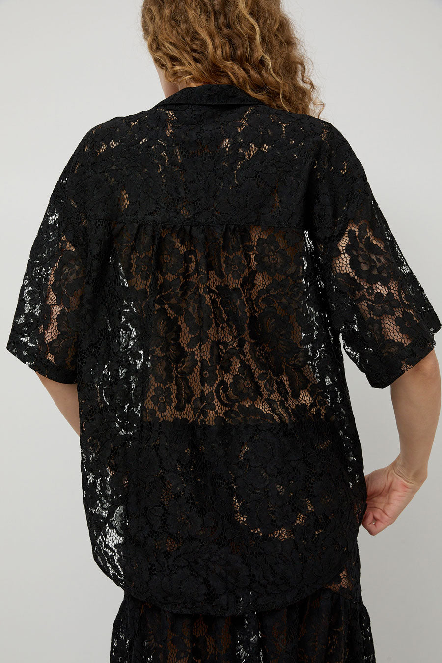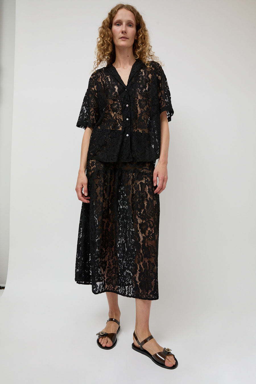 Oversized button down with short sleeves cut in a romantic cotton blend lace. Narrow, notched lapel collar and back yoke detail. Wear with the Field Skirt in Black Lace from A Bronze Age for the complete set.