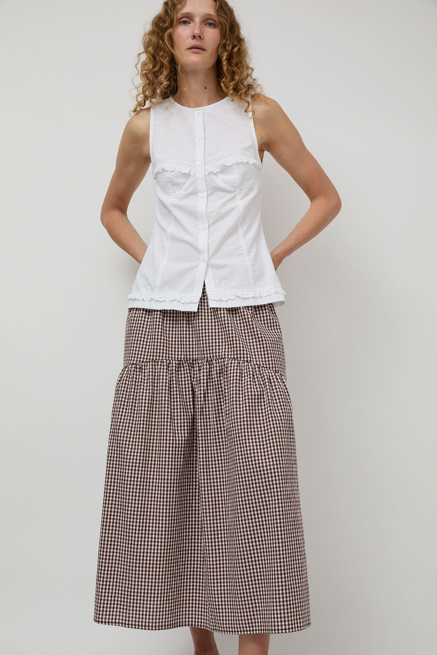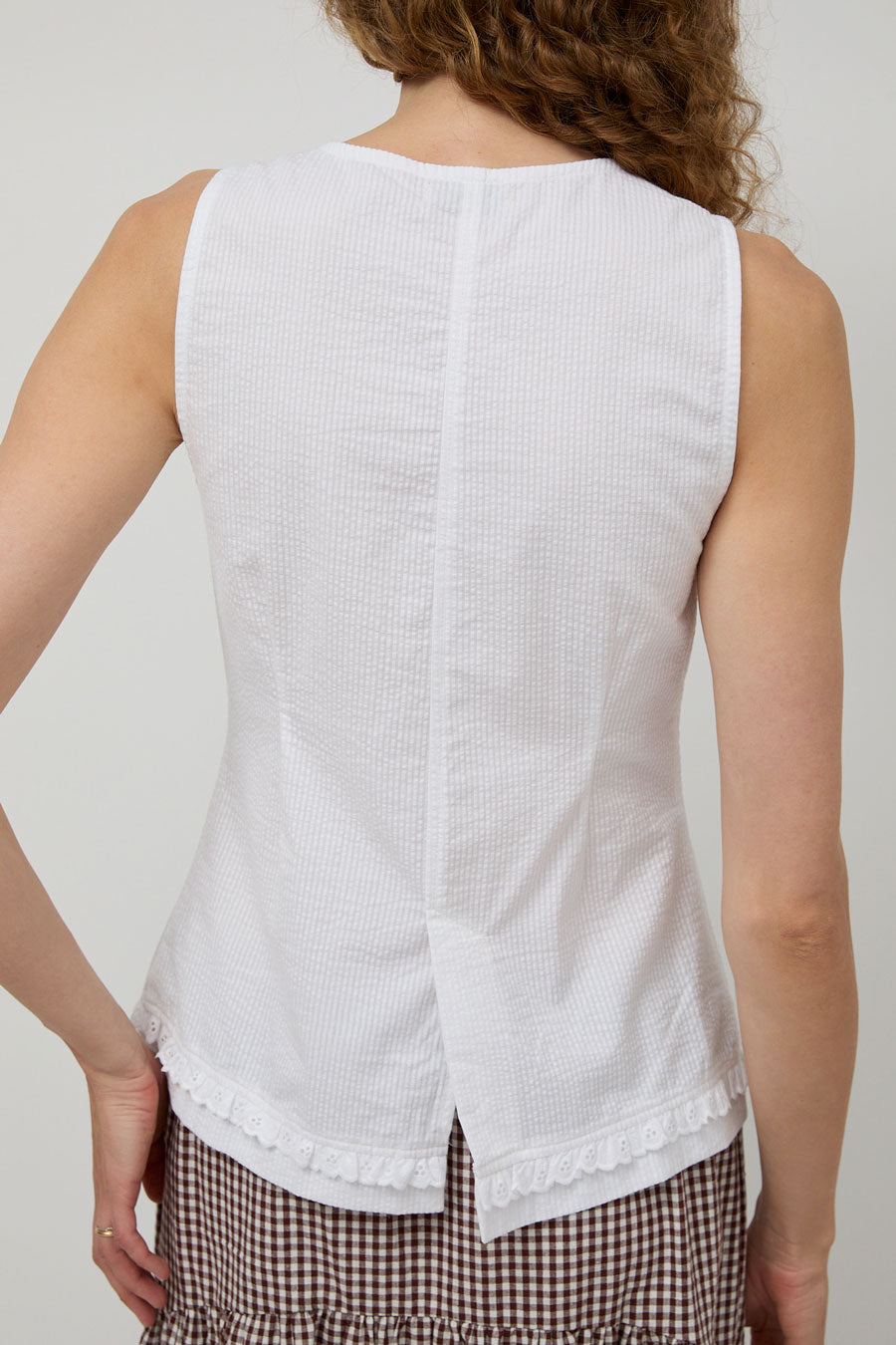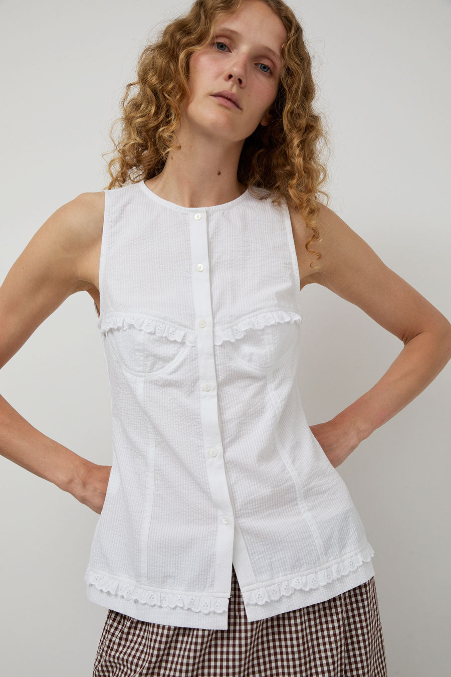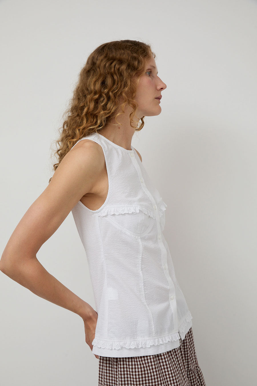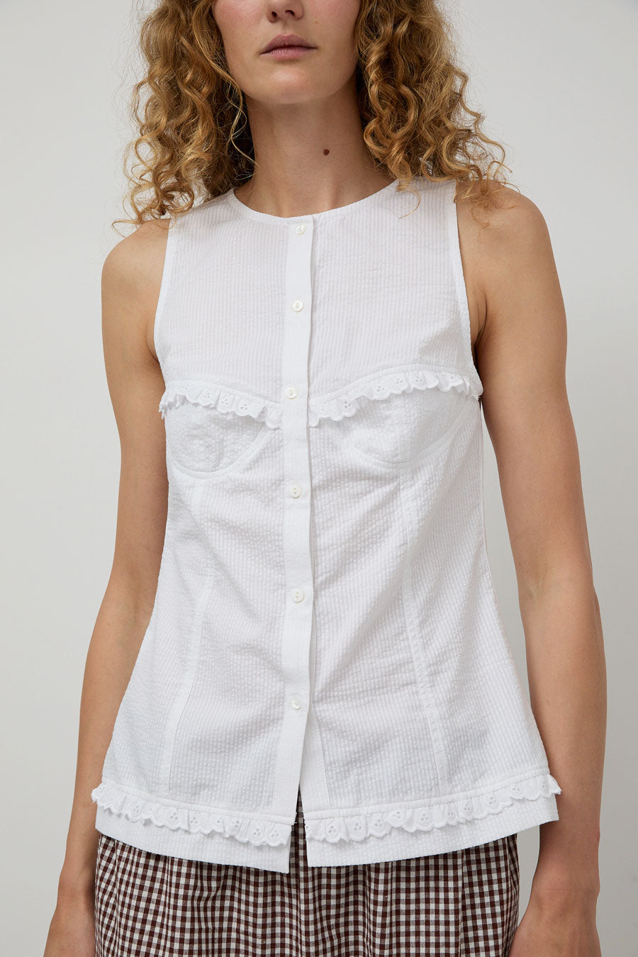 Sleeveless button-down cut in a crisp 100% cotton shirting. Slim fit with corset style dart detailing and center back slit. Features balconette shape bra detail with eyelet trim on upper cup and hemline.