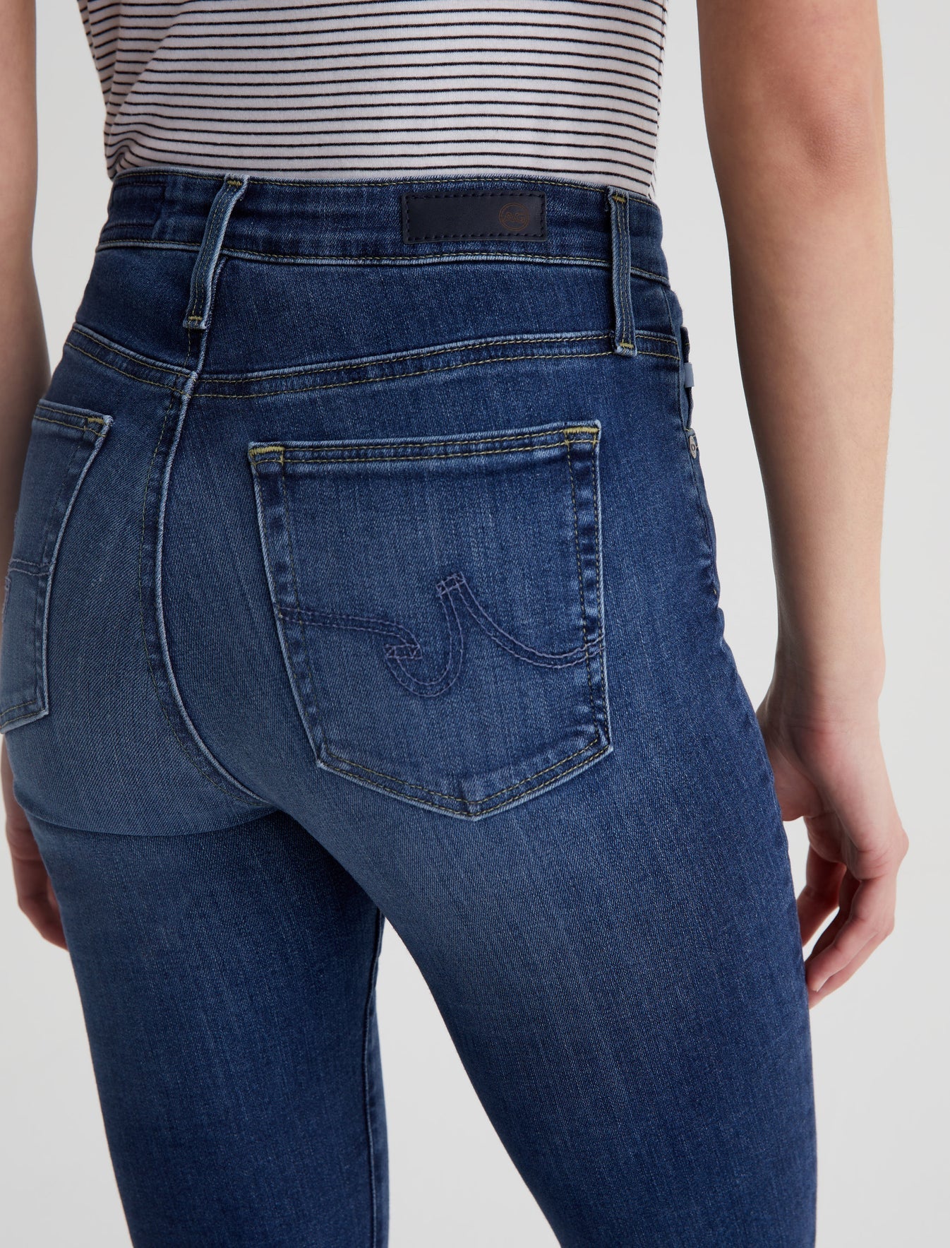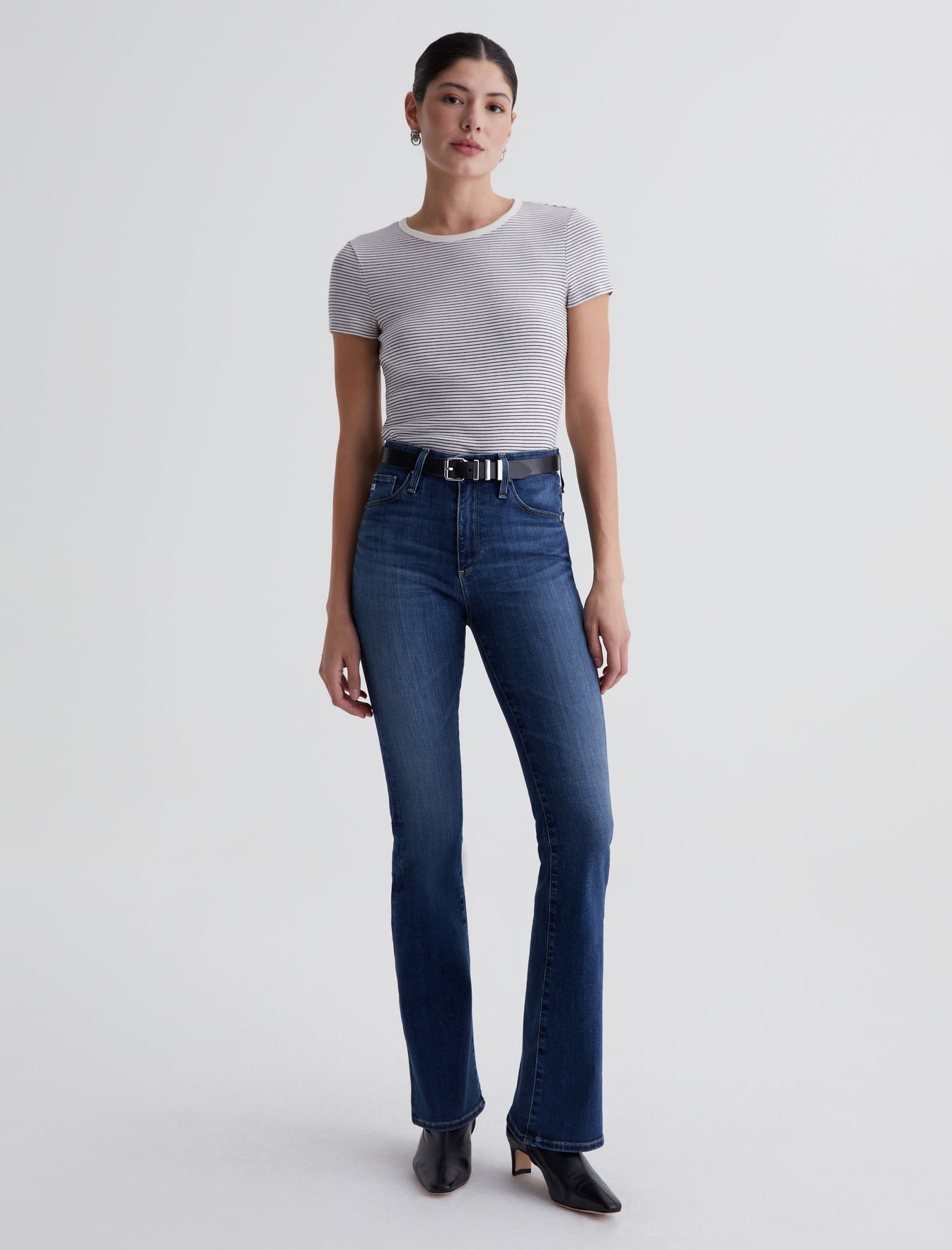 The Farrah Boot is a high-rise bootcut jean with a skinny fit through the legs before opening into subtly flared hems. Crafted from 9.5 oz. Premiere Stretch Indigo Denim, these five-pocket jeans have a dark blue wash with fading and whiskering for an authentic broken-in look.