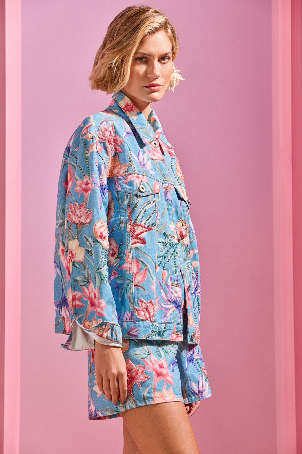 Vibrant and structured, this floral jacket features a tailored fit and a bold tropical print that instantly elevates any look. Designed with a classic collar, front flap pockets, and polished buttons, it adds a statement-making touch whether styled solo or with the matching set.