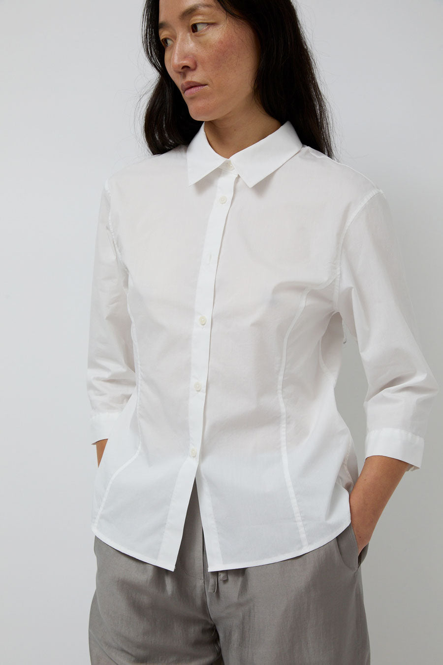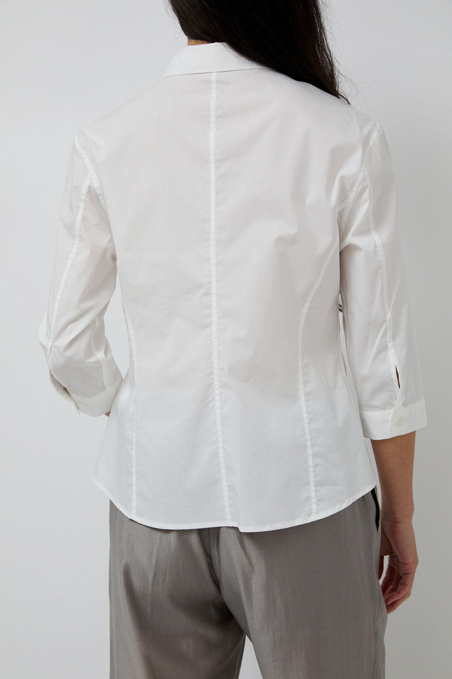 Slim fit cotton blend button down with 3/4 length sleeve. Flattering dart detailing at waist. Can easily dress up or down.