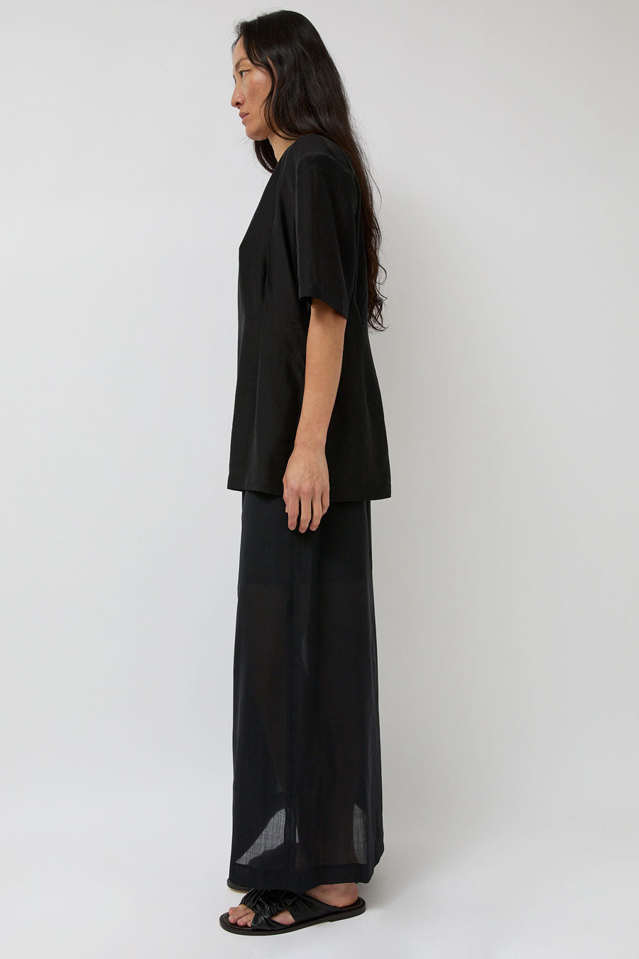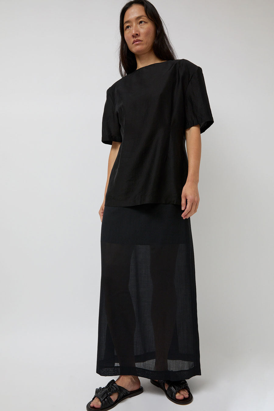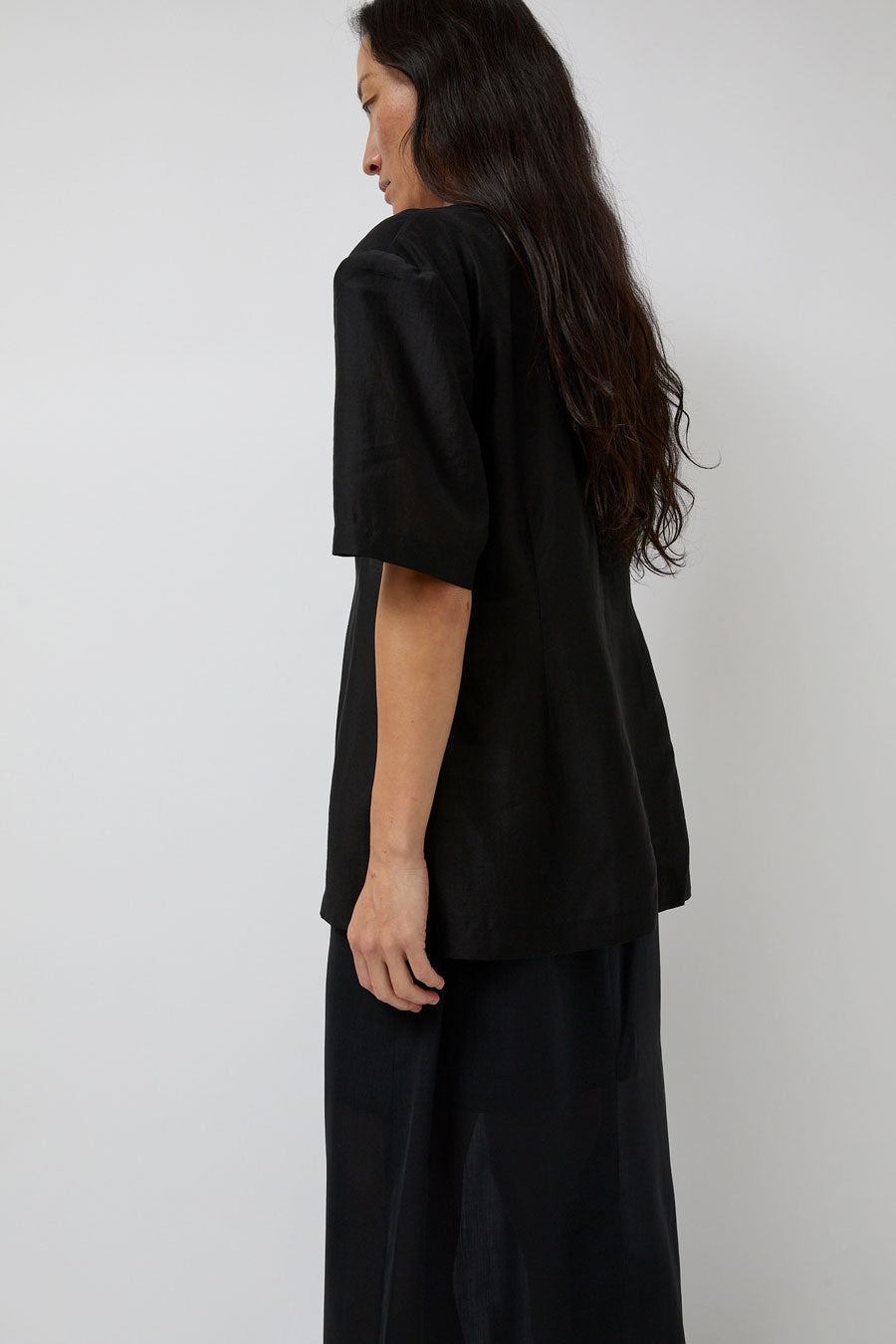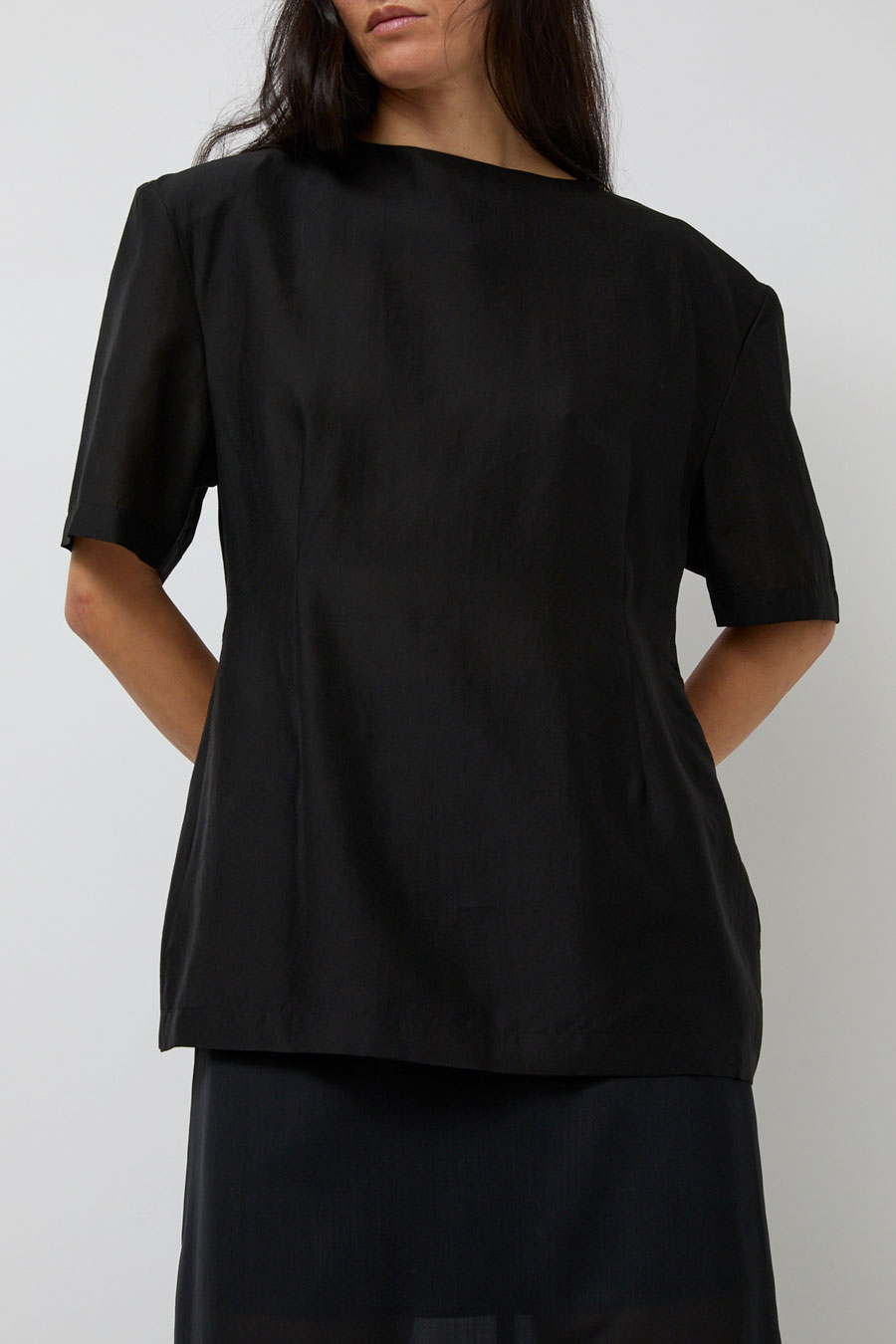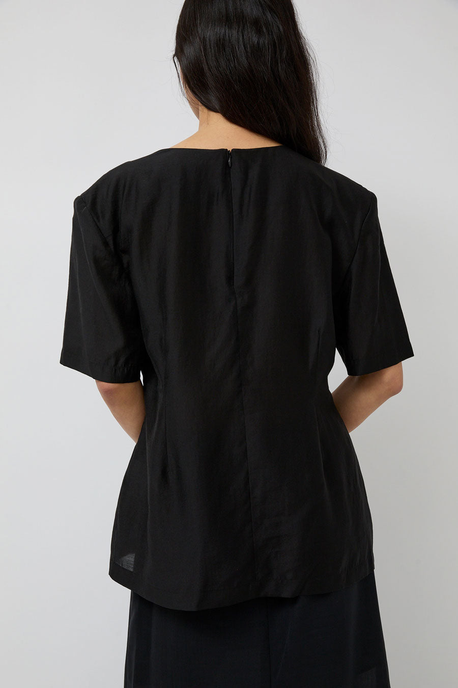 Structured half-sleeve shirt with subtle sheen and silky texture. Features built-in shoulder pads and dart detailing at the waist for a dramatic silhouette. Back zip closure.