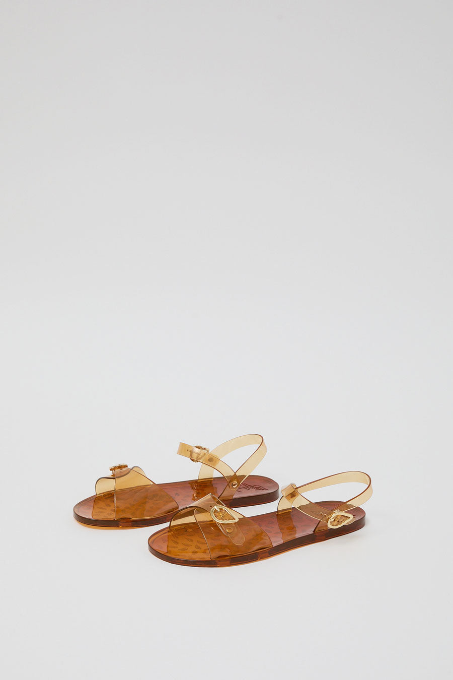Versatile rubber jelly sandal with adjustable toe and ankle strap. Features a signature winged buckle. Runs small. Half sizes size up.