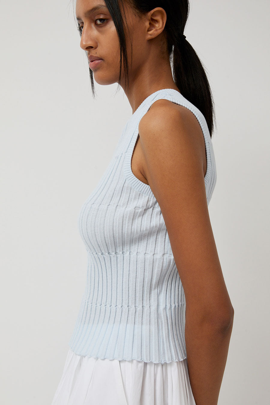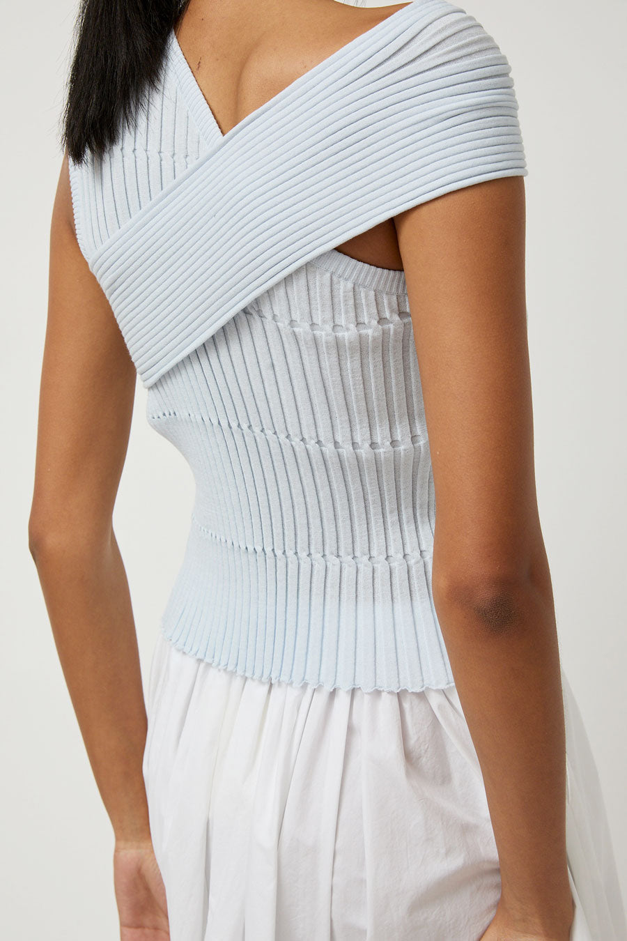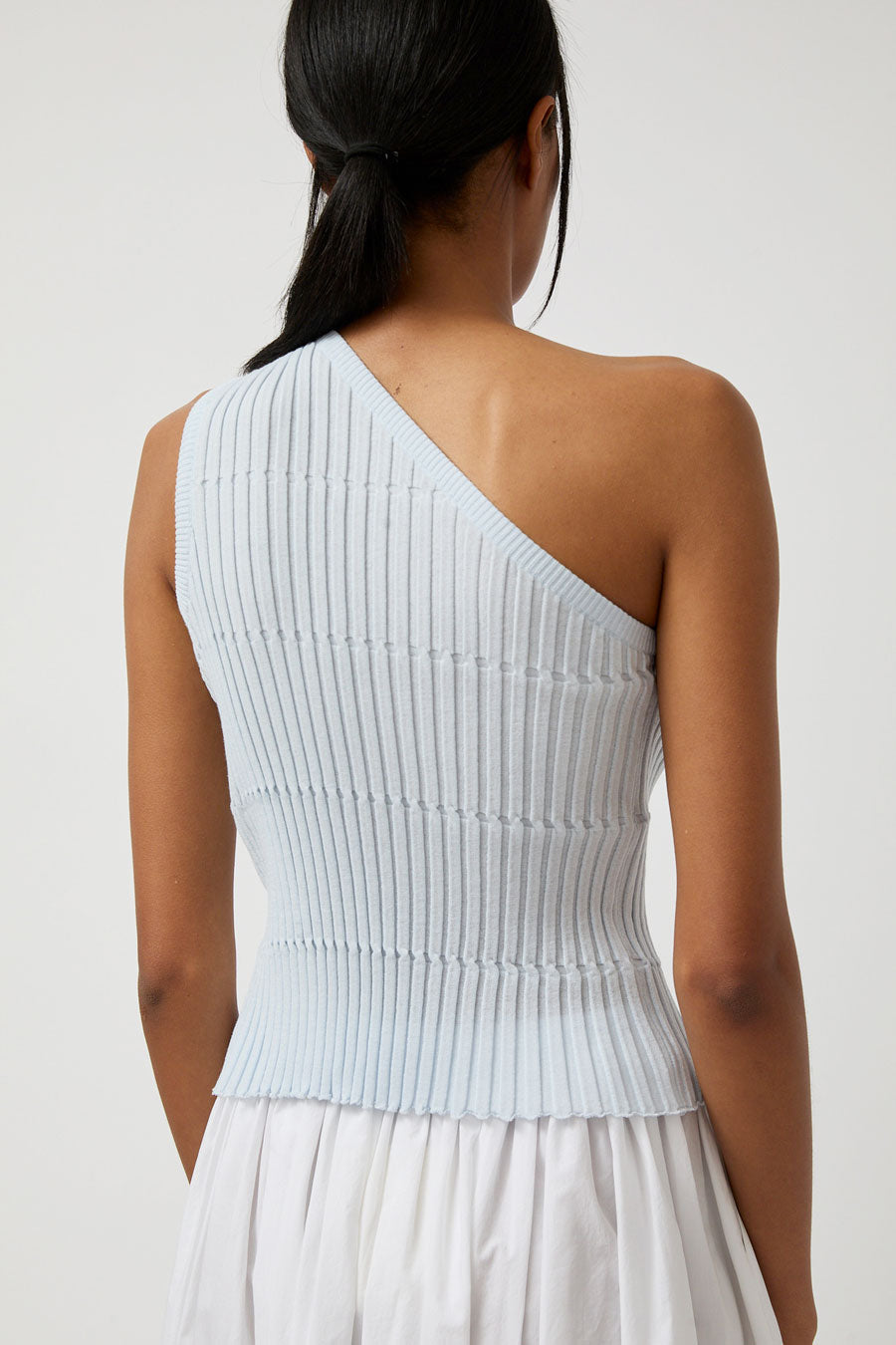 Textured, wide-ribbed cotton one-shoulder tank. Slim fit. Features removable ribbed sash for multiple styling options. Unique and easy to wear.