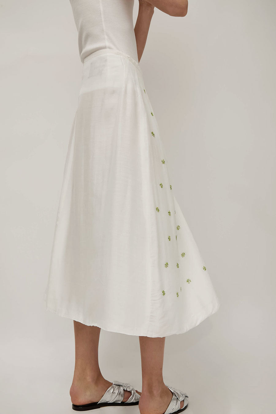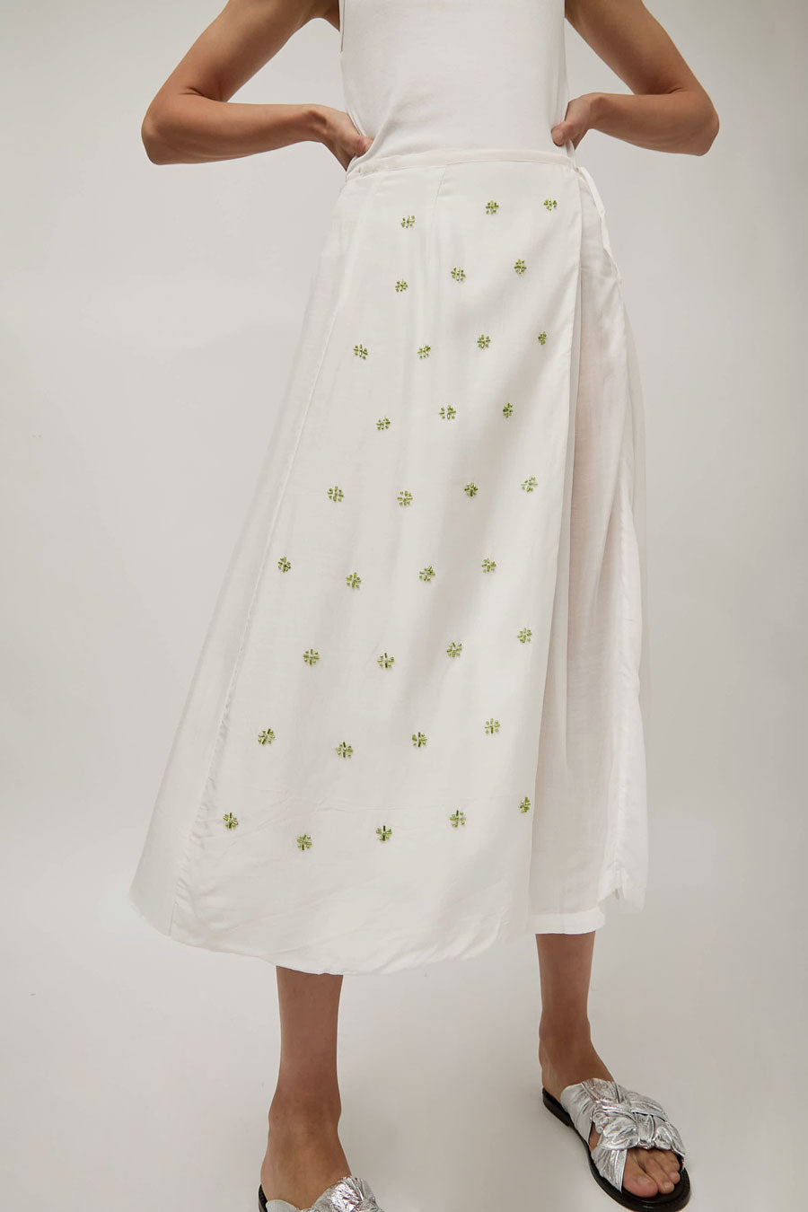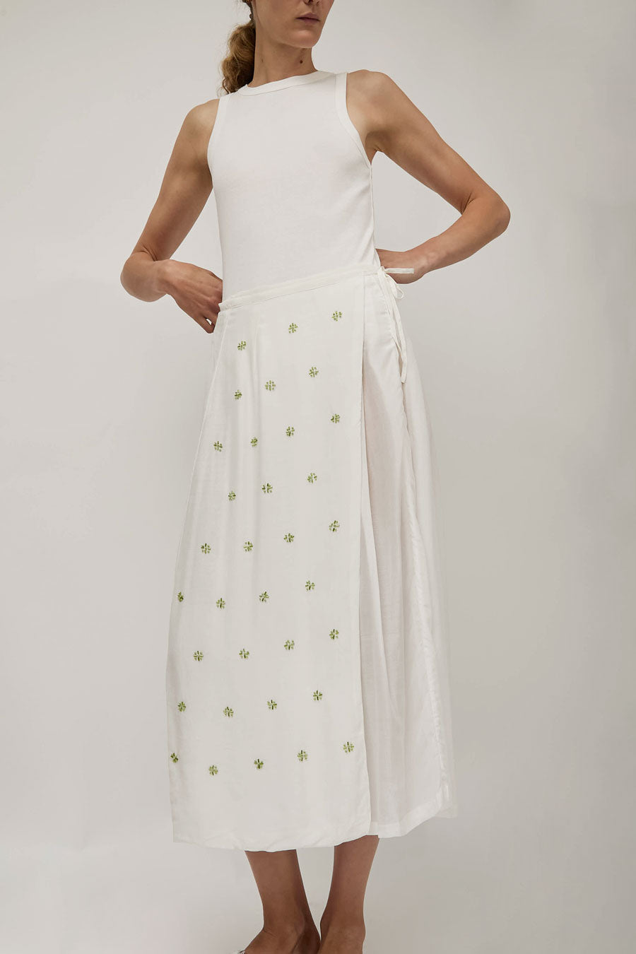 Pleated wrap skirt cut in semi-sheer recycled silk. Mid length. Features hand beaded flower motif across the front panel.