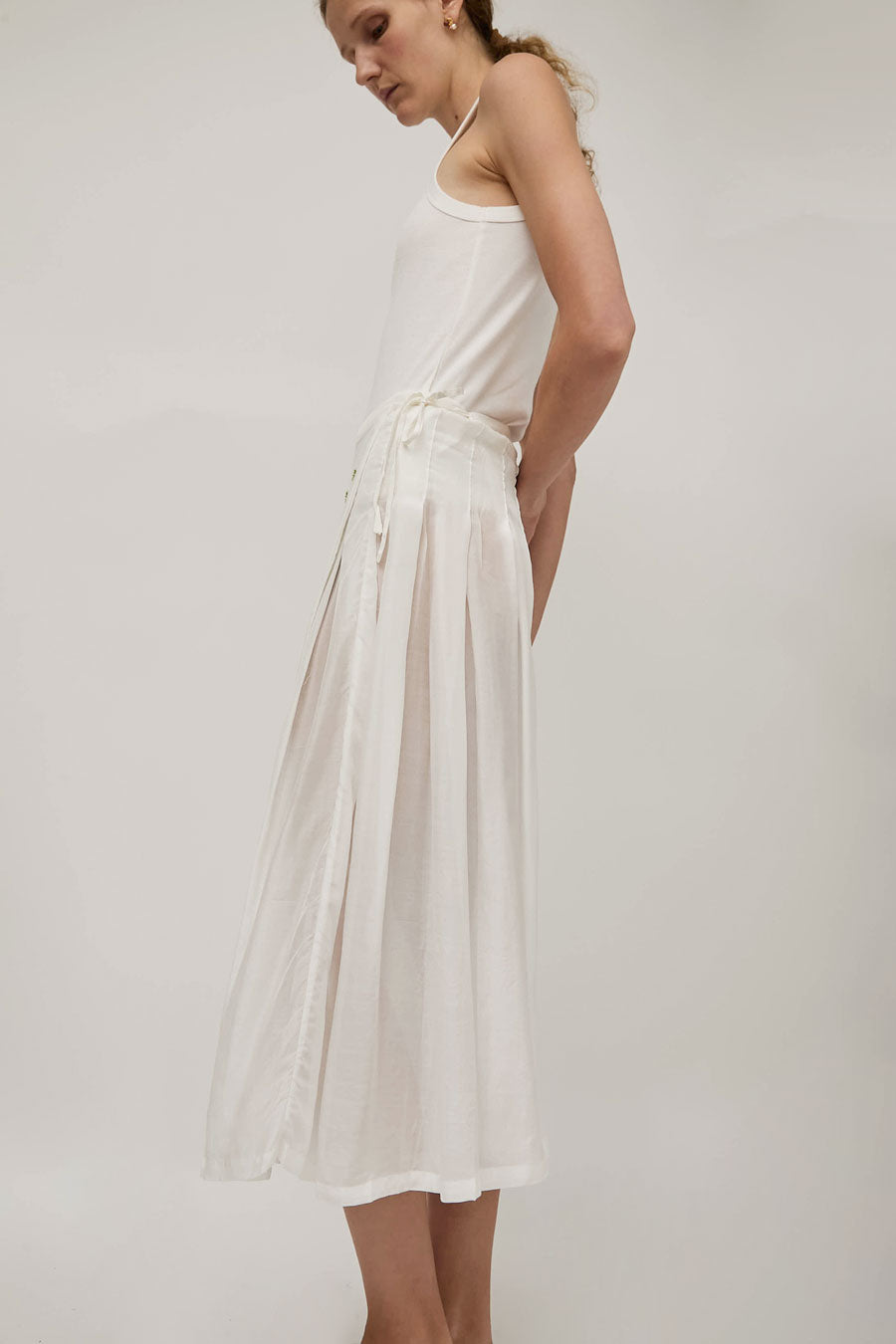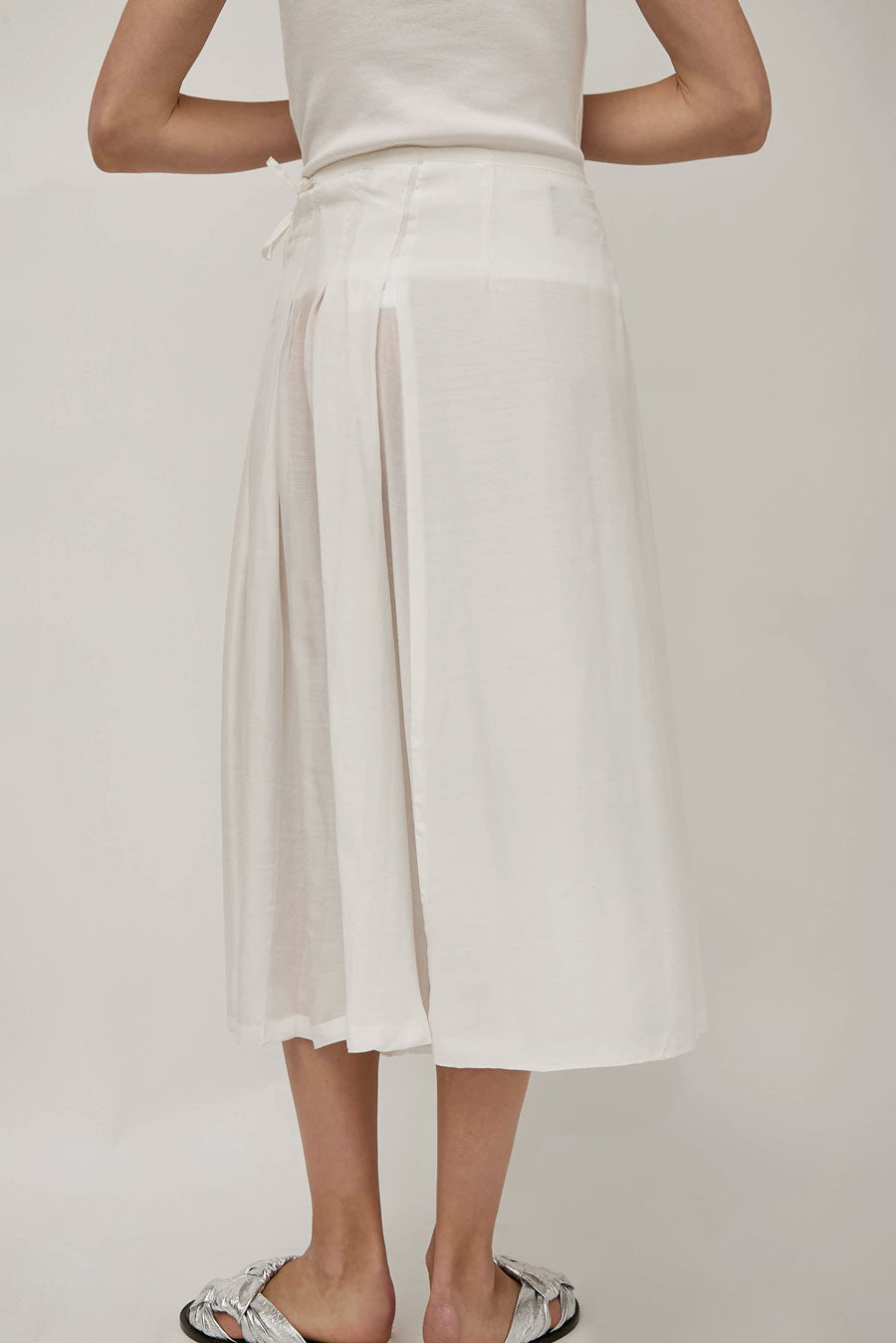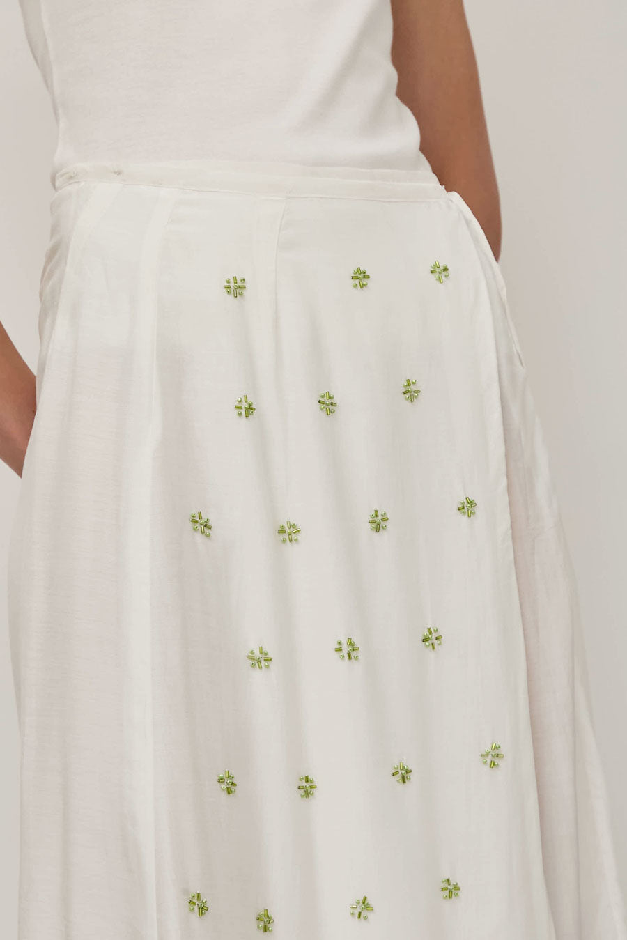 Pleated wrap skirt cut in semi-sheer recycled silk. Mid length. Features hand beaded flower motif across the front panel.