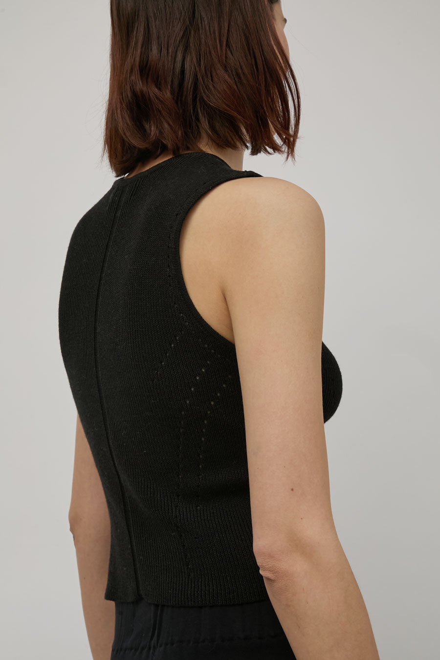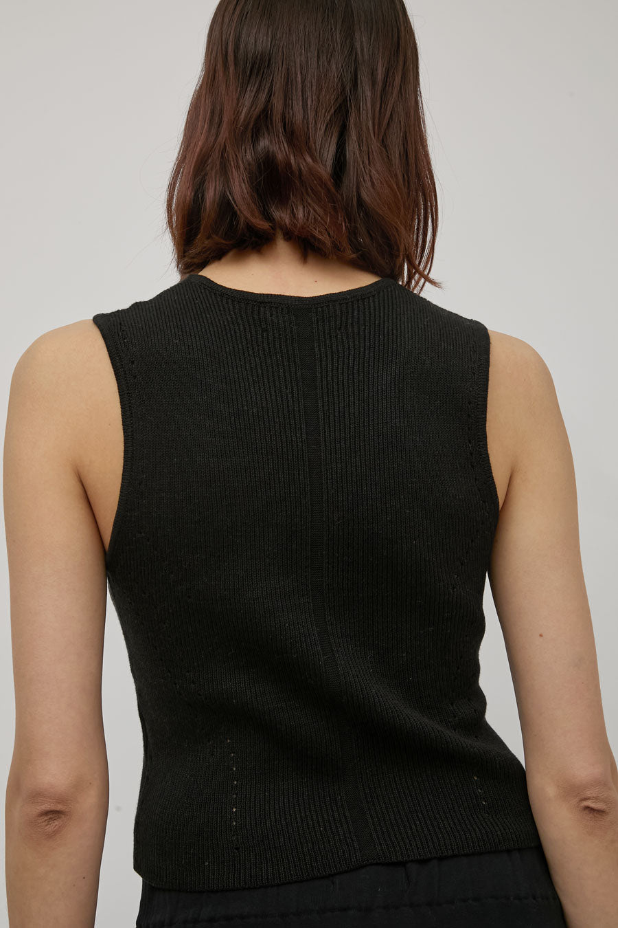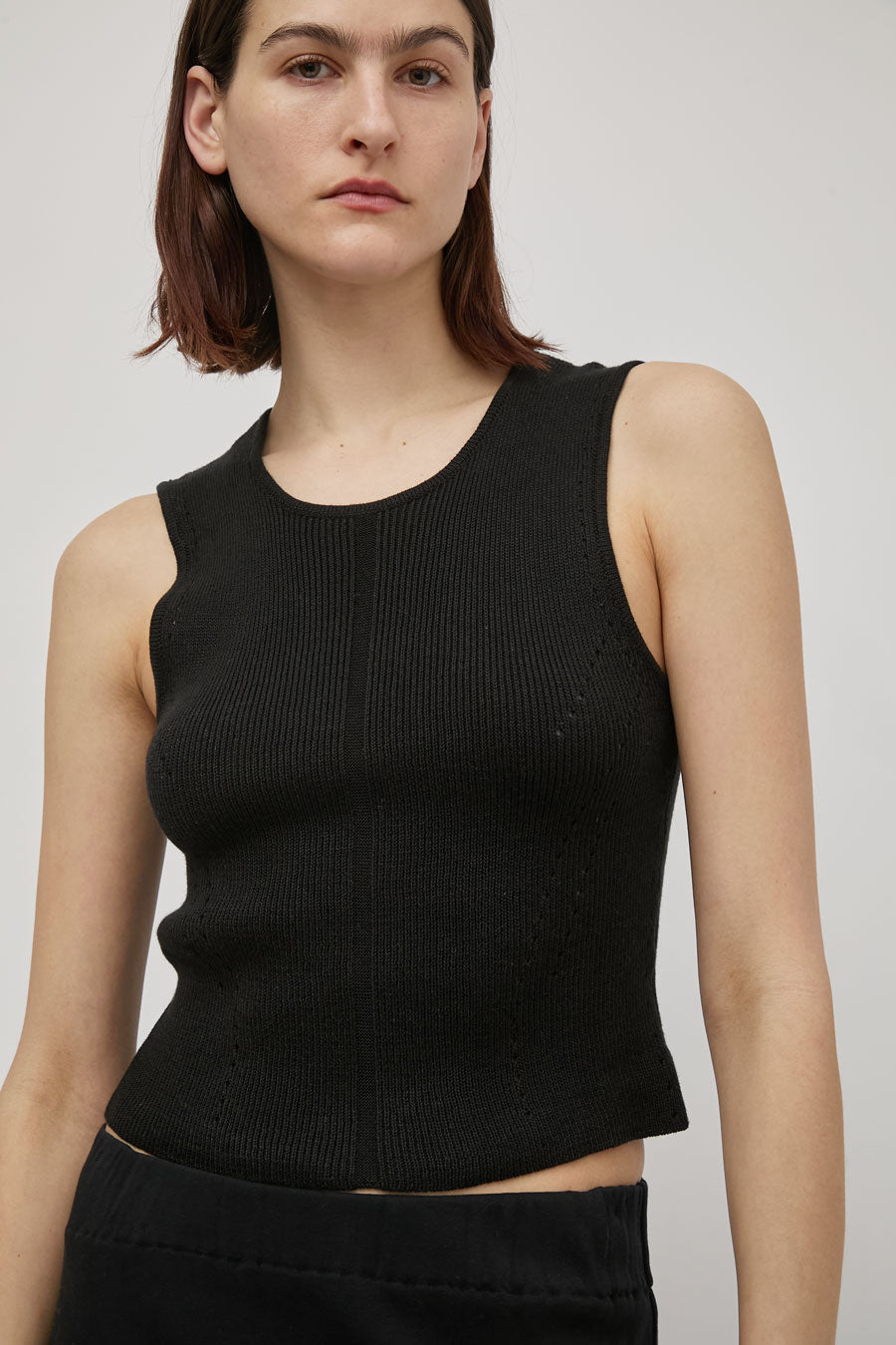 High gauge knit tank in a tight rib with center seam detail and arching open work along the side bust line. A great addition to your layering library.