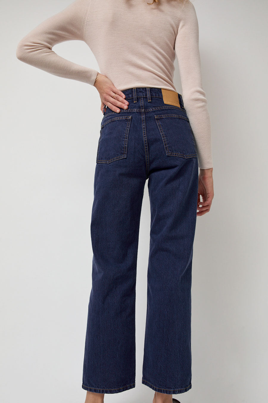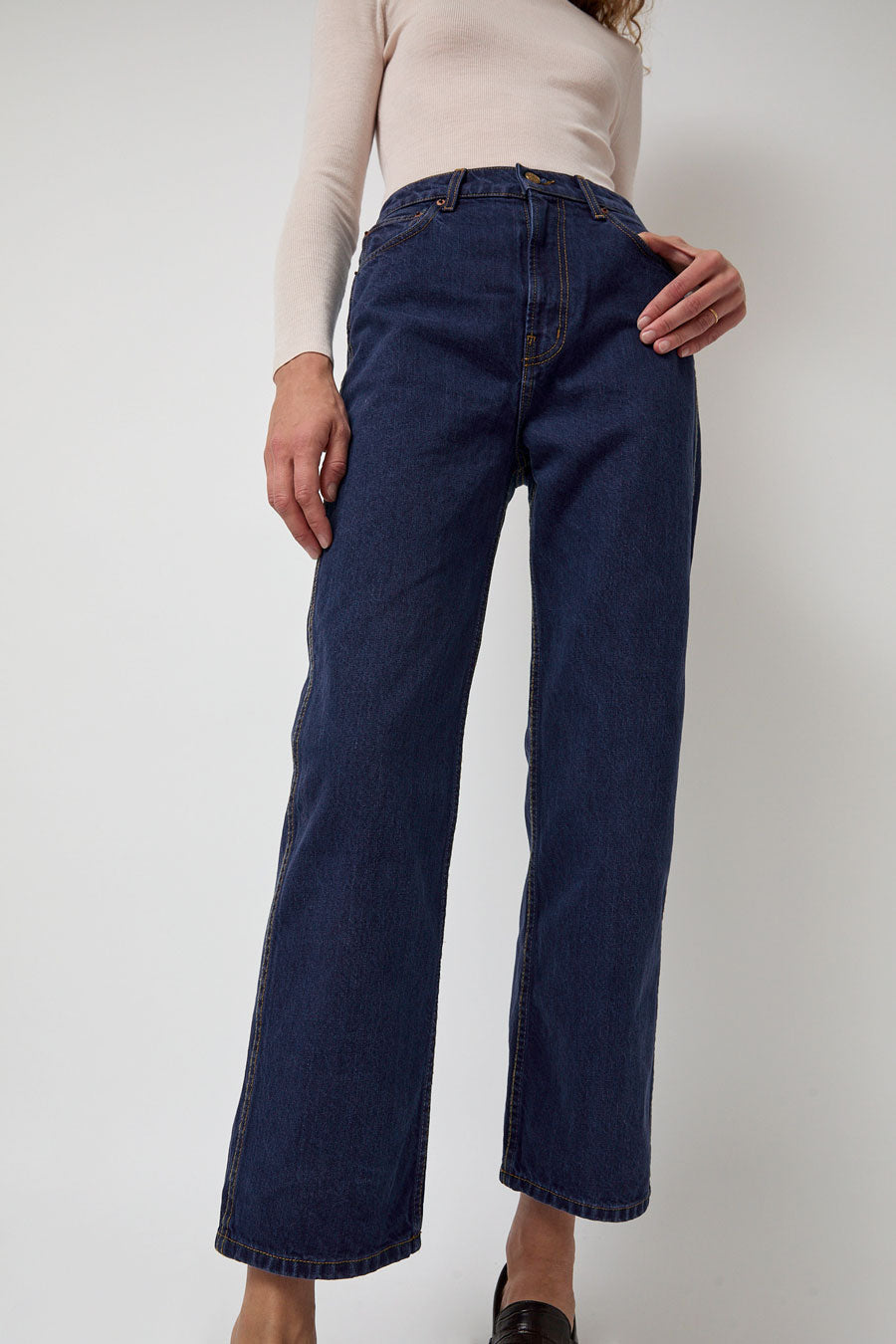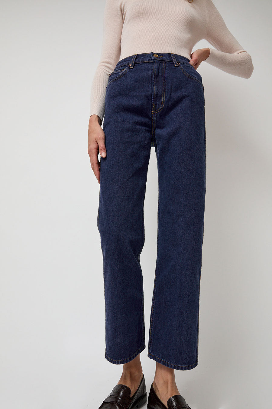 Relaxed straight-leg jean made in classic blue denim. High-waisted with side and back pockets.