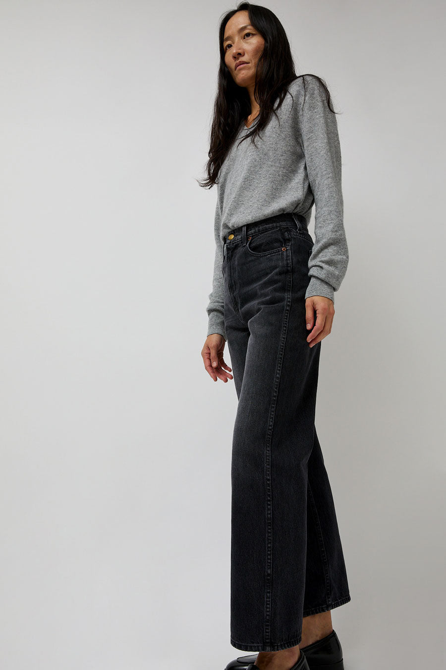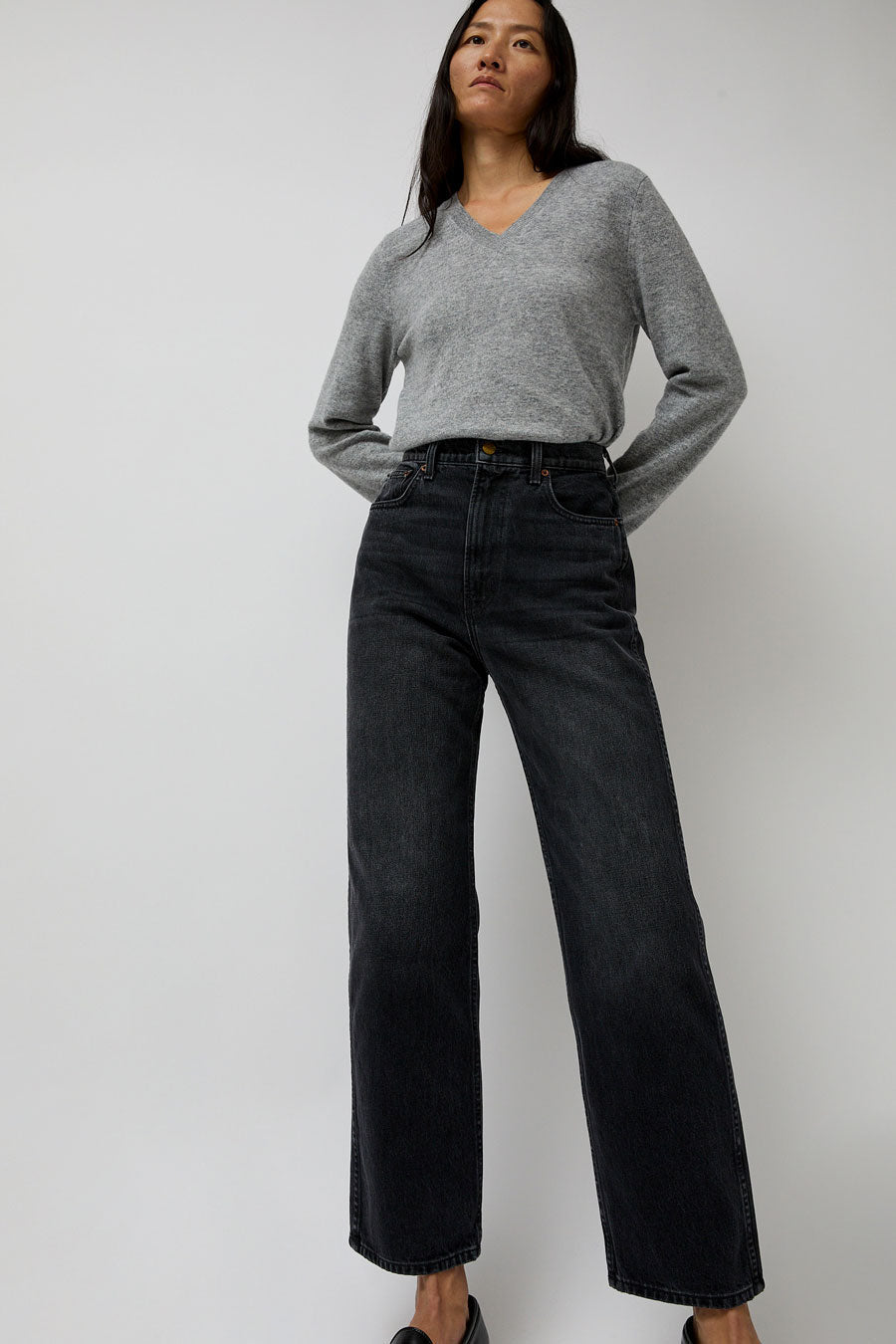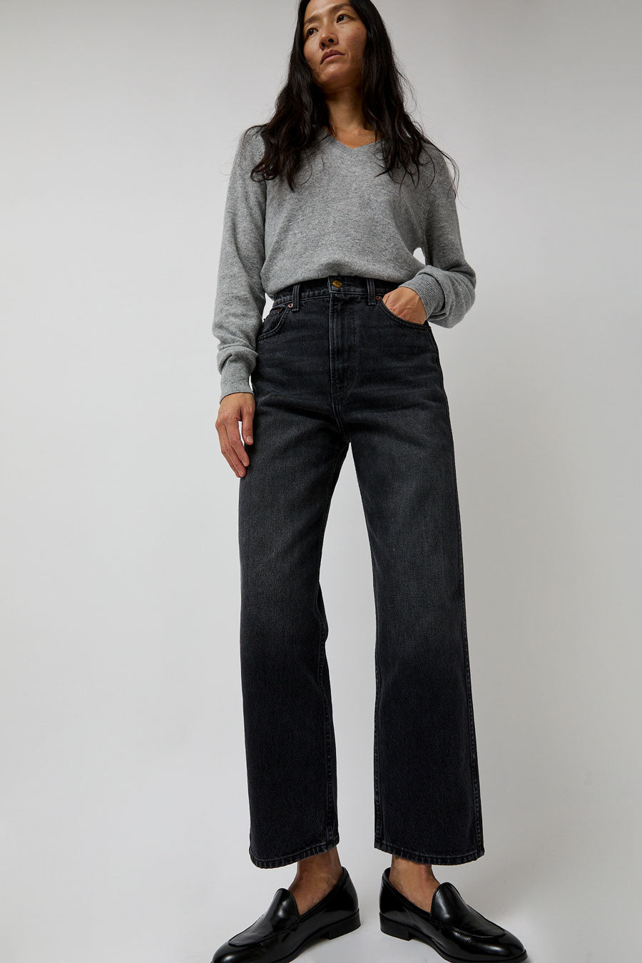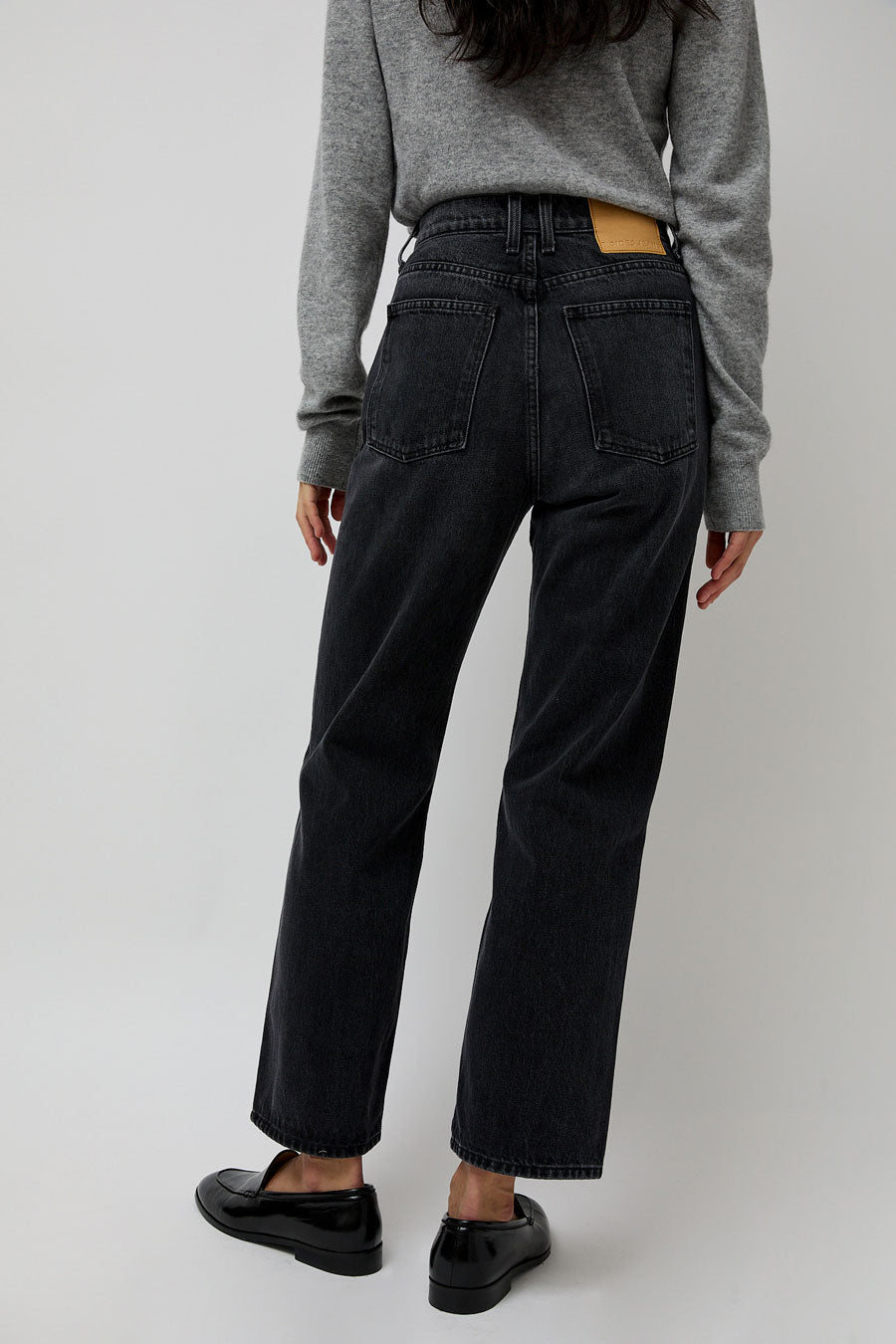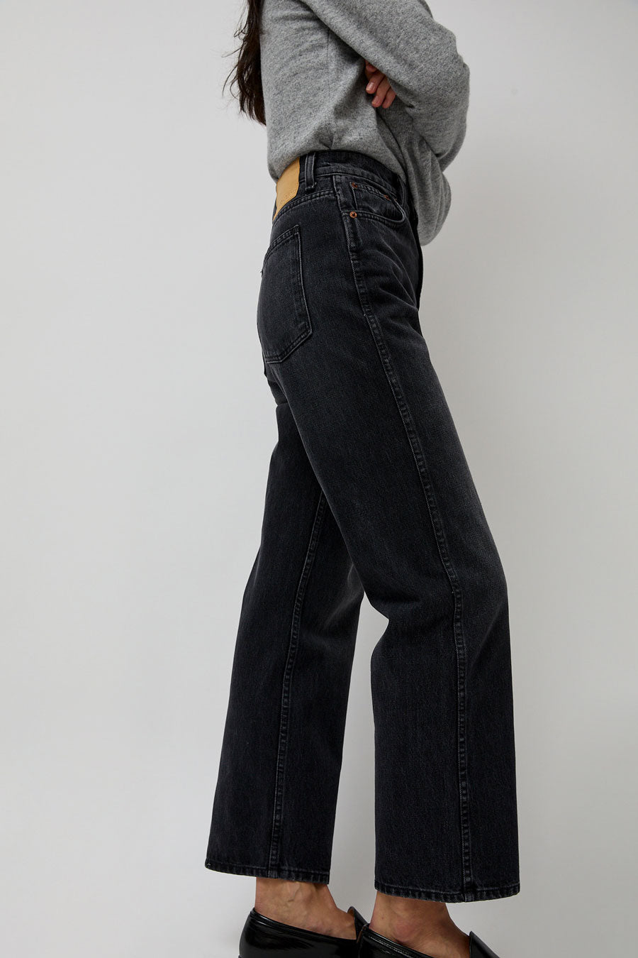 Relaxed straight leg jean made in a dark washed black denim. High-waisted with side and back pockets.