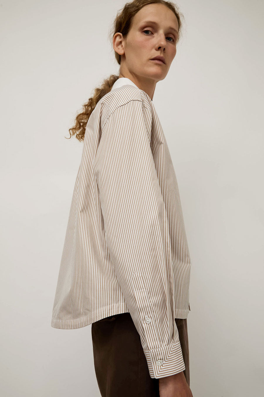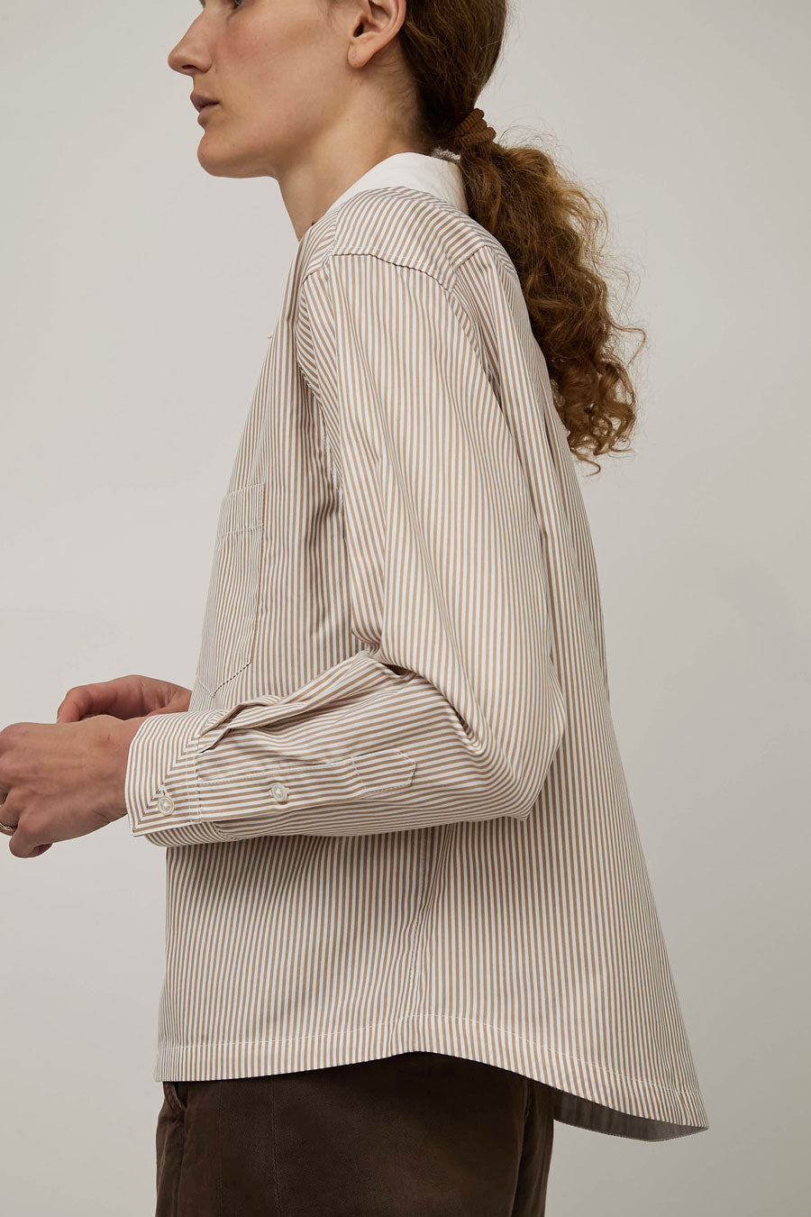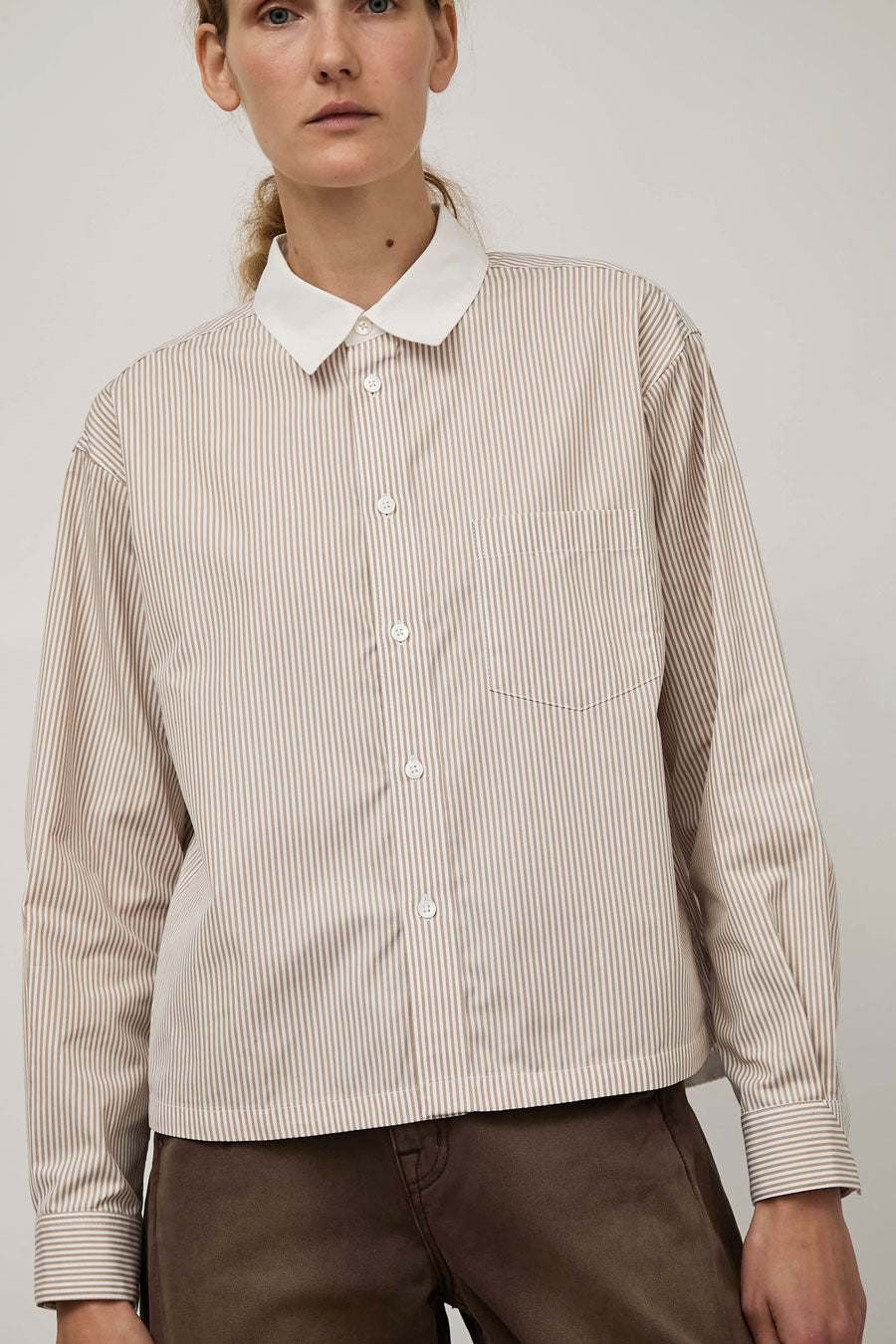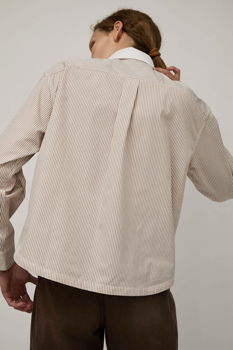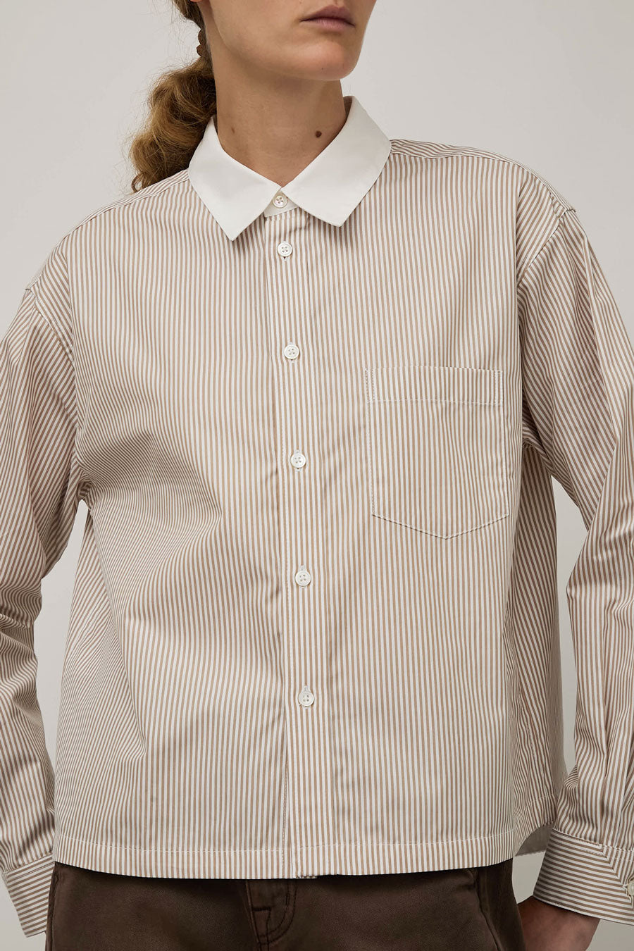 Classic menswear-inspired button-down shirt cut in striped cotton shirting. Cropped length and contrasting white collar.