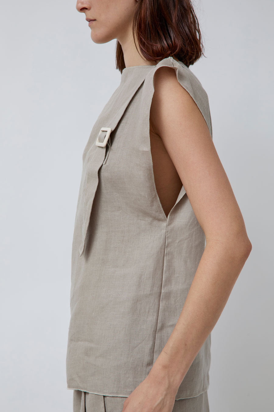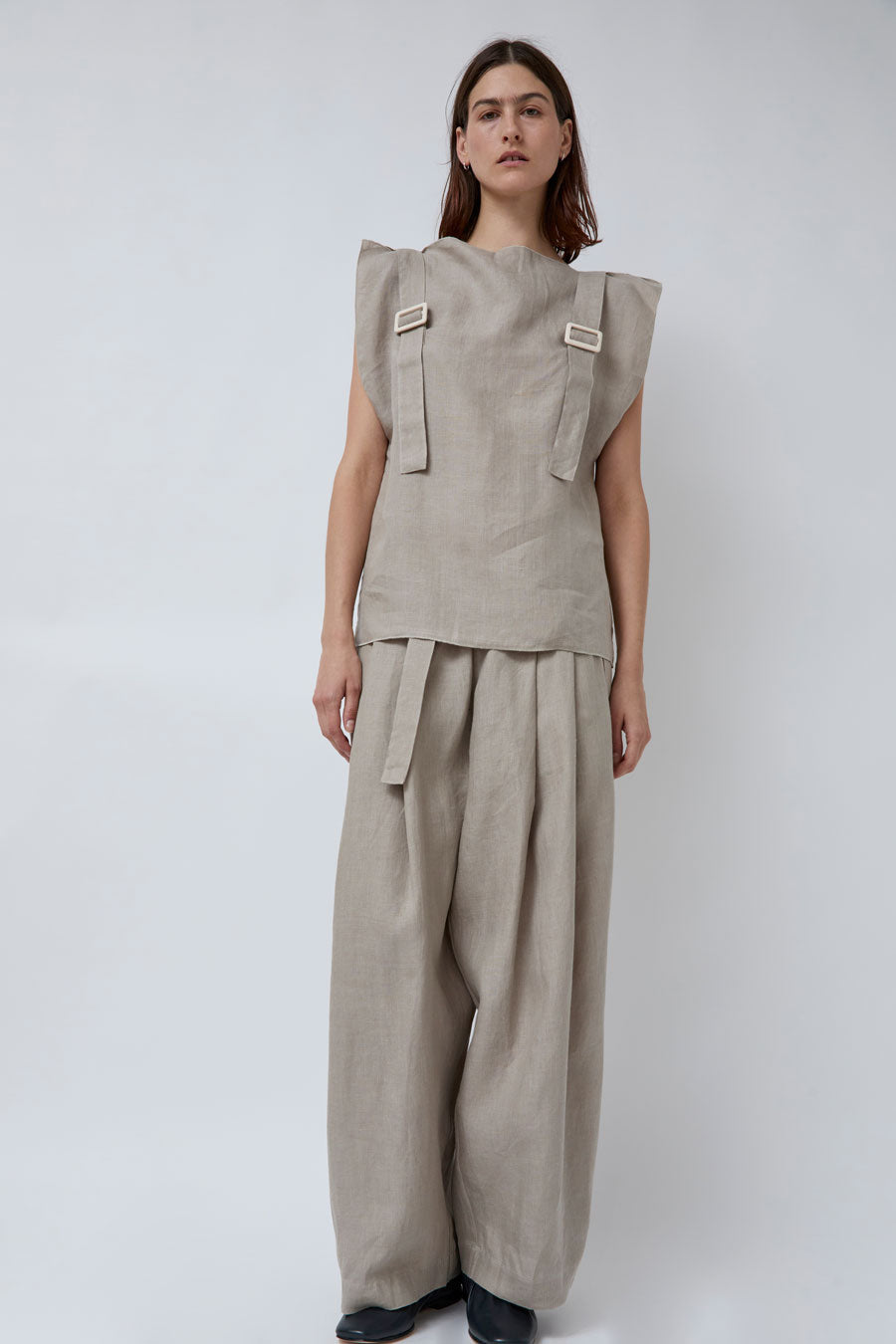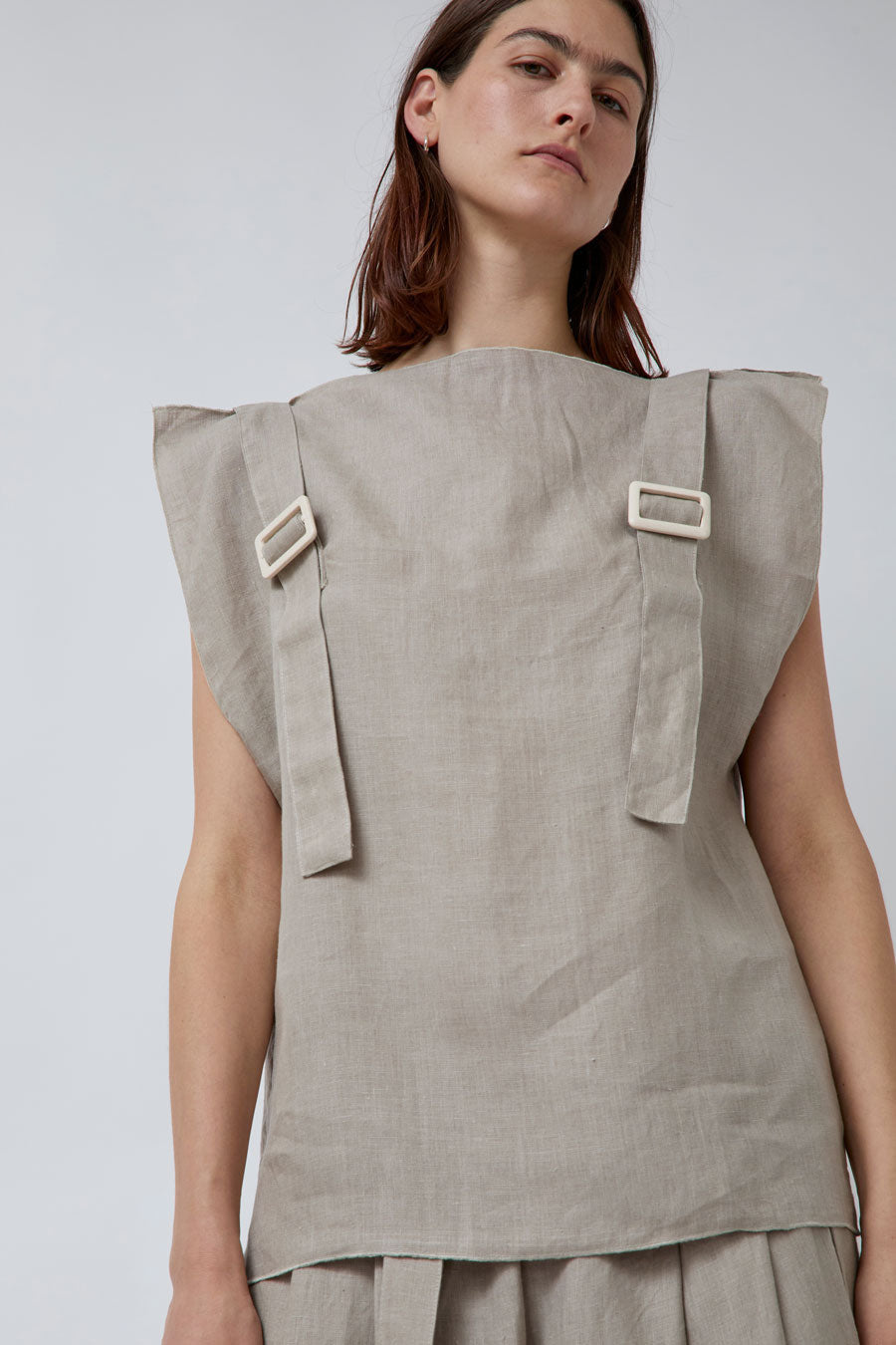 Boxy top with straight across neckline cut in 100% hemp. Flat, adjustable straps drape over the shoulder. For the full look, wear with the Baserange Frame Pants in Concrete.