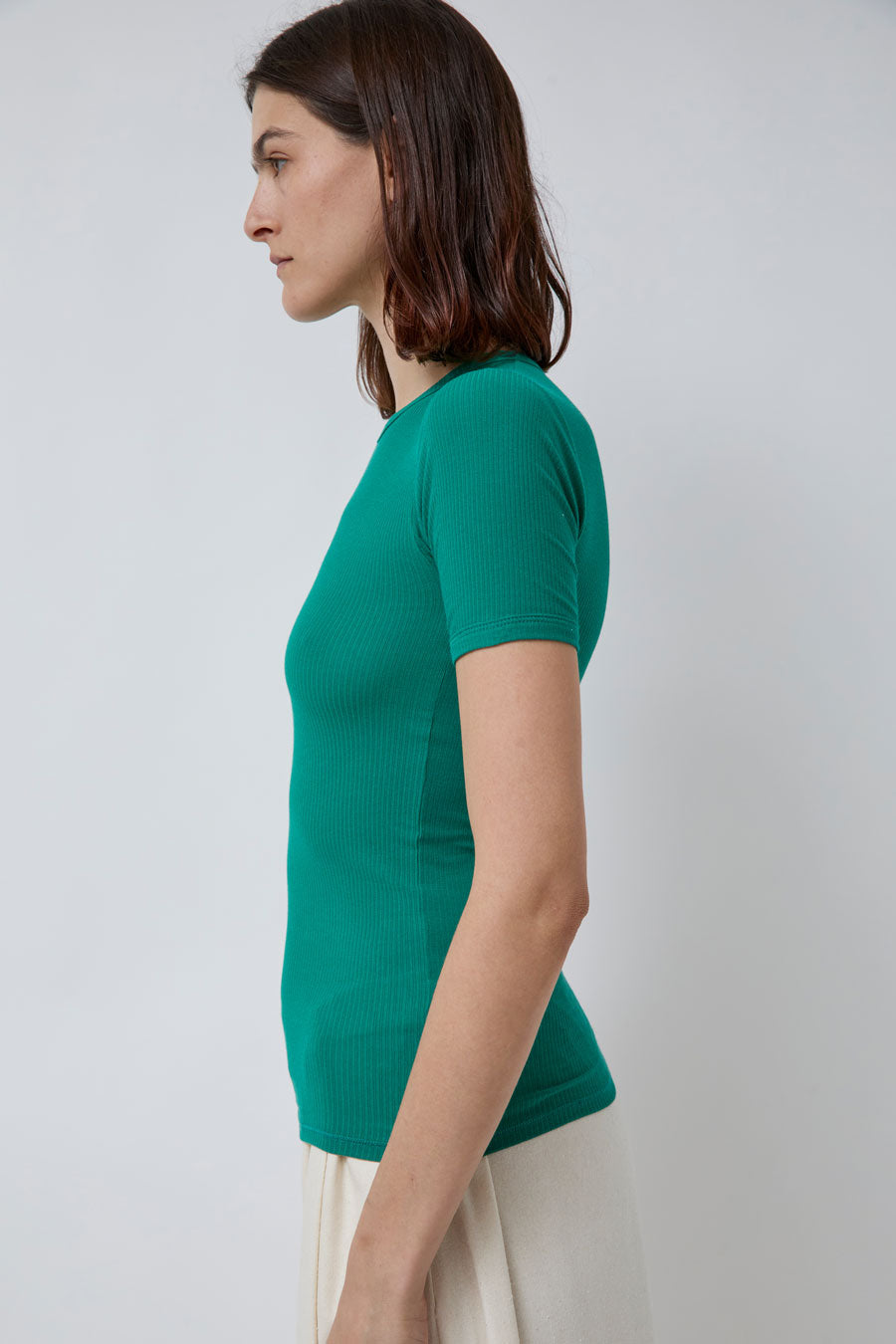 Slim fit ribbed organic cotton t-shirt with crew neckline. Features a darling heart shaped cutout at the front.