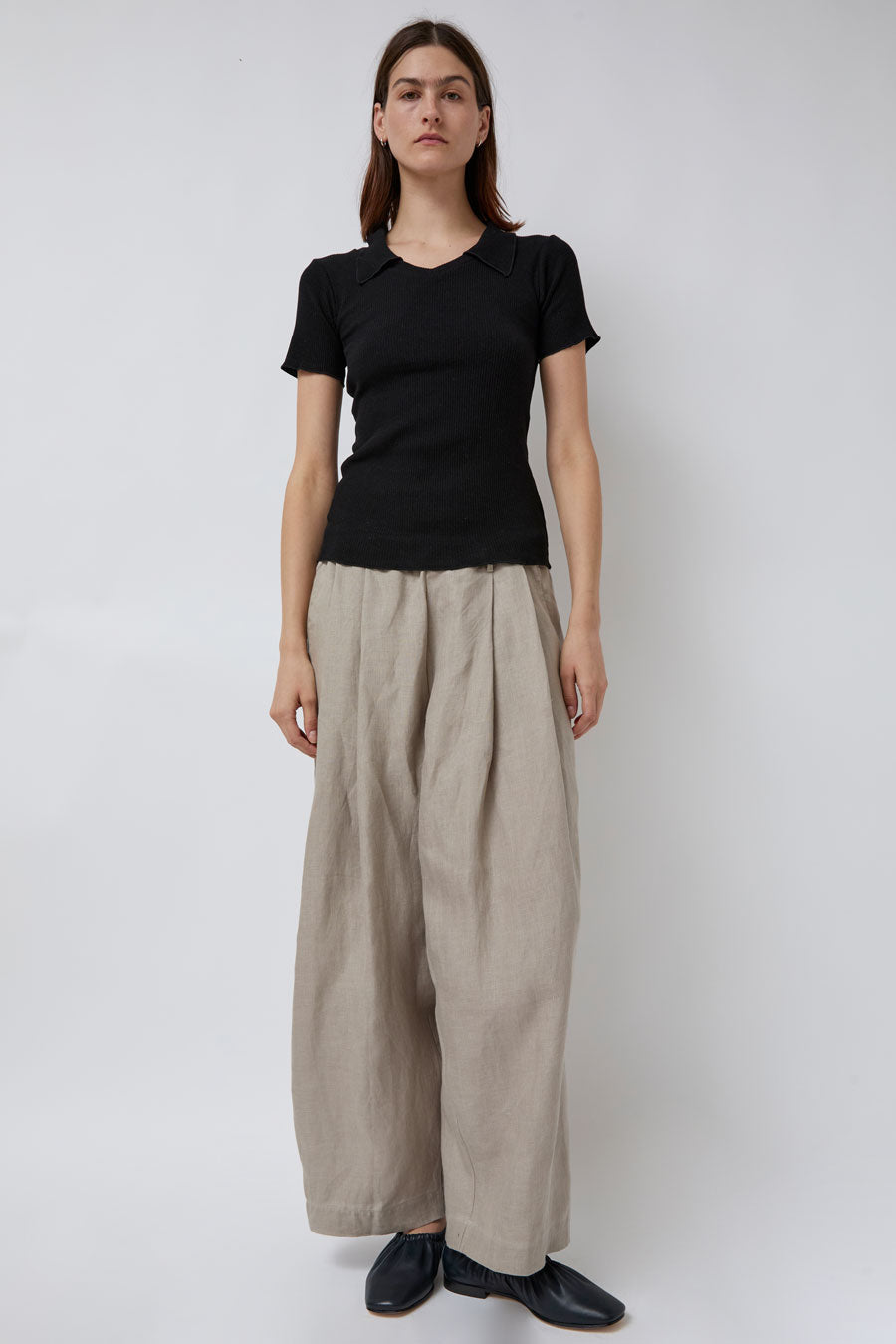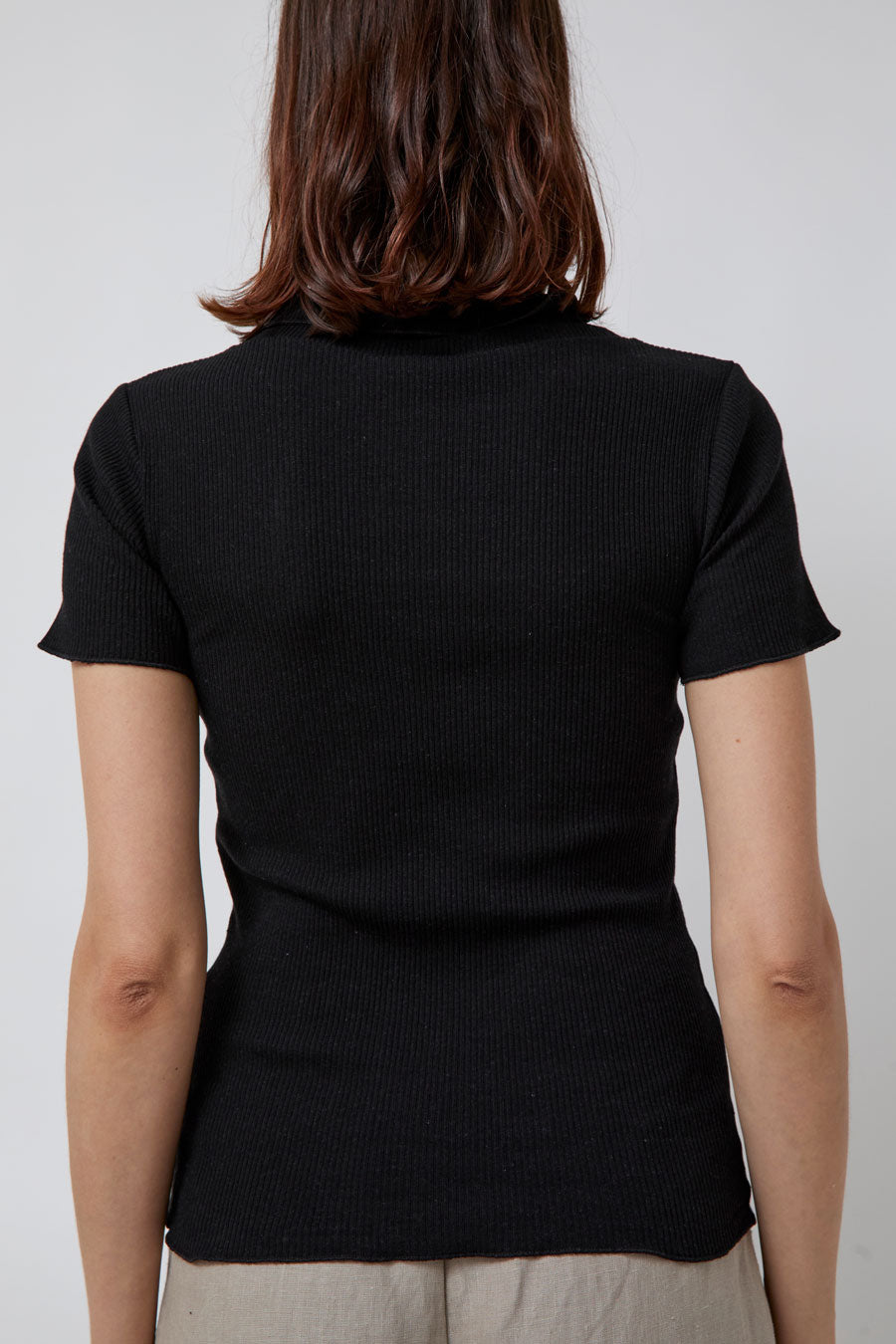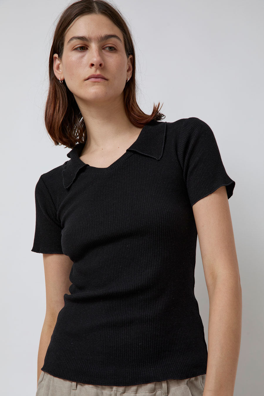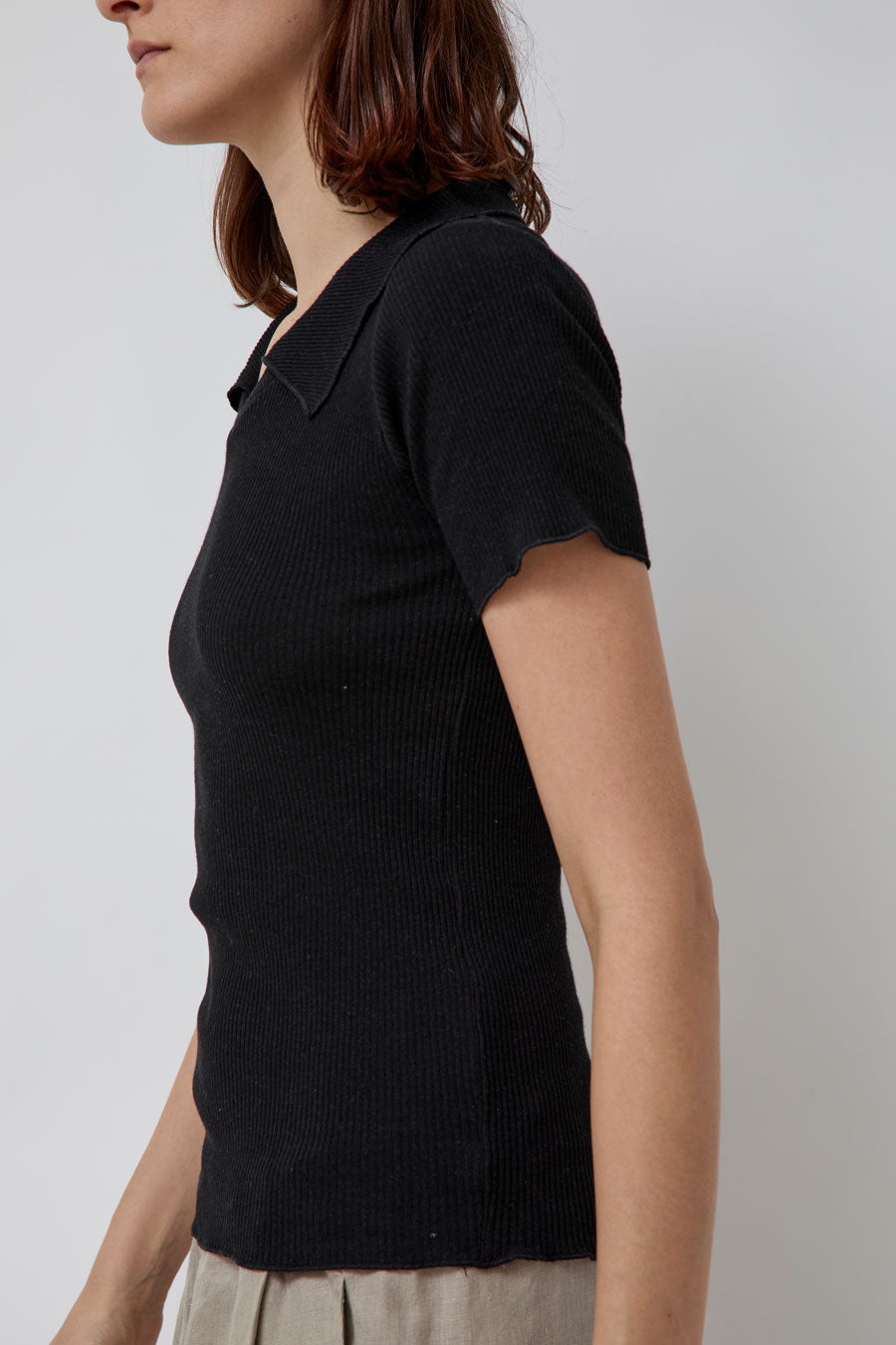 Slim fit ribbed top cut in recycled cotton. V neckline with collar. Lettuce edge detailing.