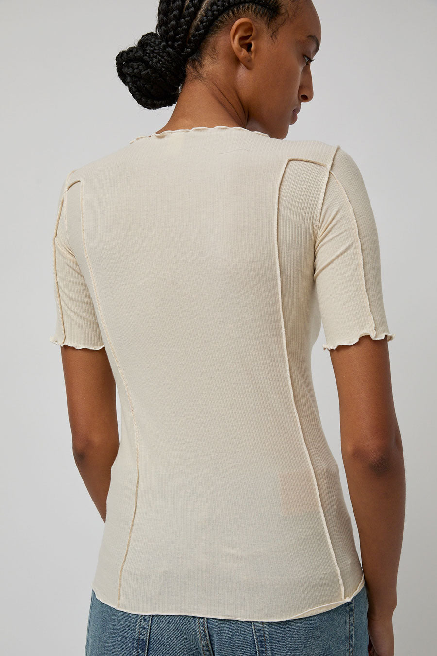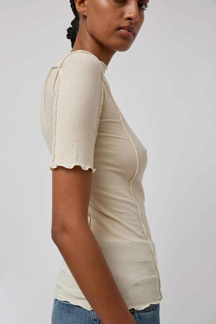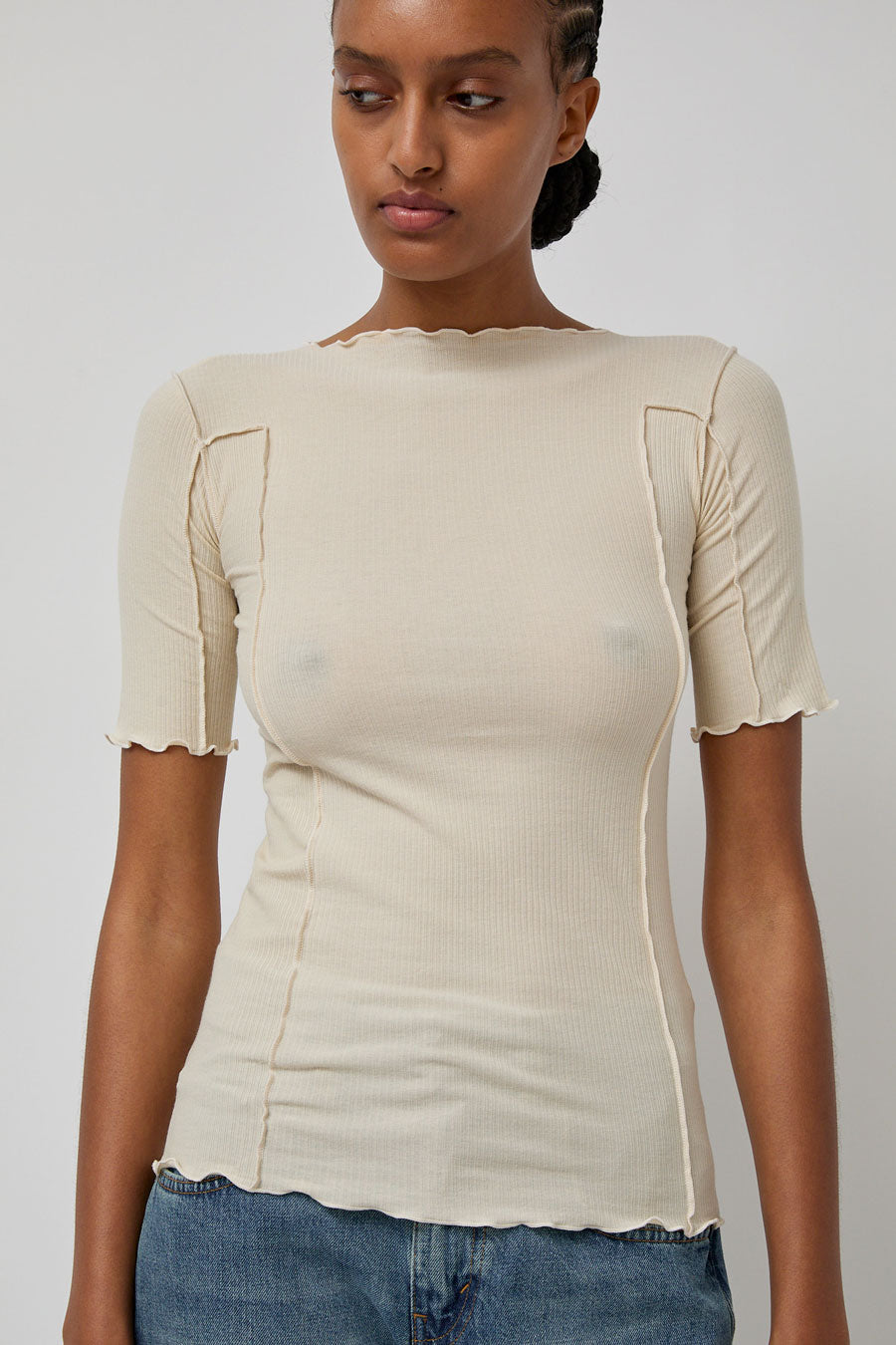 Semi-sheer ribbed short sleeve top with boat neck and contrasting baby lock finishes. Soft, stretchy organic cotton. Form fitting, ideal for layering.