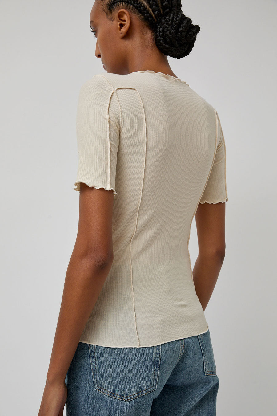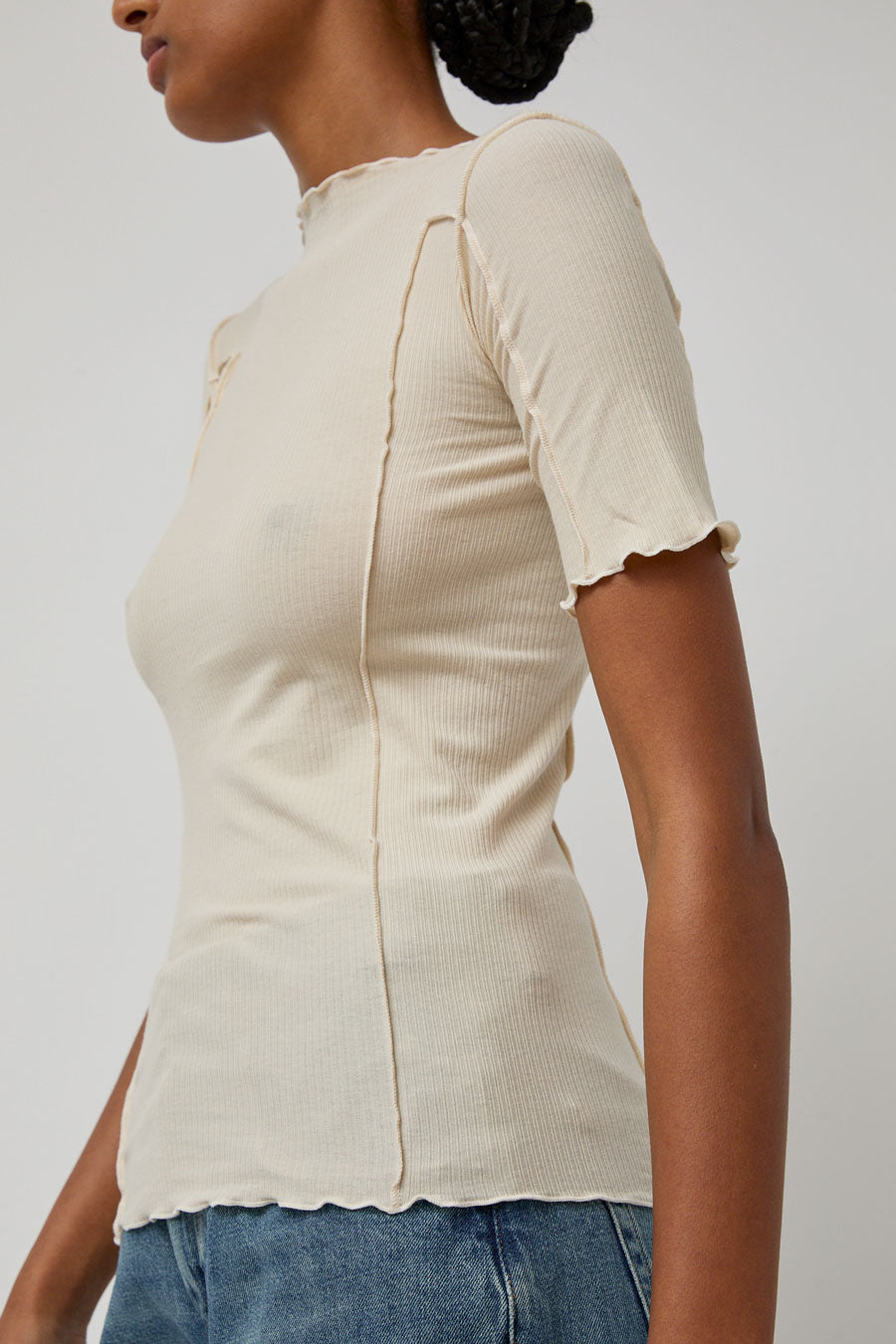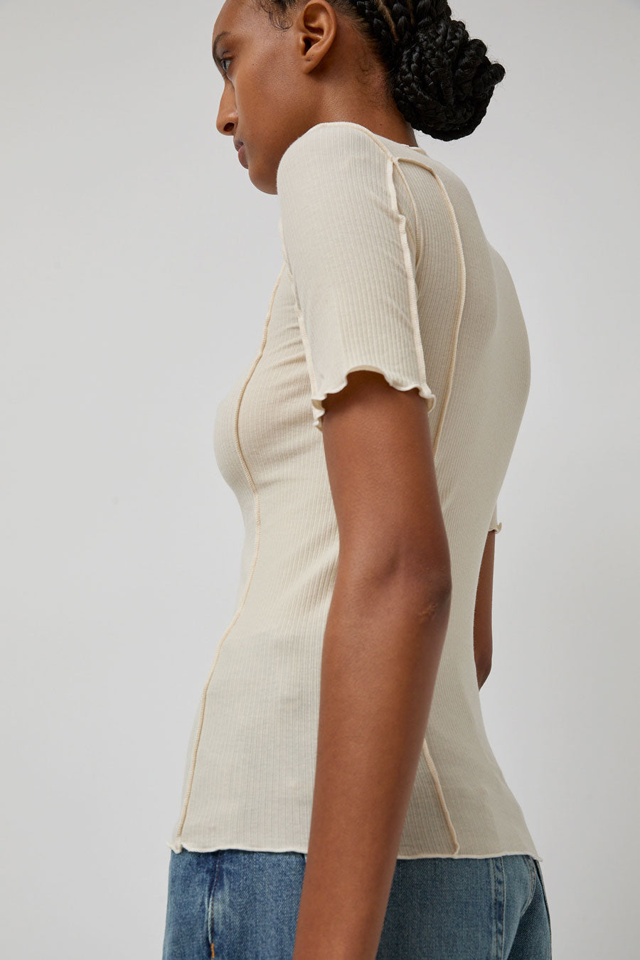 Semi-sheer ribbed short sleeve top with boat neck and contrasting baby lock finishes. Soft, stretchy organic cotton. Form fitting, ideal for layering.