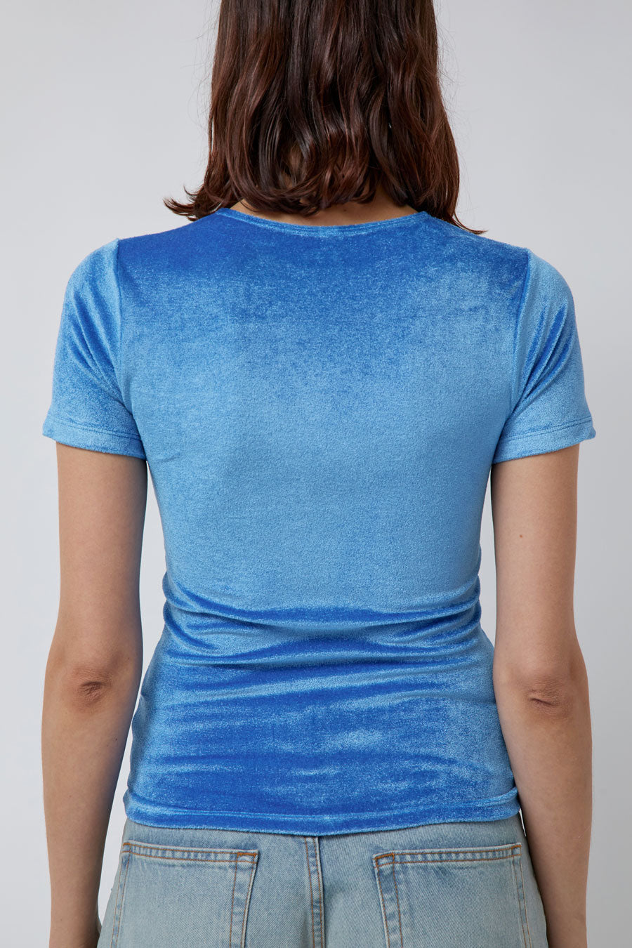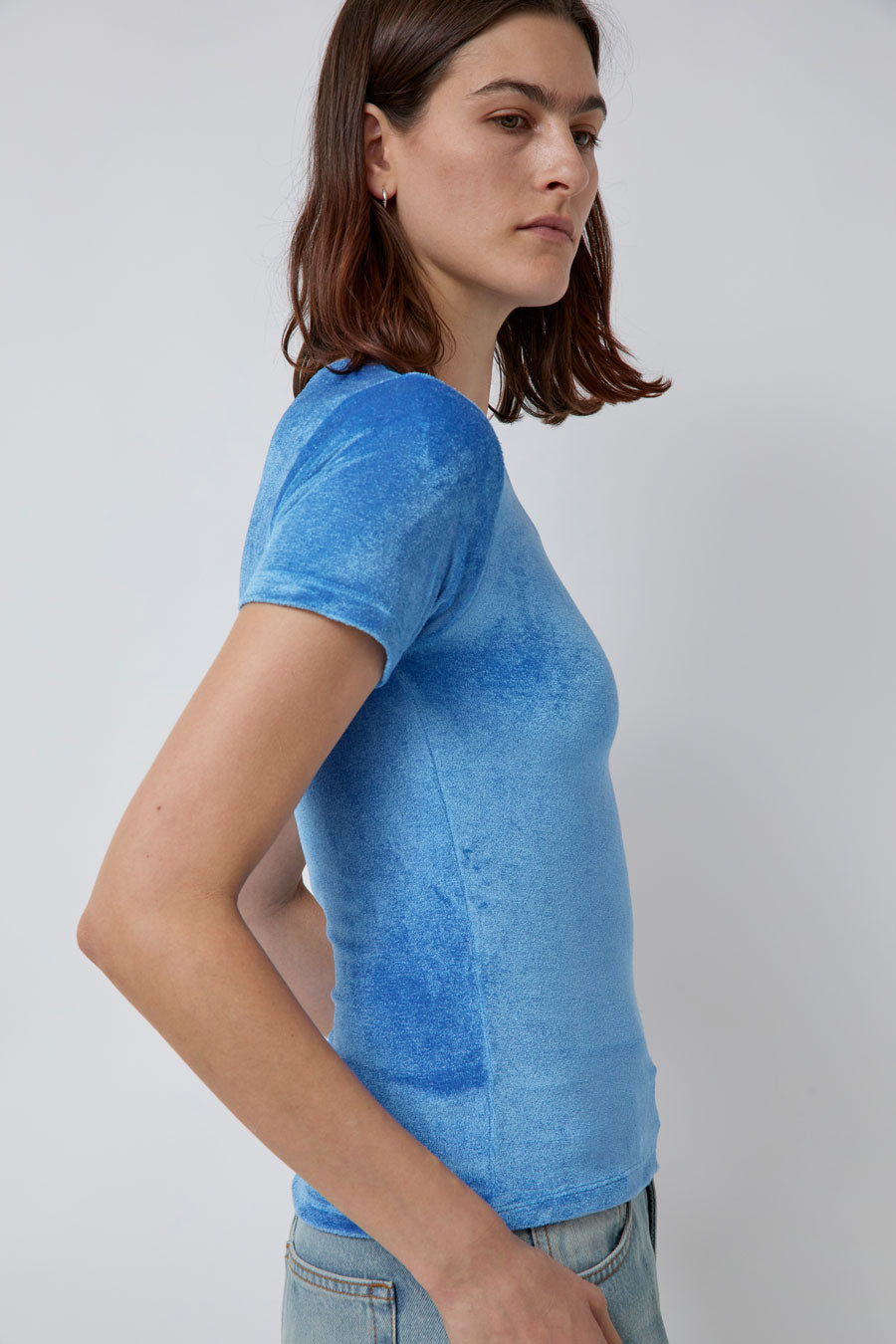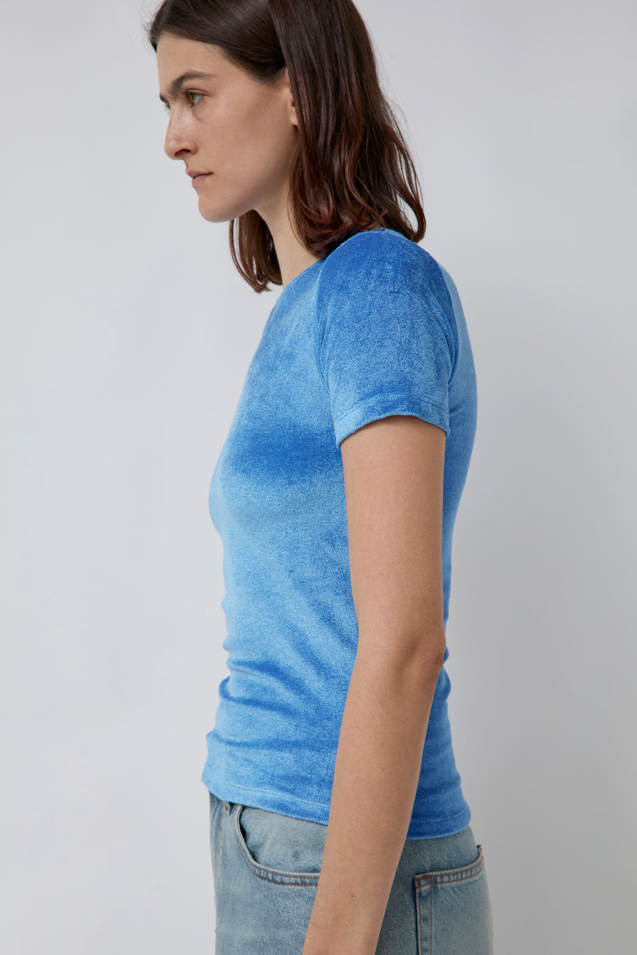 Slim fit velour t-shirt. Short sleeves, crew neckline, and hem long enough to tuck. Just the right amount of stretch.