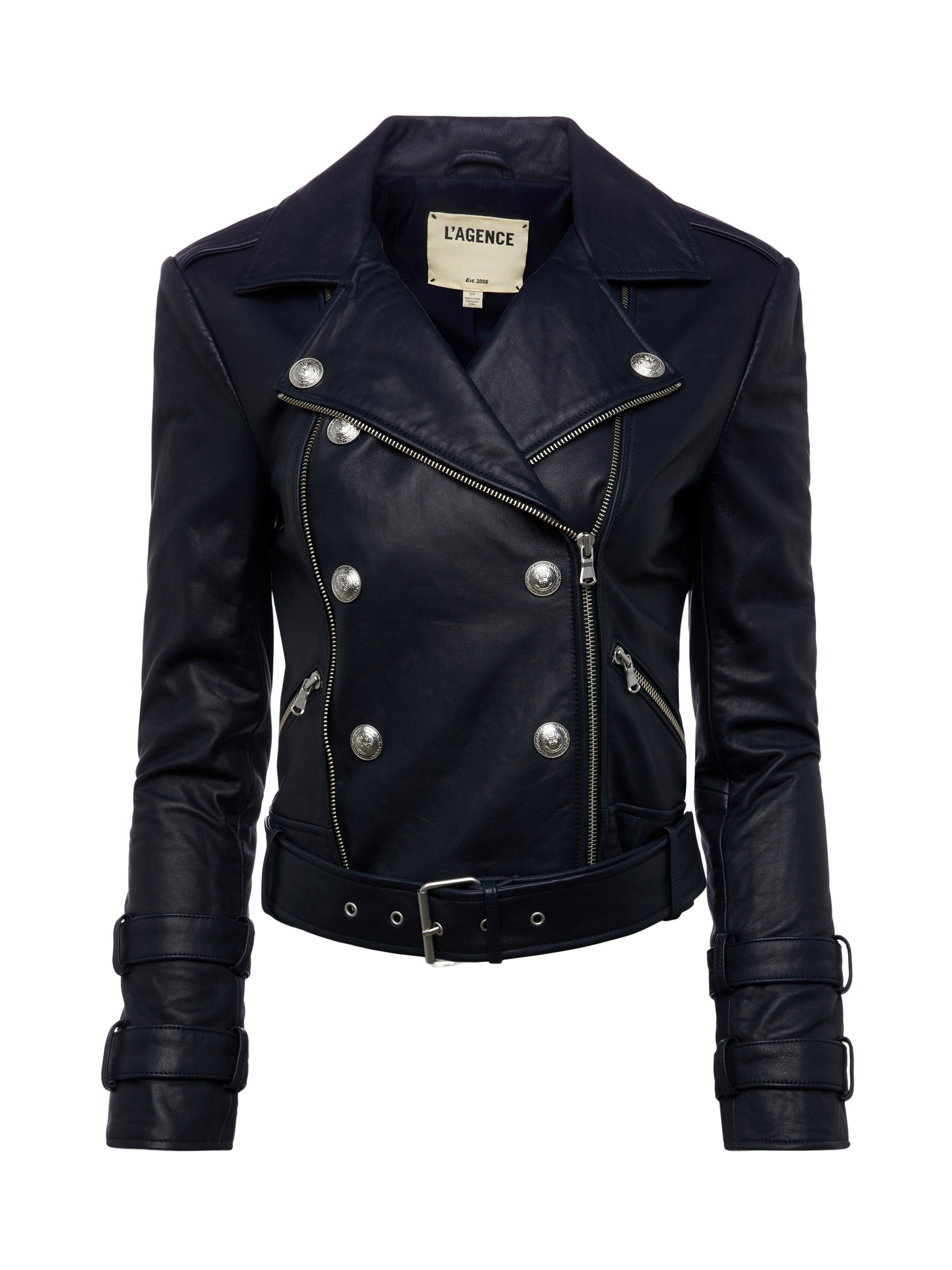 A biker-style blue leather jacket elevated by embossed silvertone buttons. Edgy-authentic details include an attached leather belt, zipper pockets and zipper trim, sleeve straps, and chunky belt with buckle. Fully lined. 100% Lambskin.