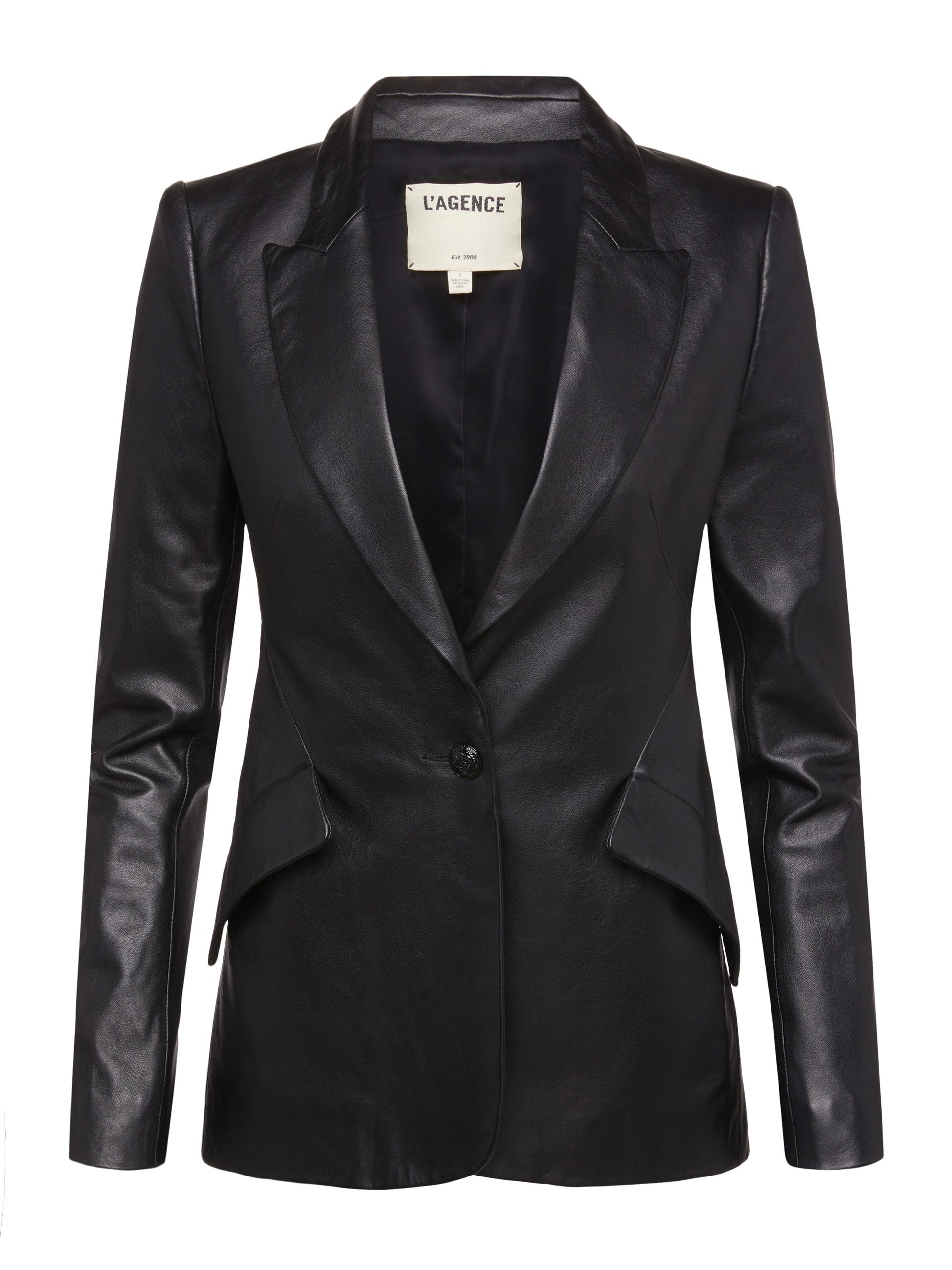 An exquisite single-breasted blazer in supple black leather. The chic design is defined by strong shoulders, sartorial peaked lapels, angled flap pockets, and expertly handled seaming that accentuates the hourglass shape. The bespoke statement look fastens in front with a single embossed tonal button. Fully lined. 100% Leather.