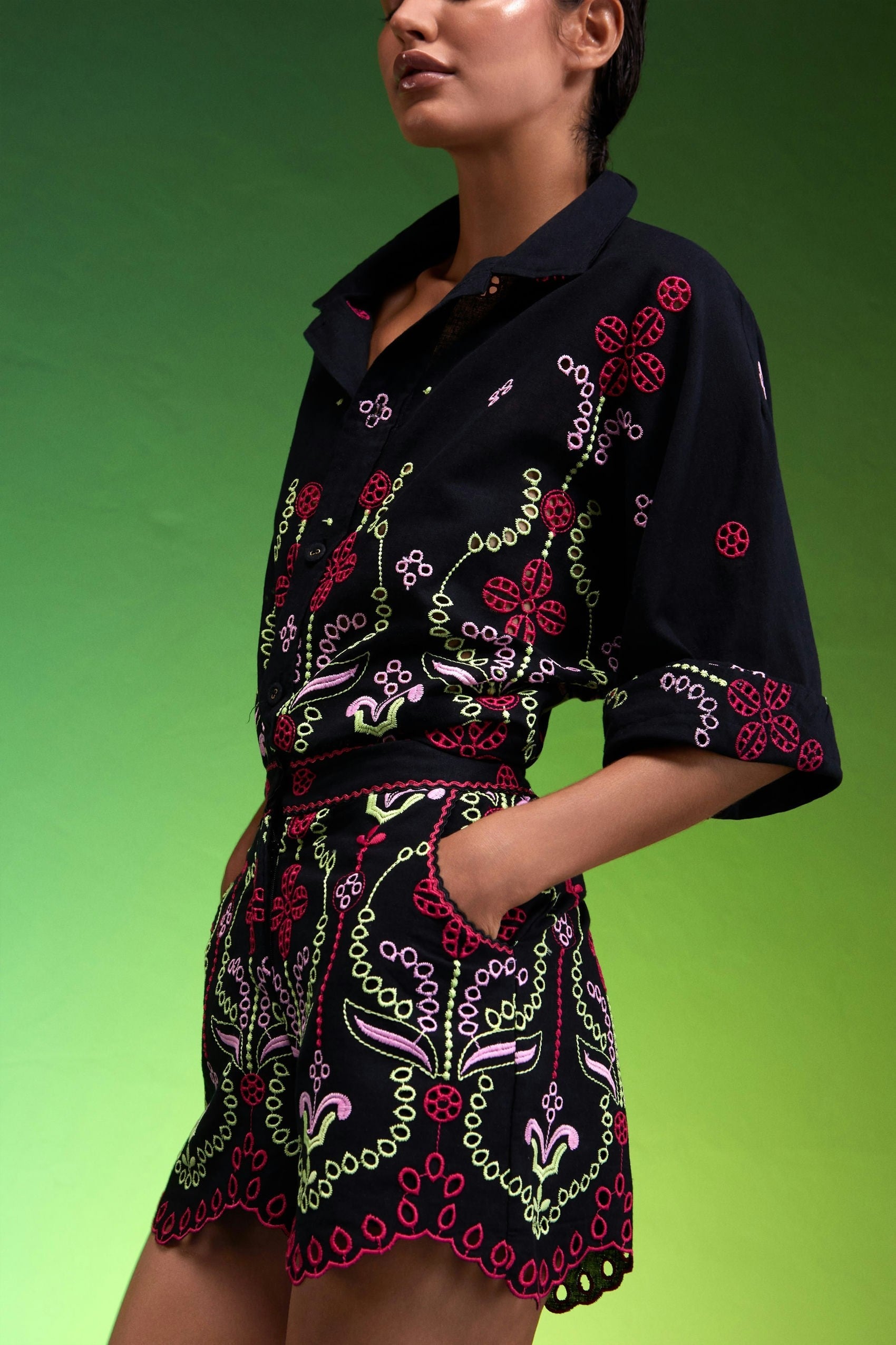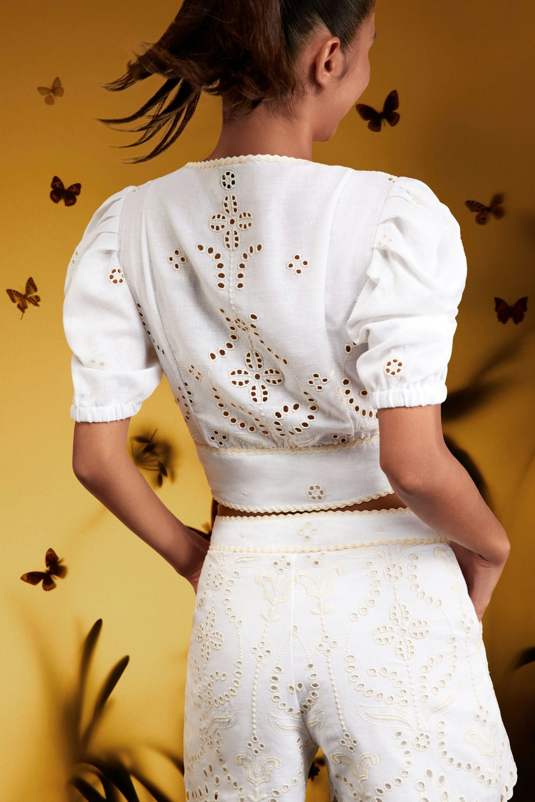 The Mason shorts combine delicacy with comfort thanks to their soft lines and scalloped finishes. Crafted in embroidered and emplaced linen, this piece elevates any look.