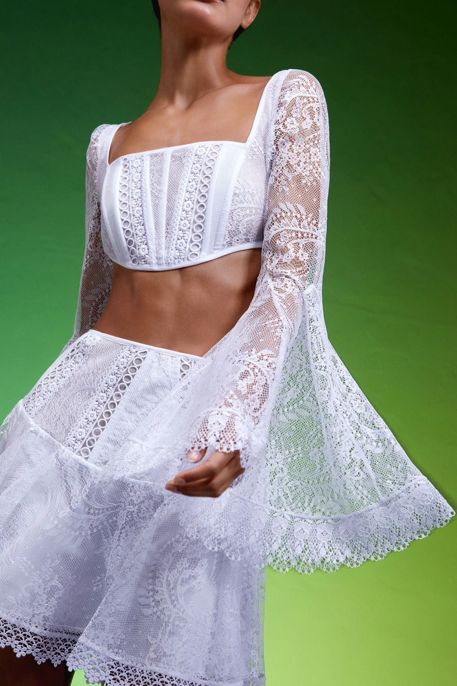 The feminine silhouette of our Thea mini skirt is perfect for this season. Its semi-transparent paneled yoke adds shape and its bottom creates delicate movement. The piece is crafted in a beautiful combination of lace, guipure and voile.