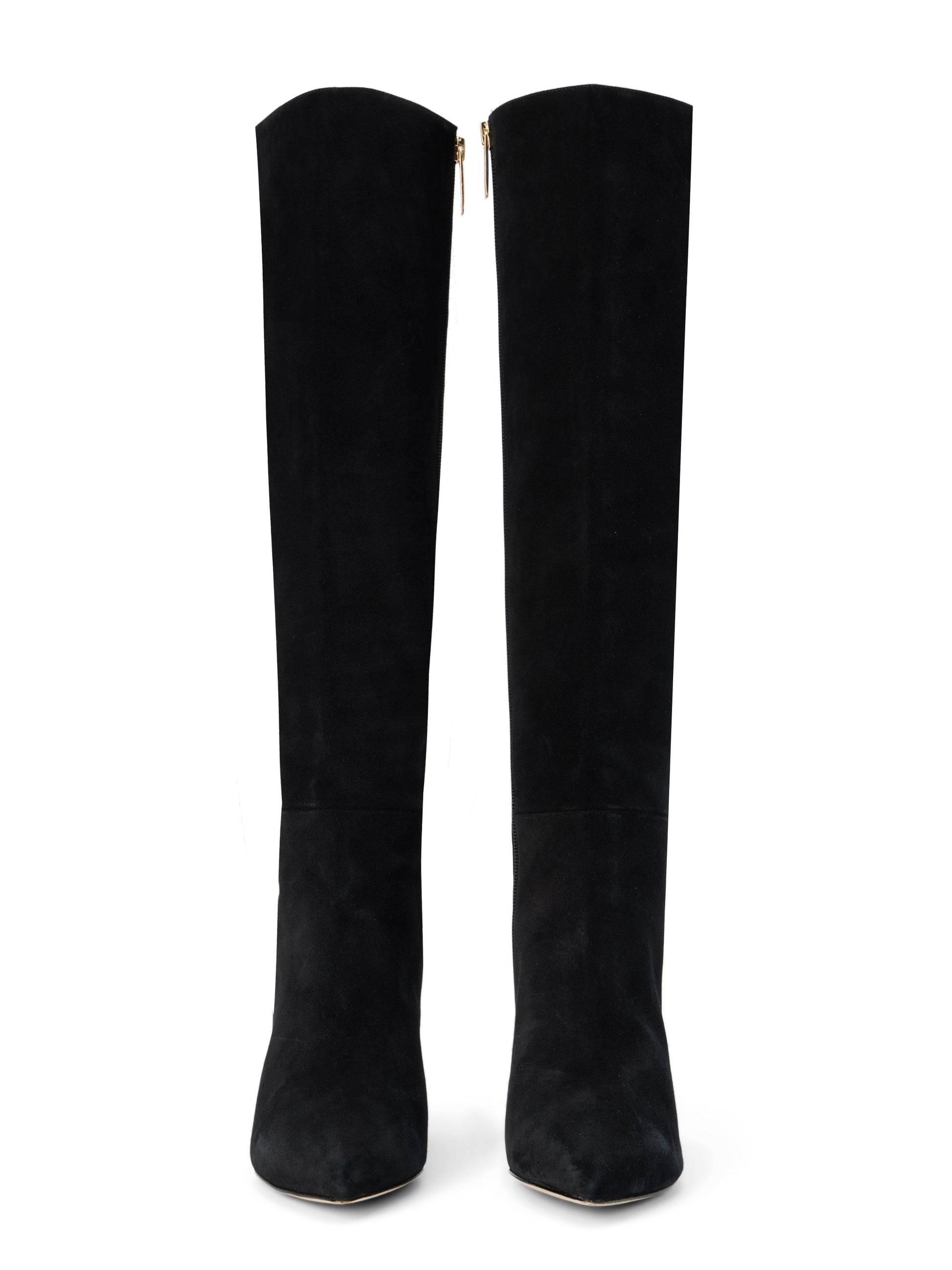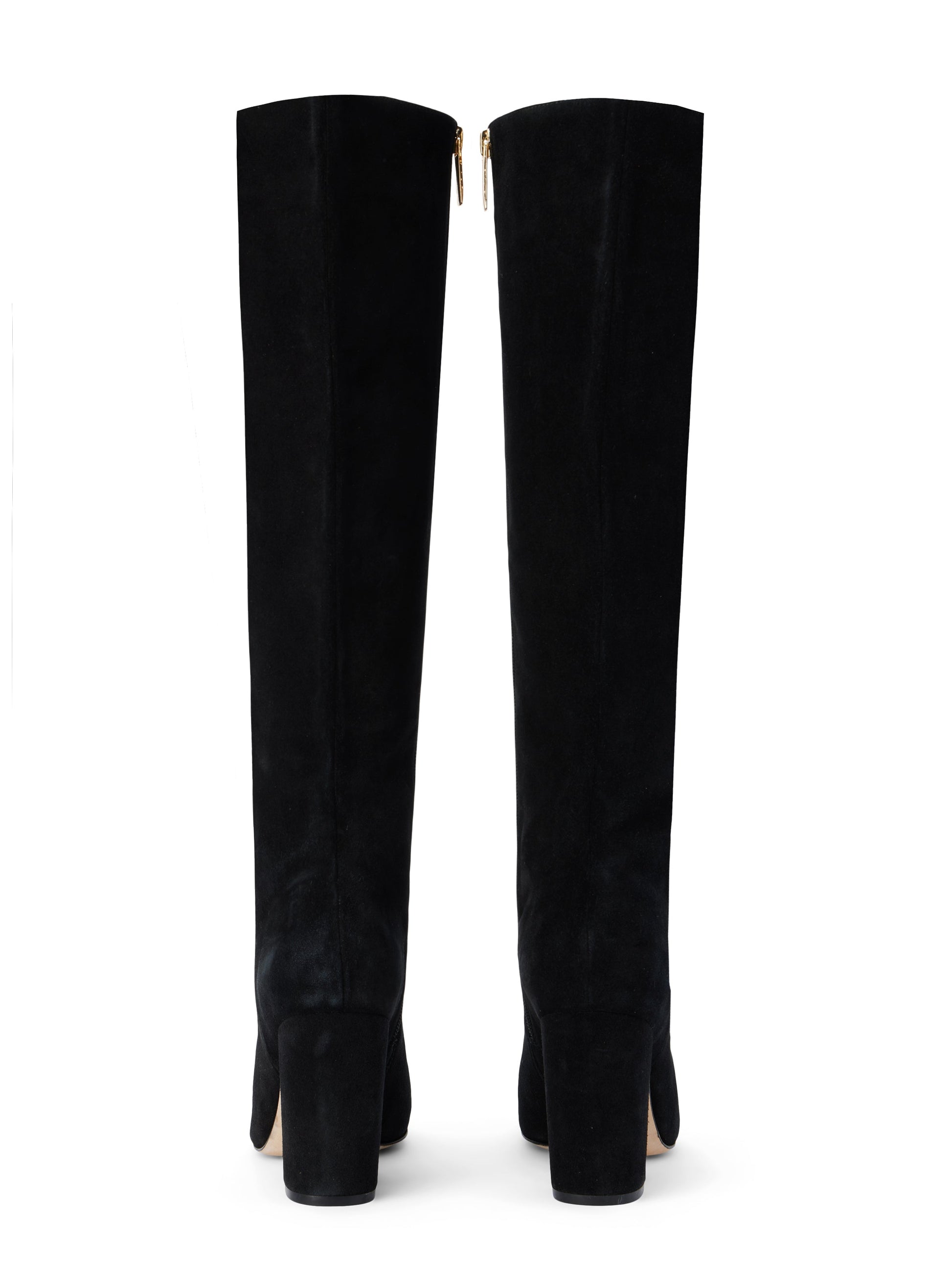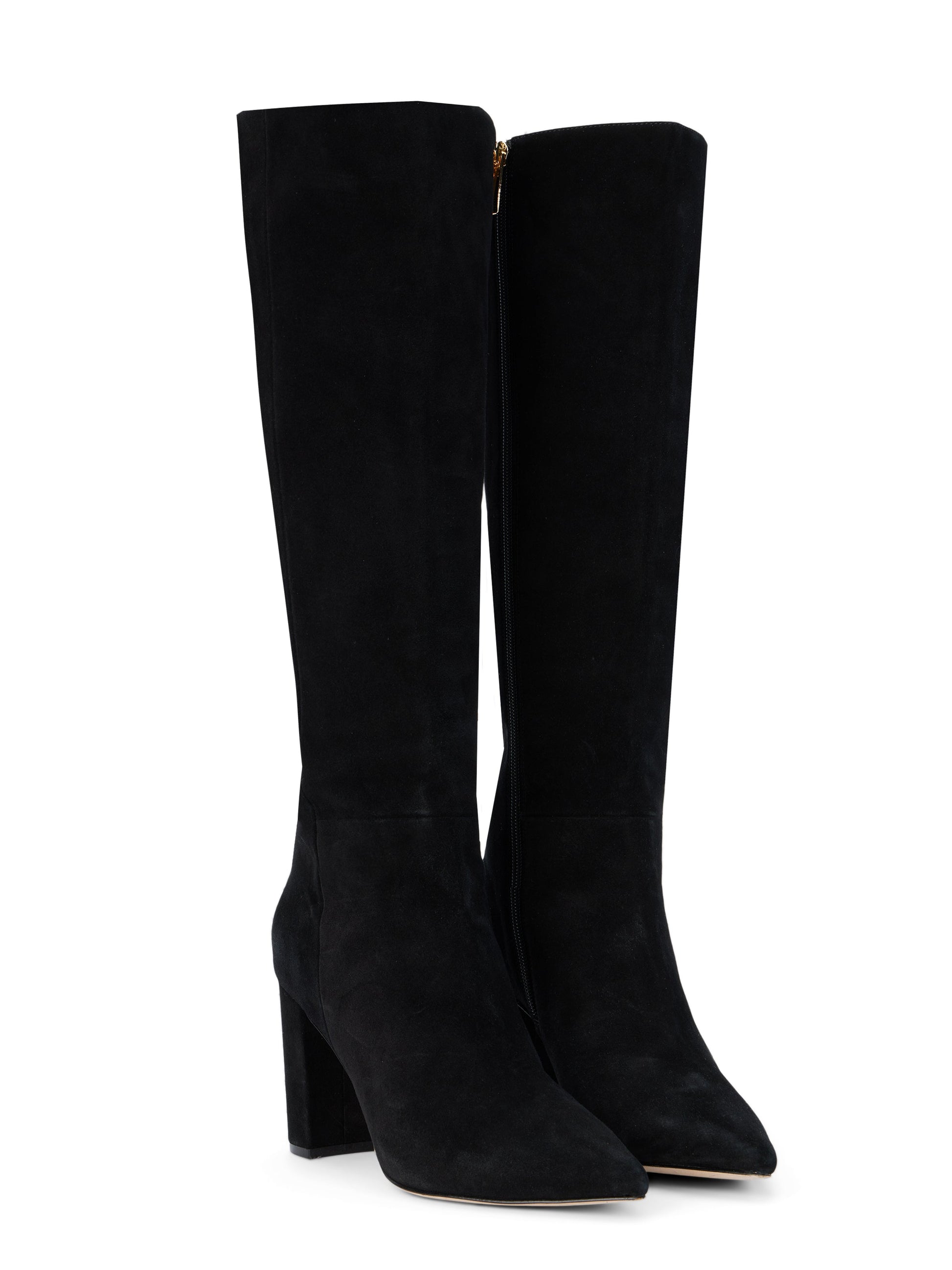 The quintessential knee-high pointed-toe boot in black suede. Impeccably crafted suede molds to flatter the foot and calf in an elegant, timeless silhouette. Wearable block high heel is ultra-versatile, pairing effortlessly with denim, leggings or skirts. Zip closure. 100% Suede.