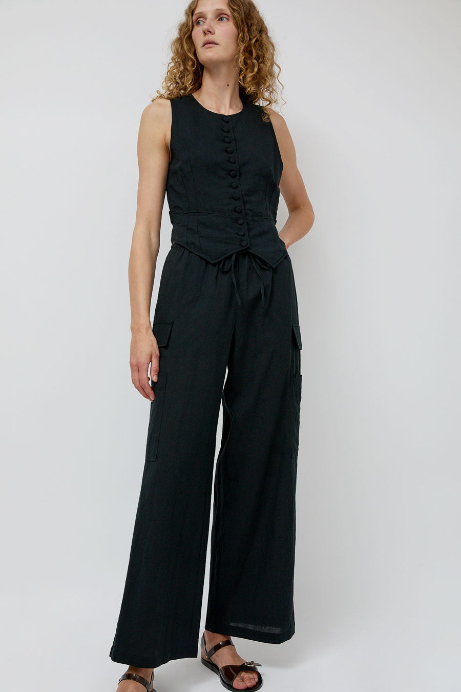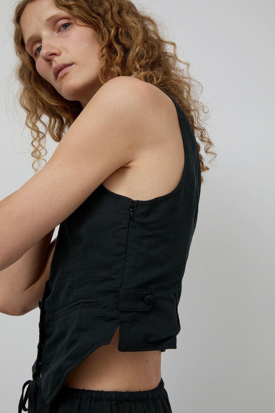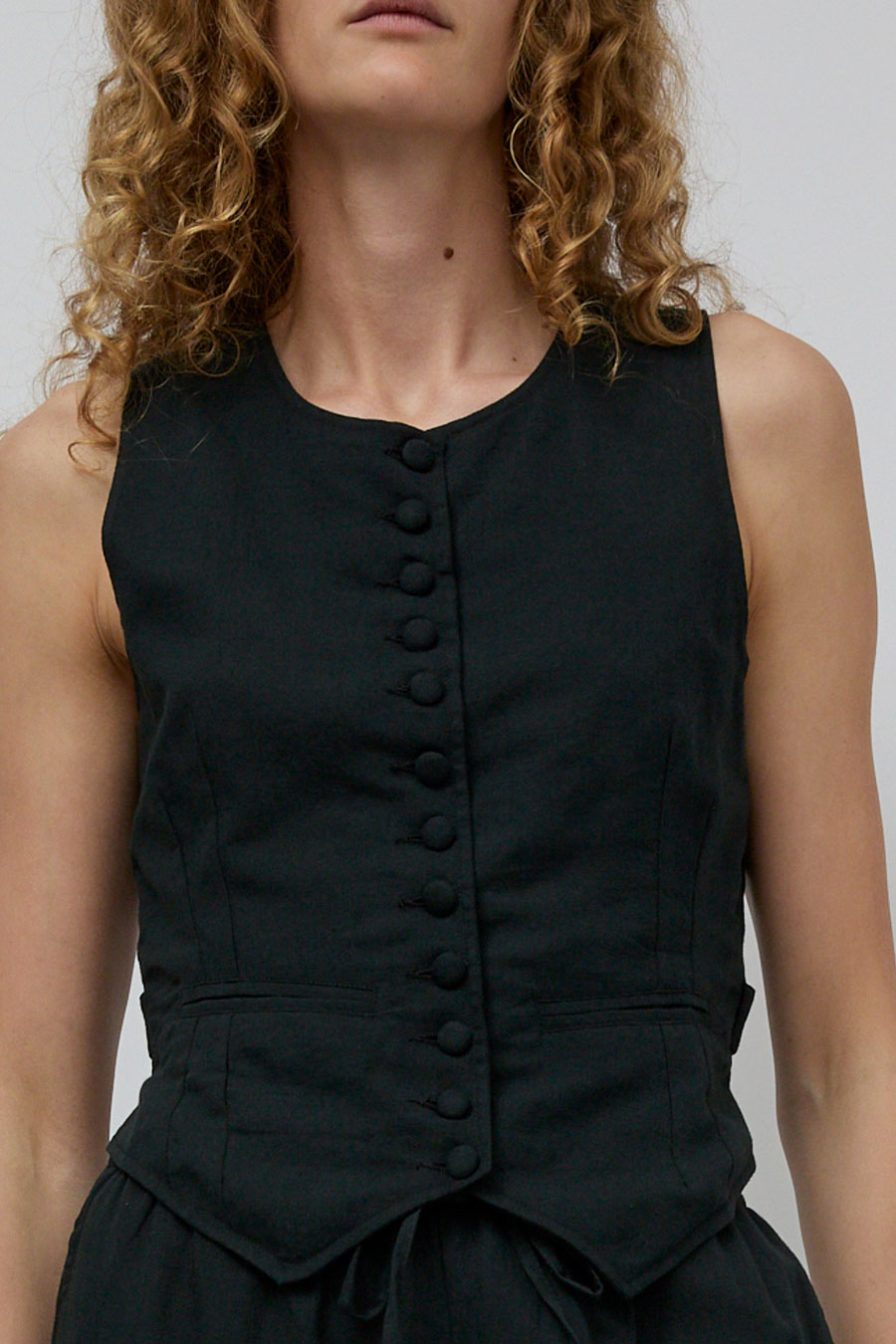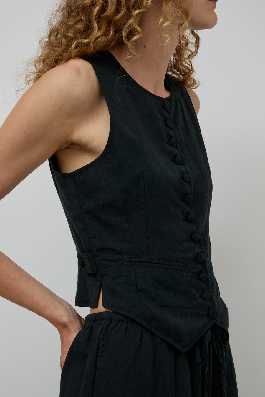 Sleeveless linen and cotton blend top with button front and side zip closure. Waistcoat style welt pockets and notched hem.