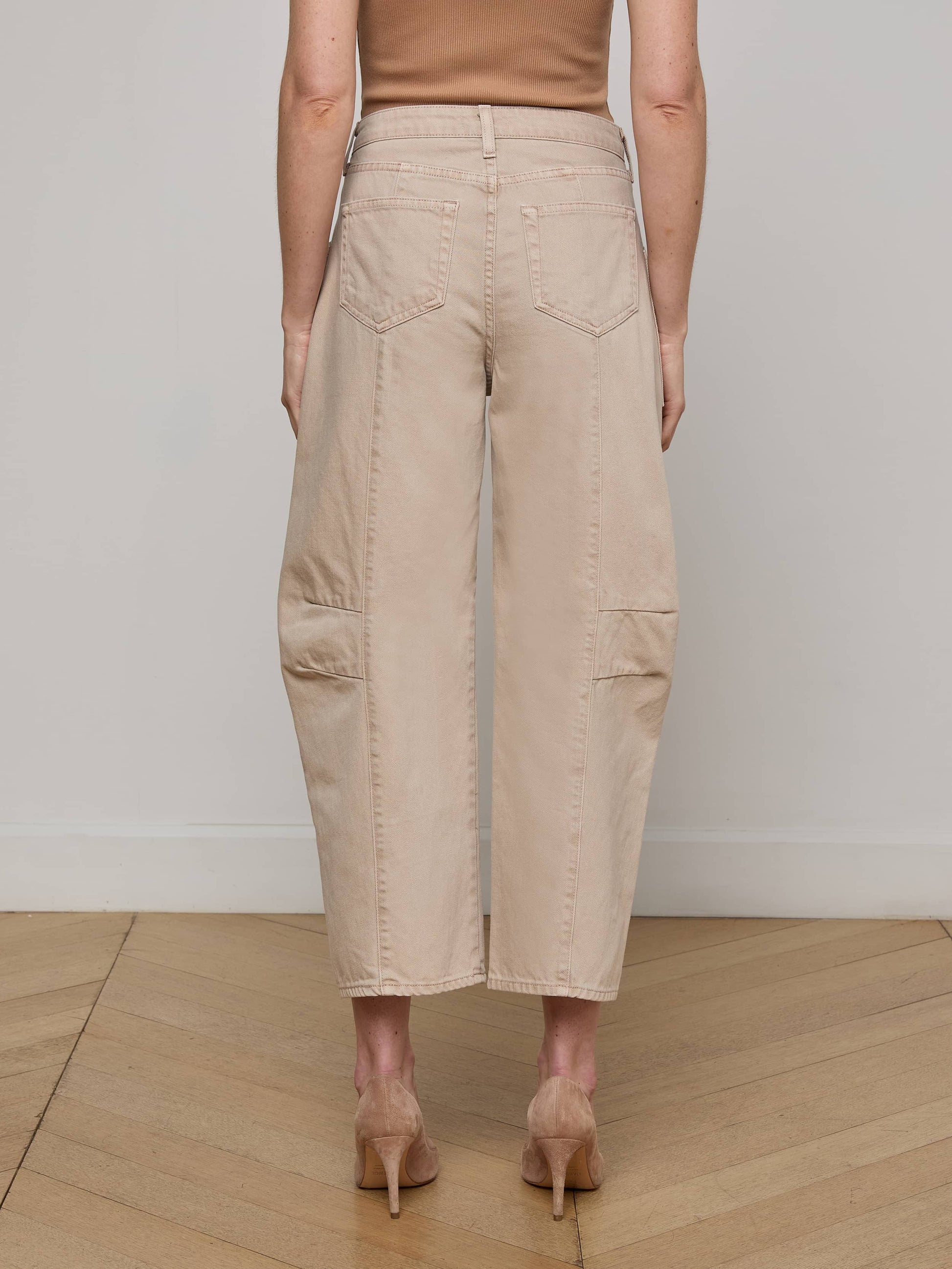 Constructed with a cool slouch fit and novel patch pockets, our cropped barrel-leg jean is back in a neutral tan.