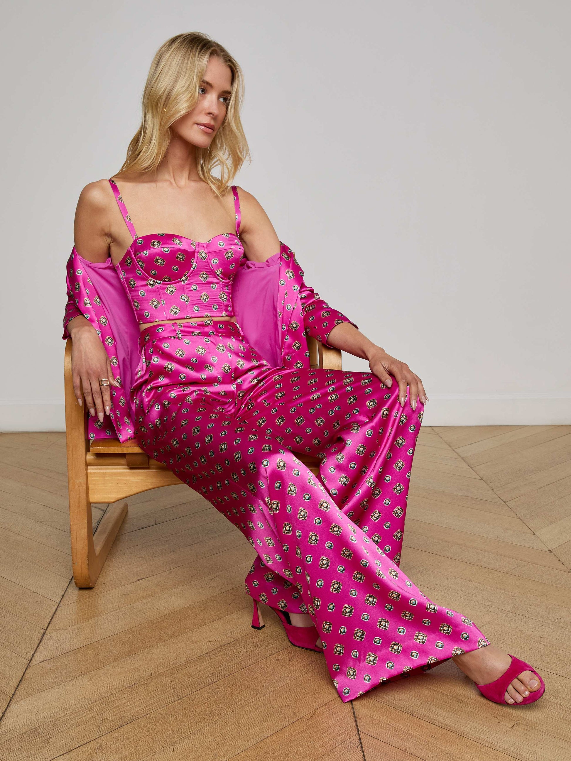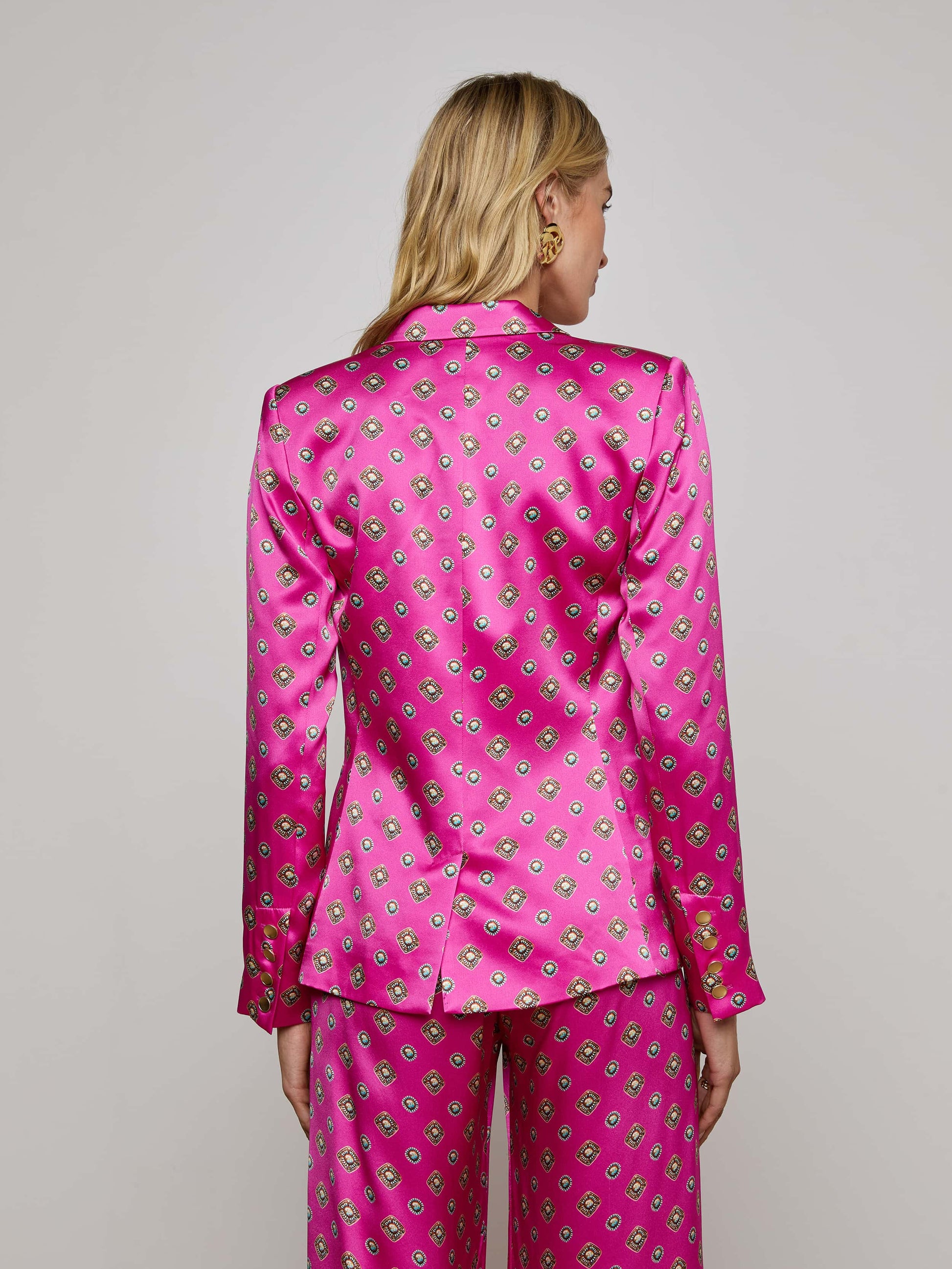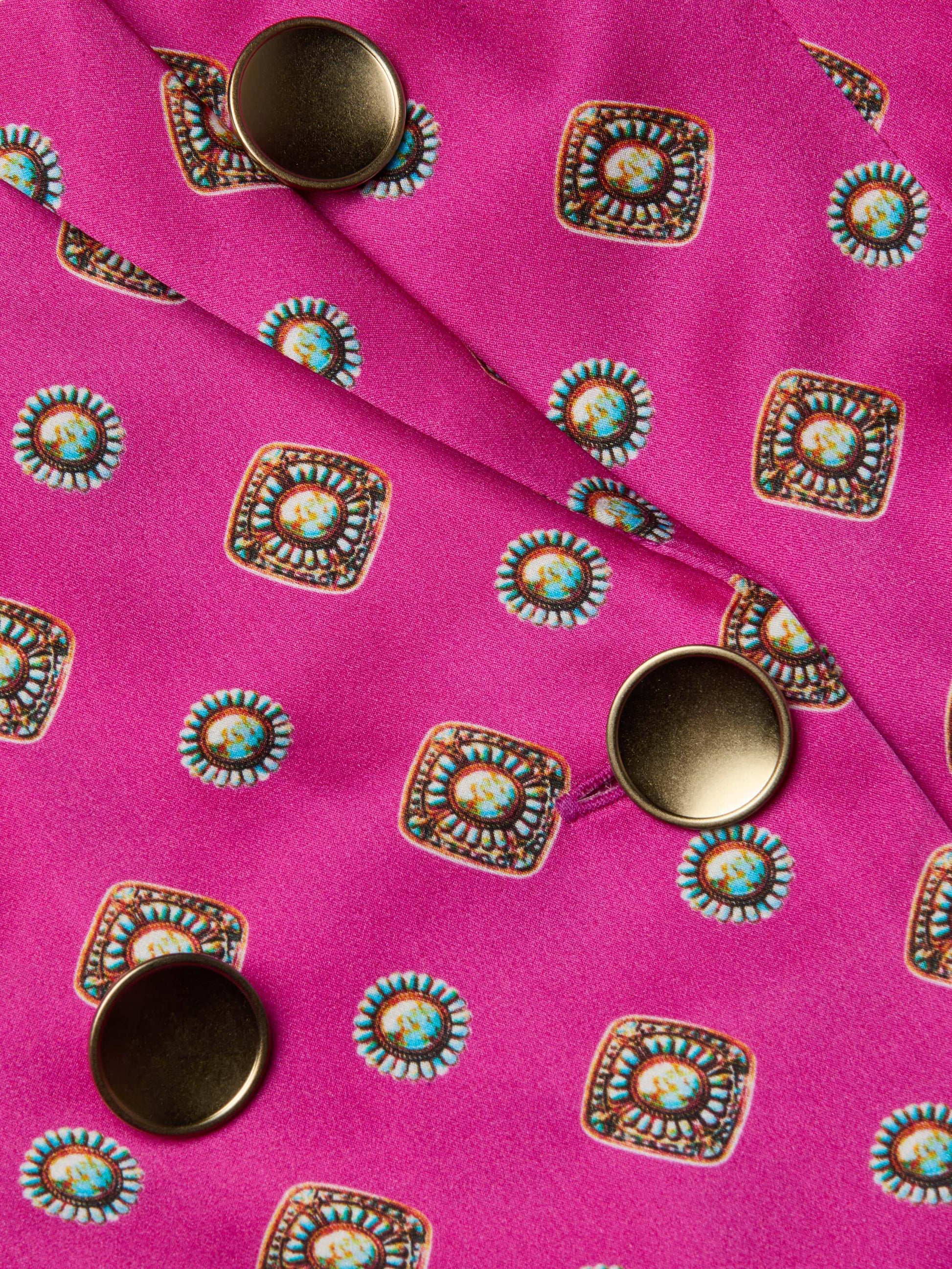 Subtle feminine shaping balances the crisp tailored details of this timeless double-breasted blazer. Now back in pink silk with a Southwestern-inspired print.