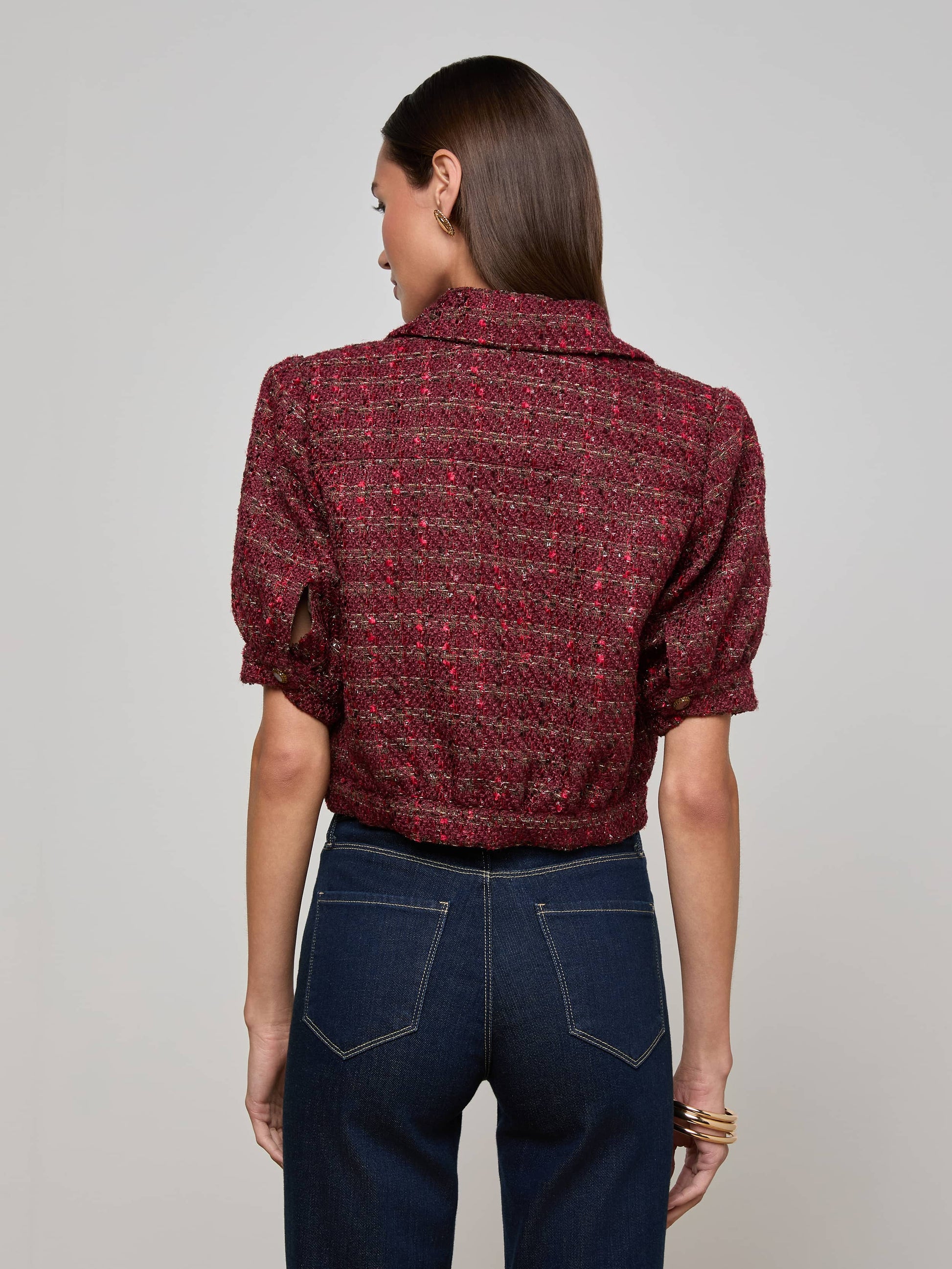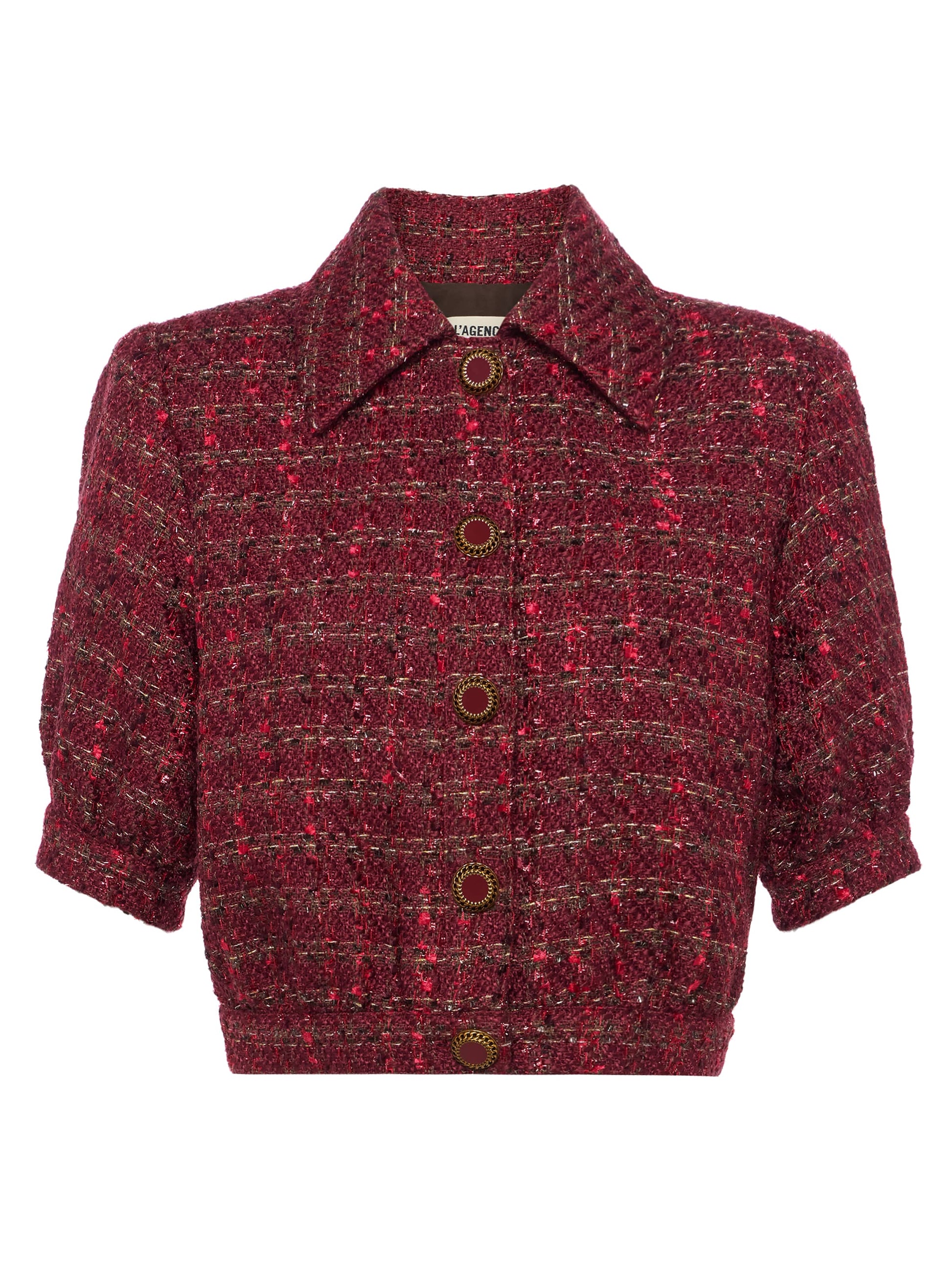 With an ultra-feminine cropped silhouette and puff sleeve, our cropped Cove works double duty as a chic jacket or top. Now back in a black cherry textured tweed with threads of red and brown, finished with vintage-inspired buttons.
