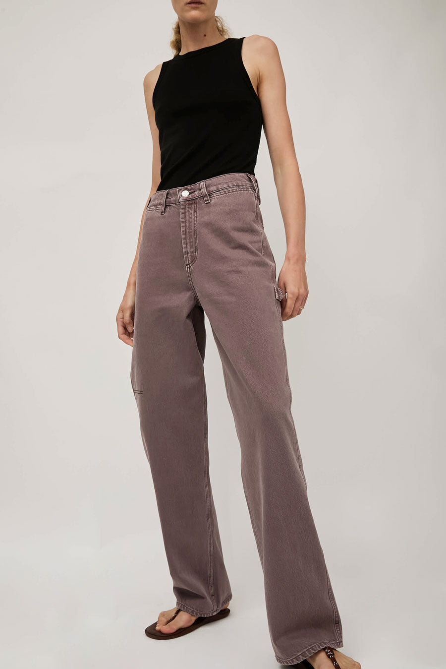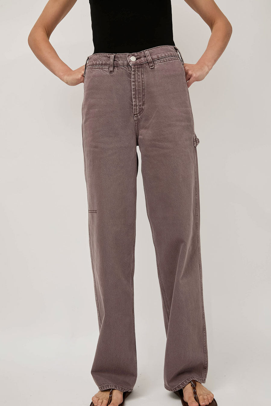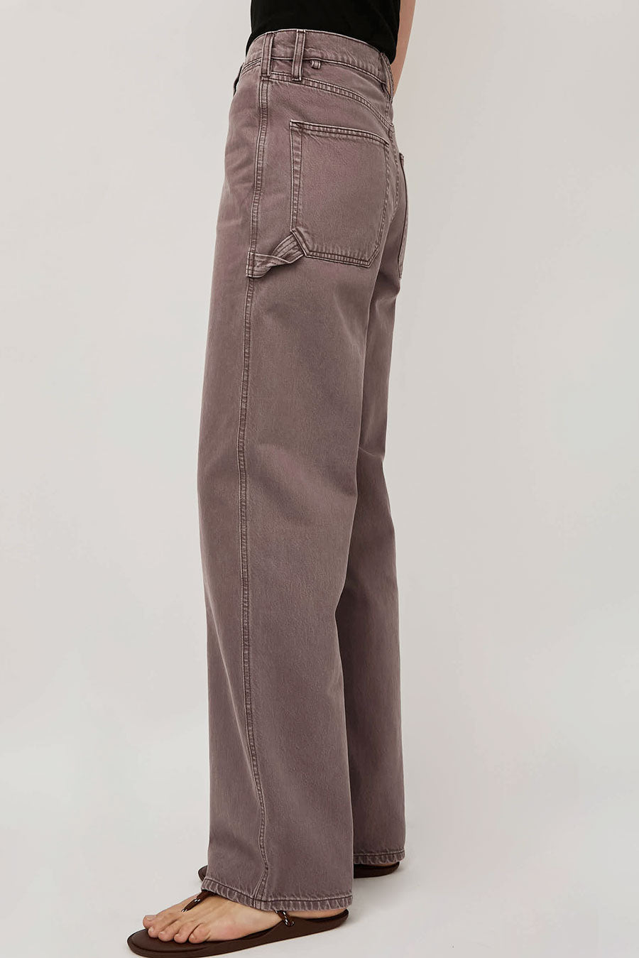 Workwear-inspired straight leg jean with hammer loop detail. Cut in 100% organic cotton denim. Easy, relaxed fit through the waist and hip. Low impact purple-grey wash.