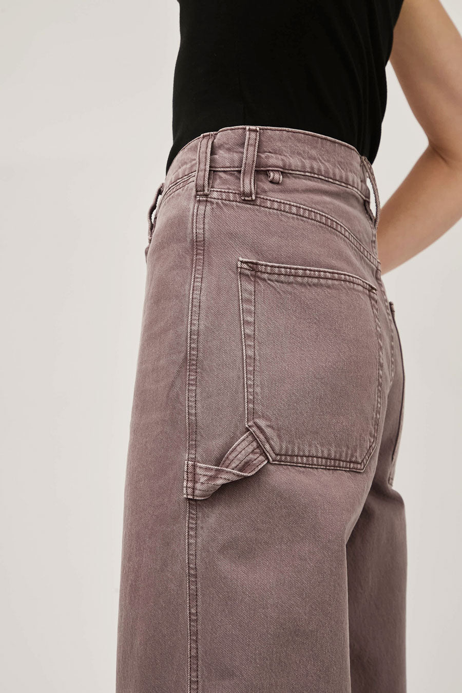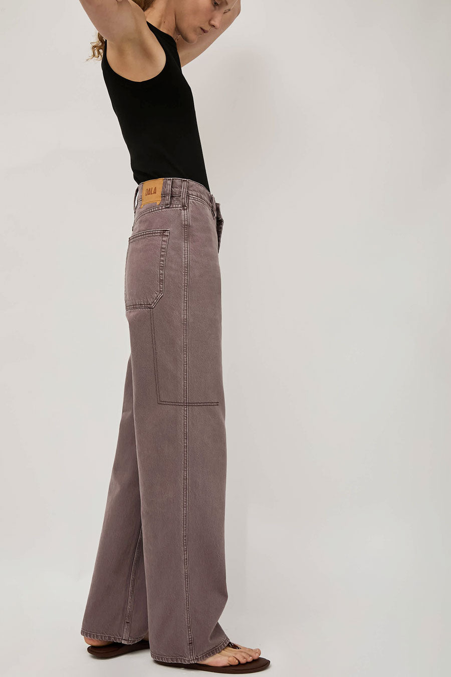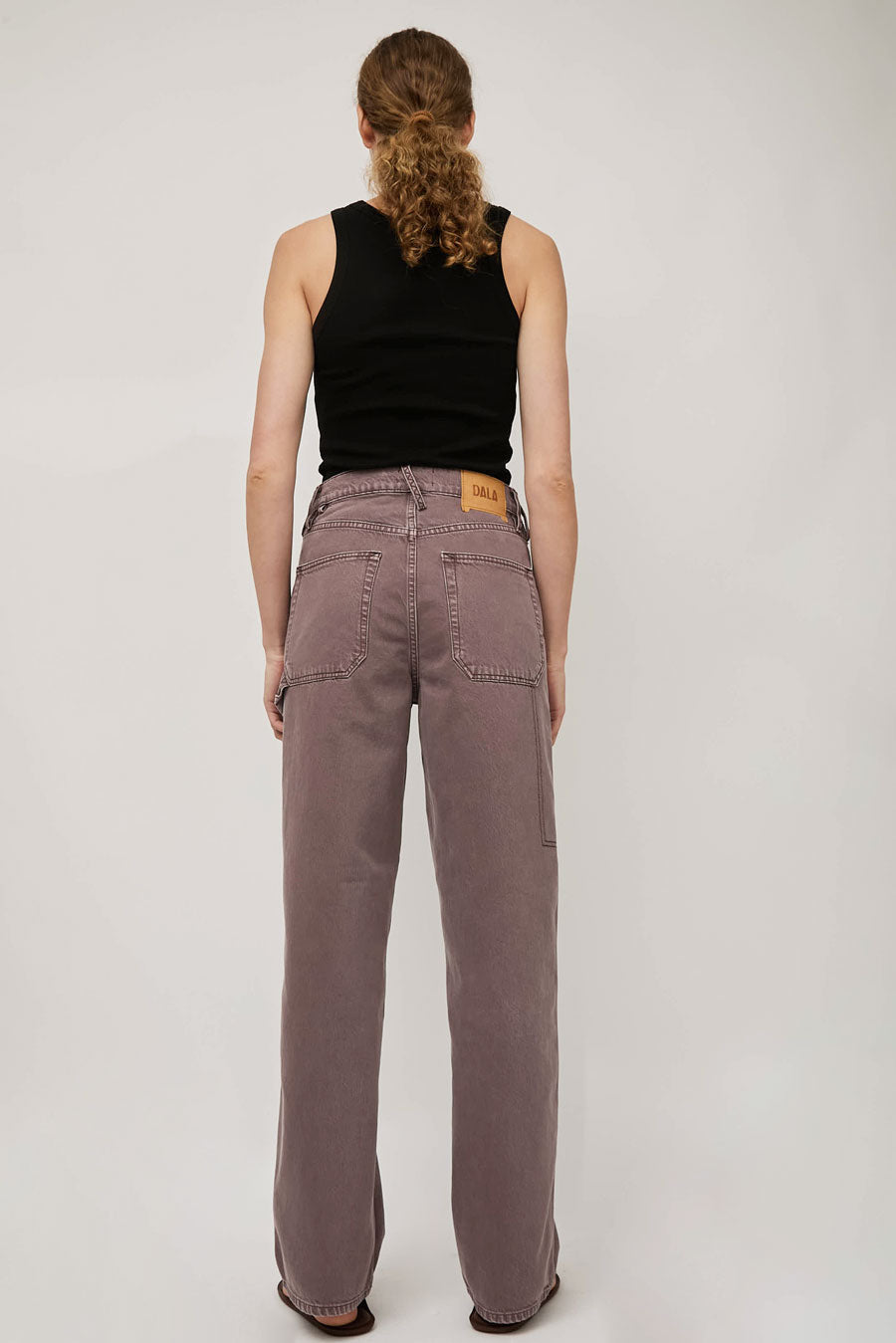 Workwear-inspired straight leg jean with hammer loop detail. Cut in 100% organic cotton denim. Easy, relaxed fit through the waist and hip. Low impact purple-grey wash.
