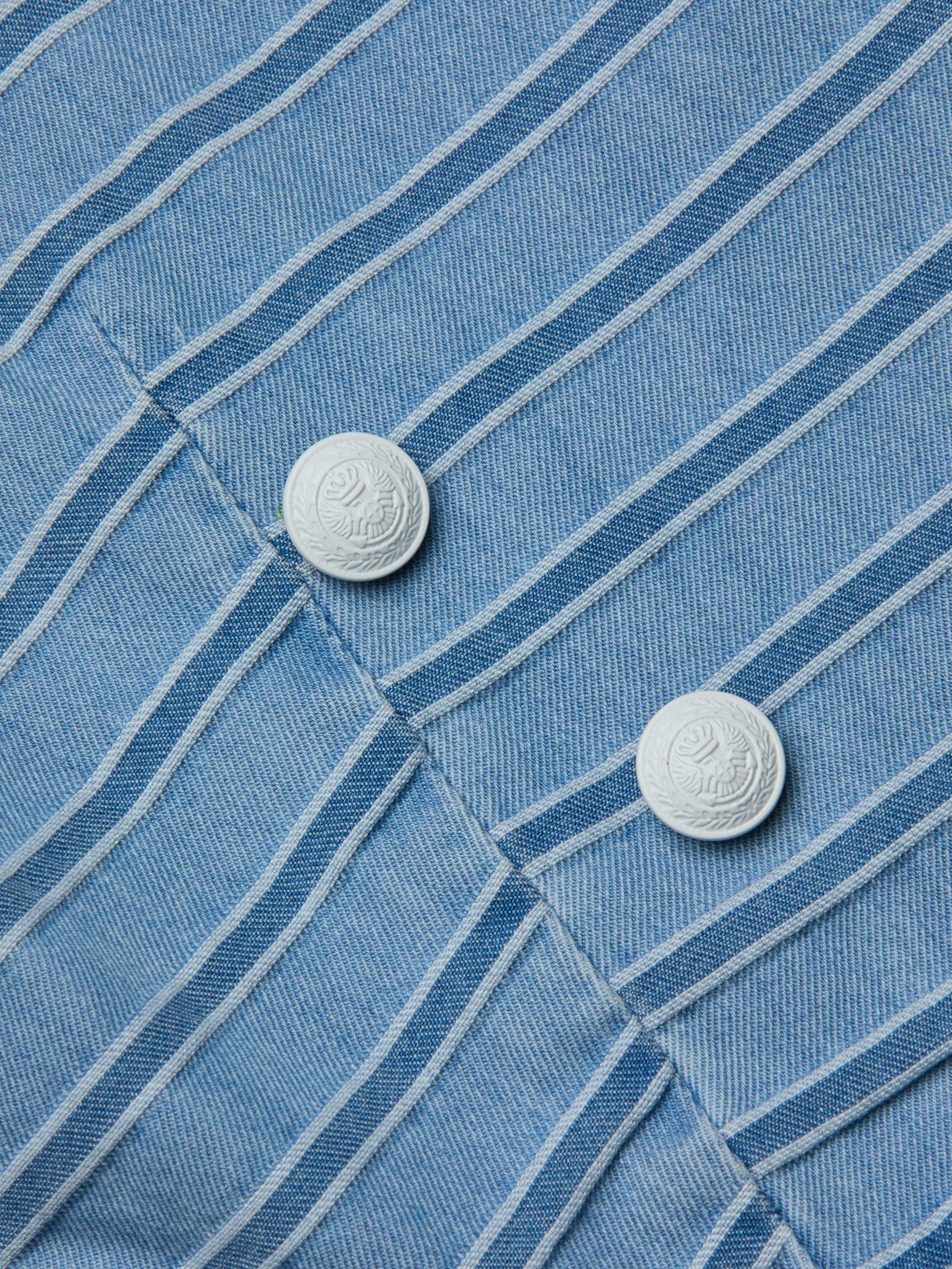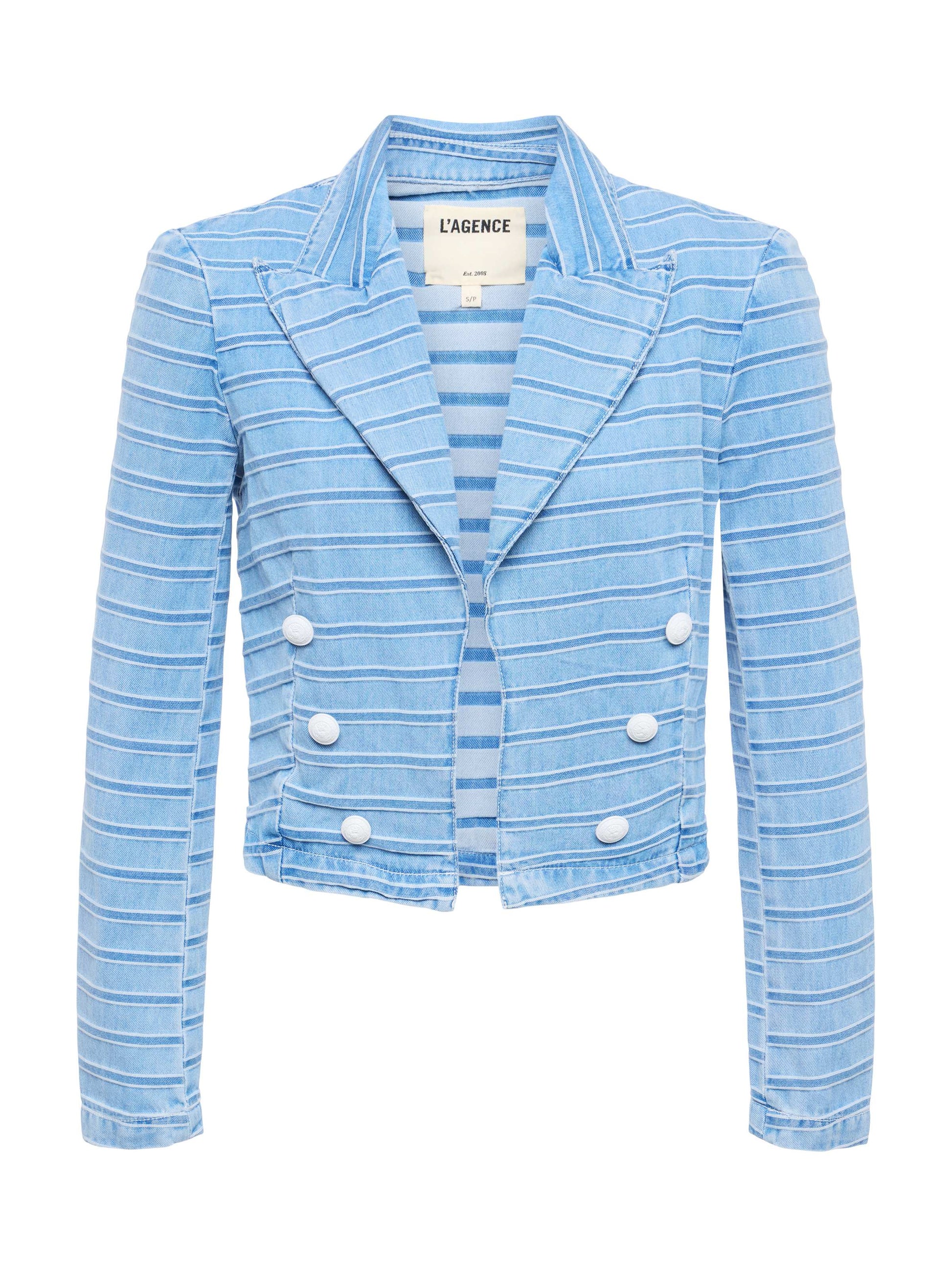 Meet your warm weather denim blazer. This striped jacket is the perfect layer to throw on over all your spring to summer looks from the office to brunch.