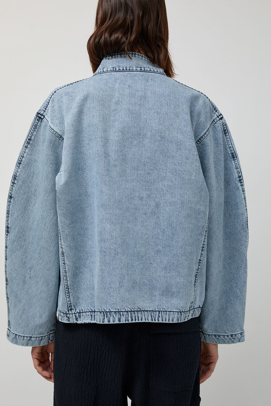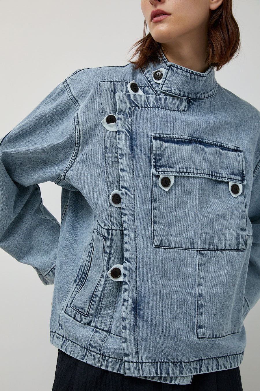 Updated motorcycle jacket in light-wash denim. Swedish military-influenced center pocket and asymmetric front placket with collar tab closure and oversized buttons. Side pockets. Dropped shoulders and wide sleeves.