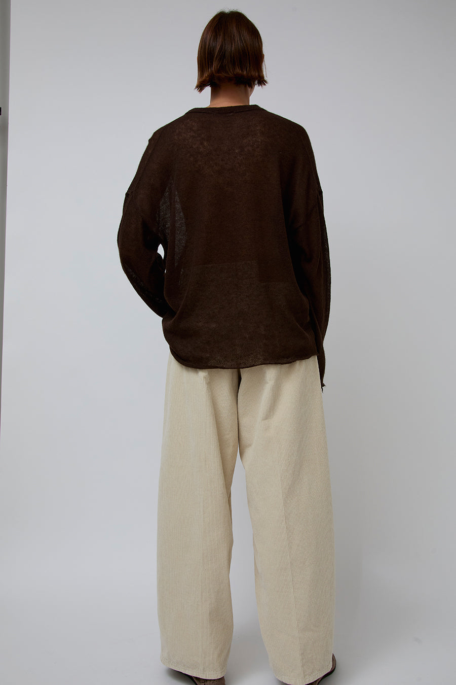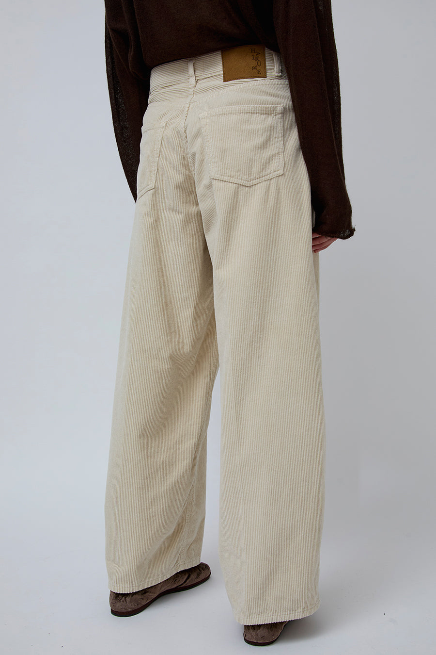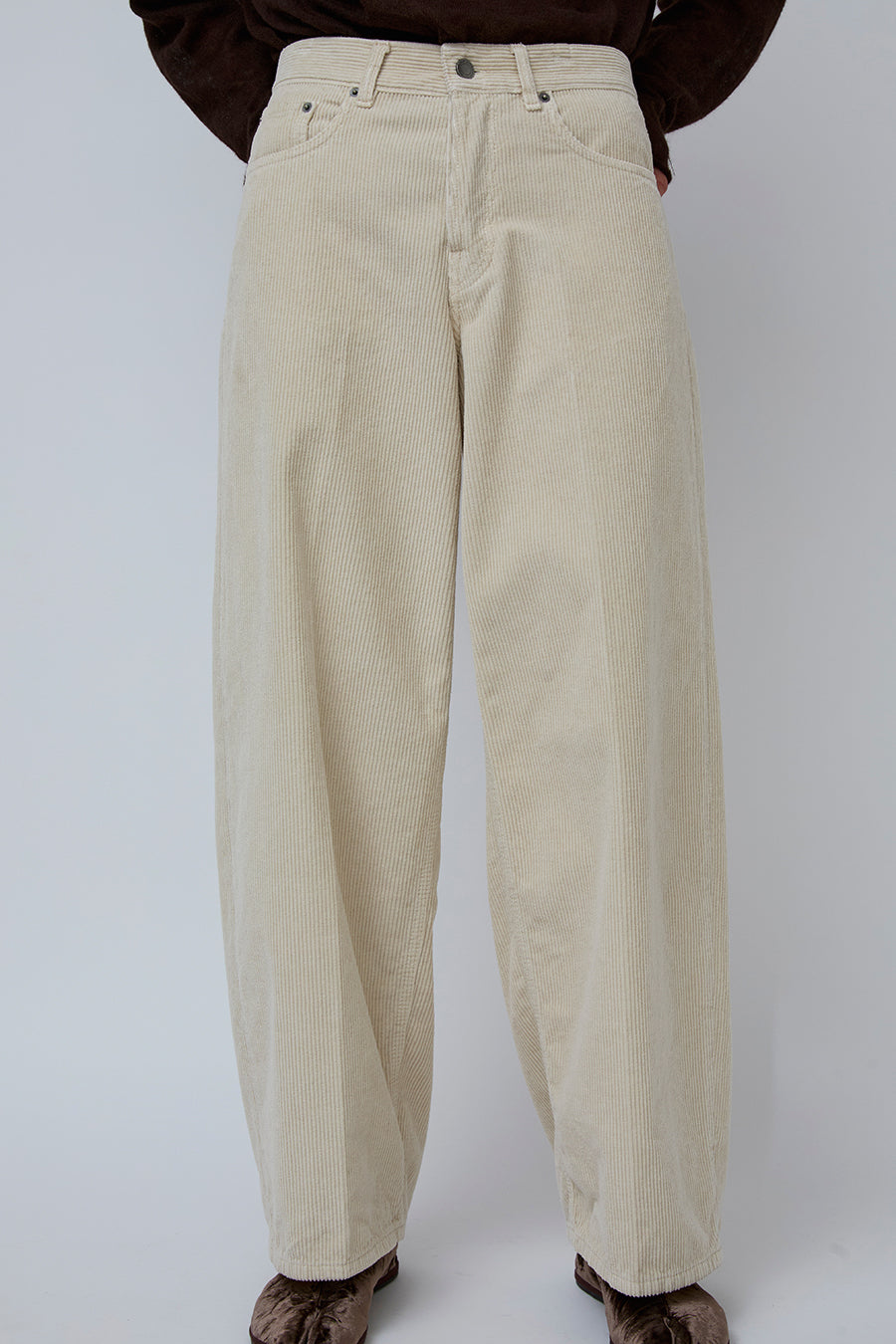 Soft, fluid corduroy trousers with a boy-fit silhouette and relaxed, loose-fitting design for effortless comfort and understated style. 100% cotton and classic 5 pocket construction.