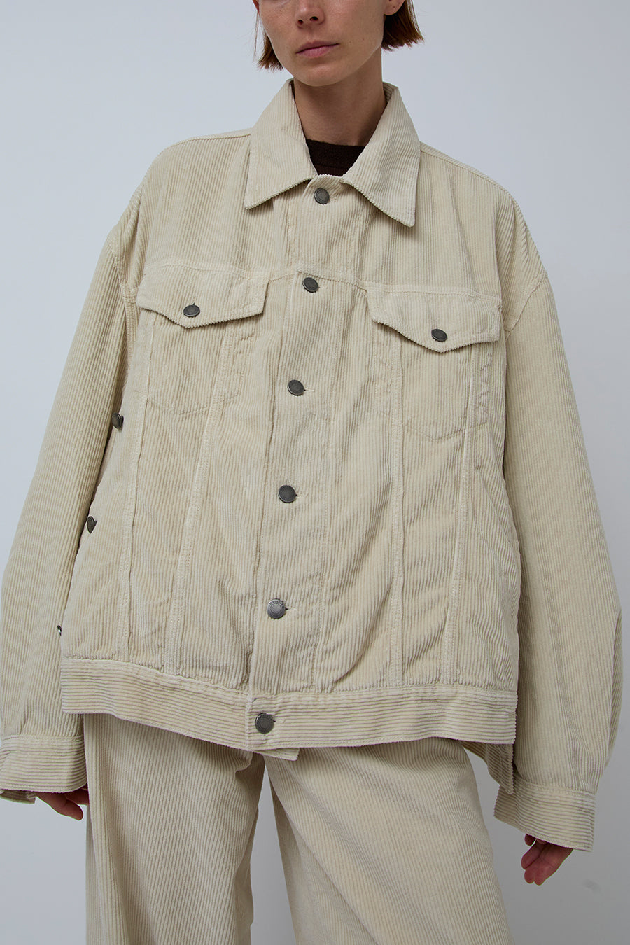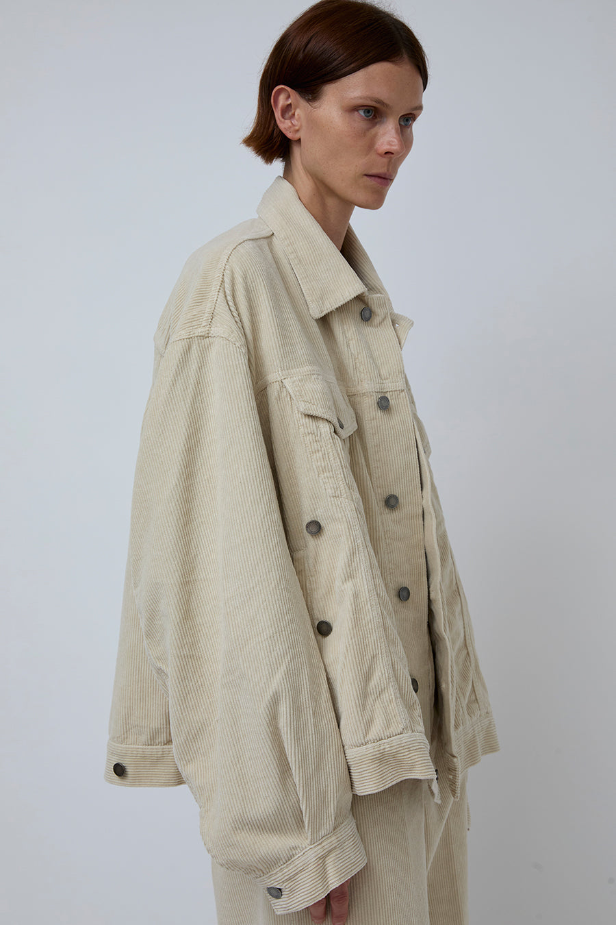 Oversized, yet structured corduroy jacket with a boxy fit, balloon sleeves, and a double-breasted front closure that creates an asymmetric architectural silhouette.
