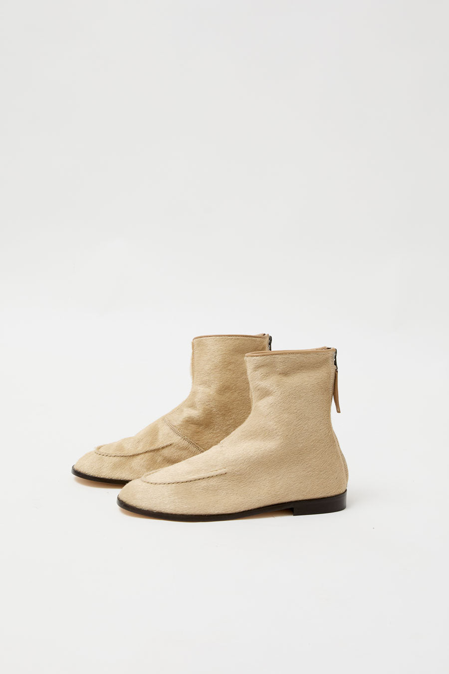 Soft low-calf boot with front seam detail, crafted in textured calf hair. Back zip closure. Handmade in Spain by local artisans.