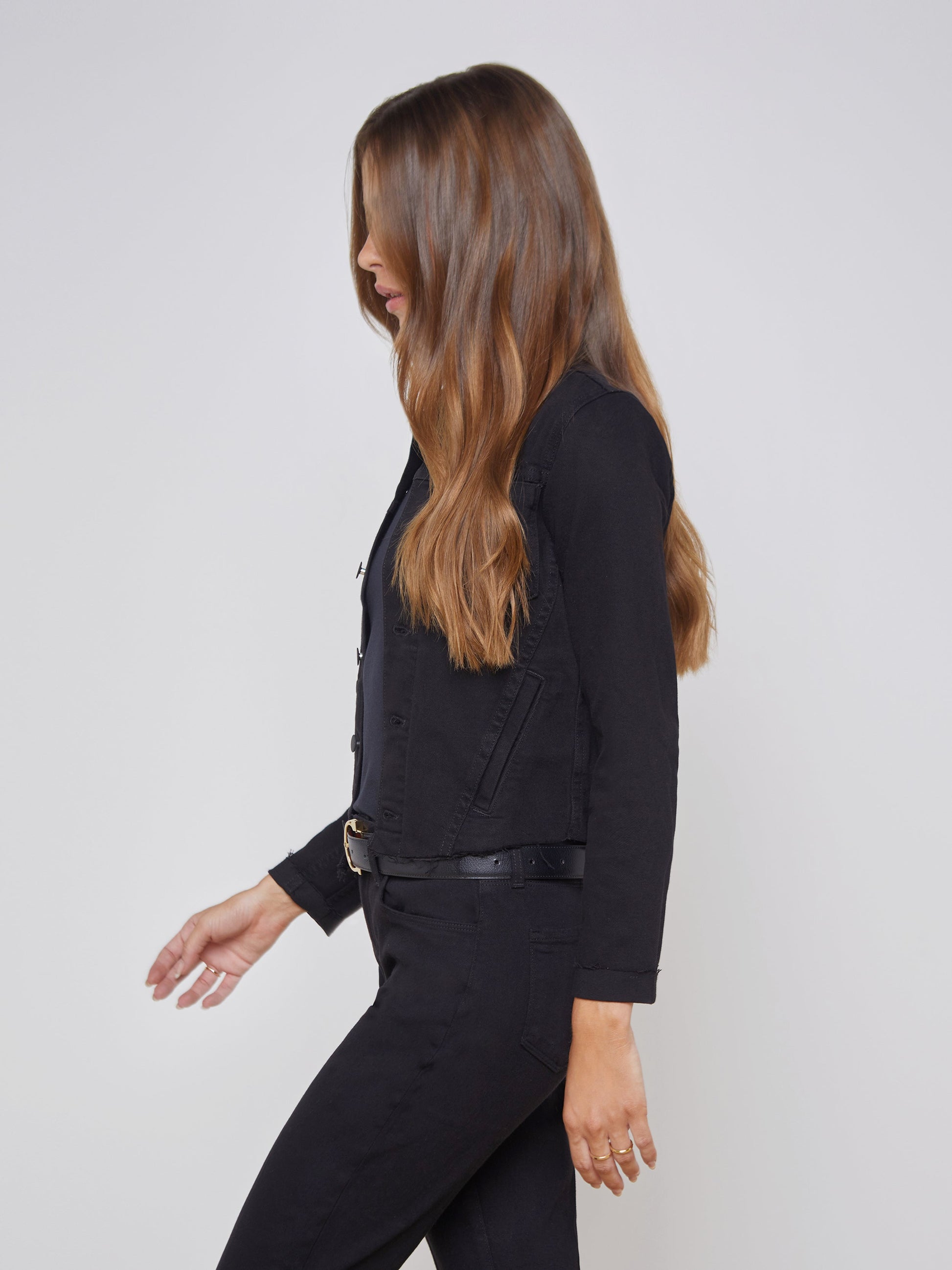 A slim denim jacket in saturated black. A crop cut, front angled seaming and welt pockets define the waist, accentuating an hourglass shape. Includes hems with clean raw edges, double-stitched chest pockets and cuffed three-quarter sleeves. Fastens in front with matte-black buttons.