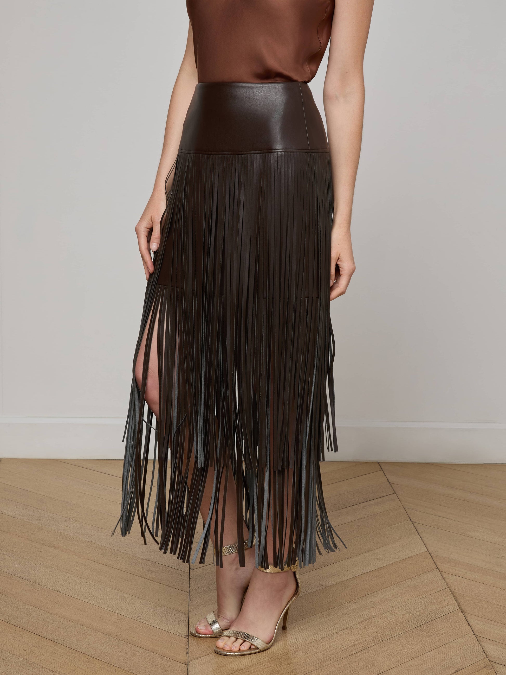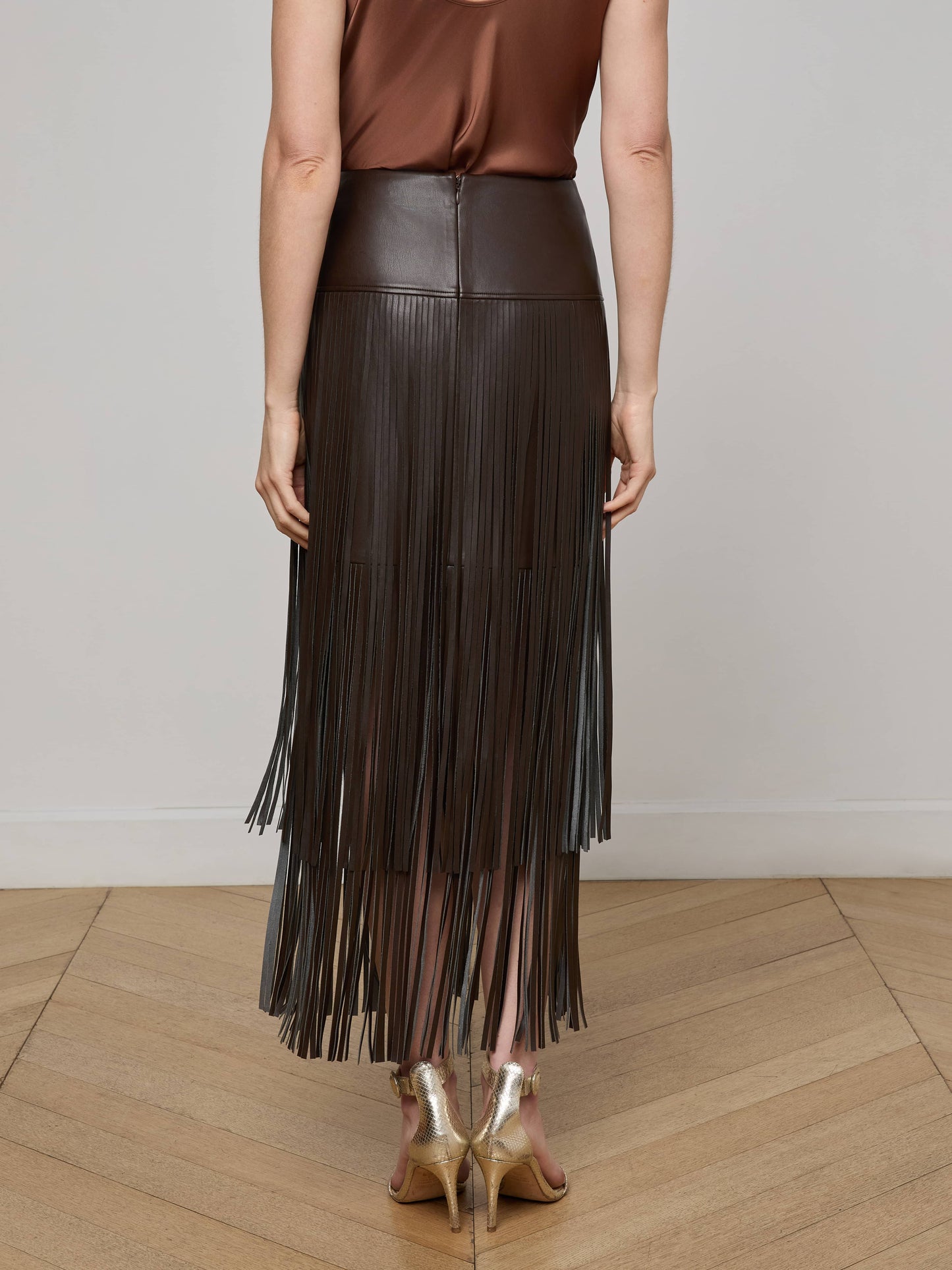 The Karolina statement skirt turns heads with every step—crafted in dark brown vegan leather, it features tiered fringe for dramatic movement and studded detailing for extra edge.