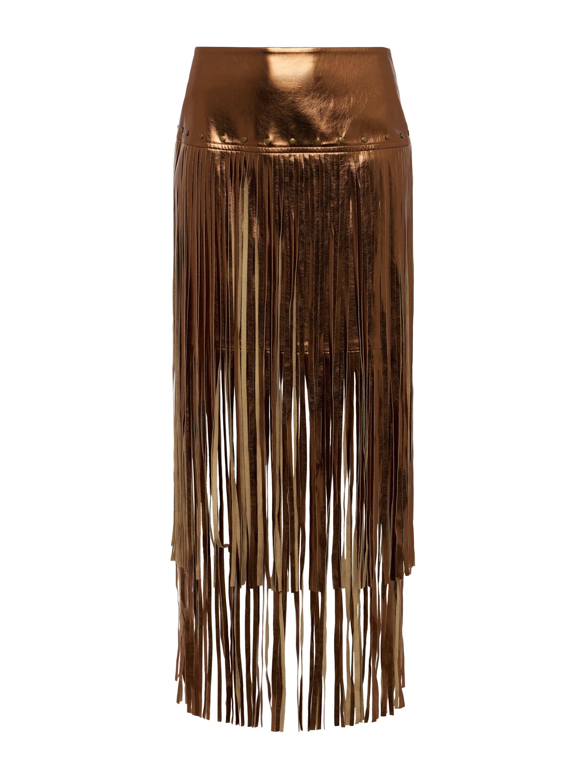 The Karolina statement skirt turns heads with every step—crafted in bronze vegan leather, it features tiered fringe for dramatic movement and studded detailing for extra edge.
