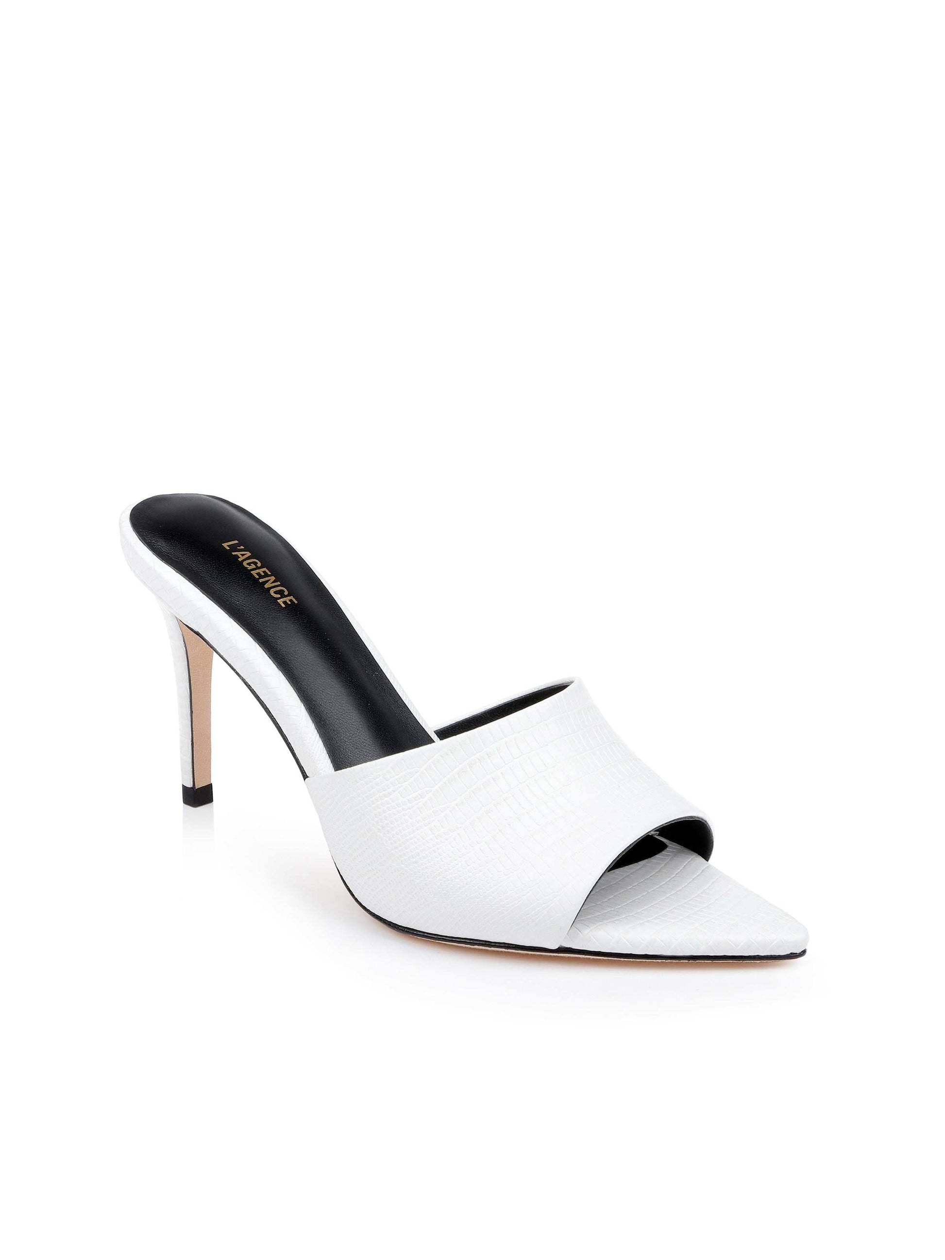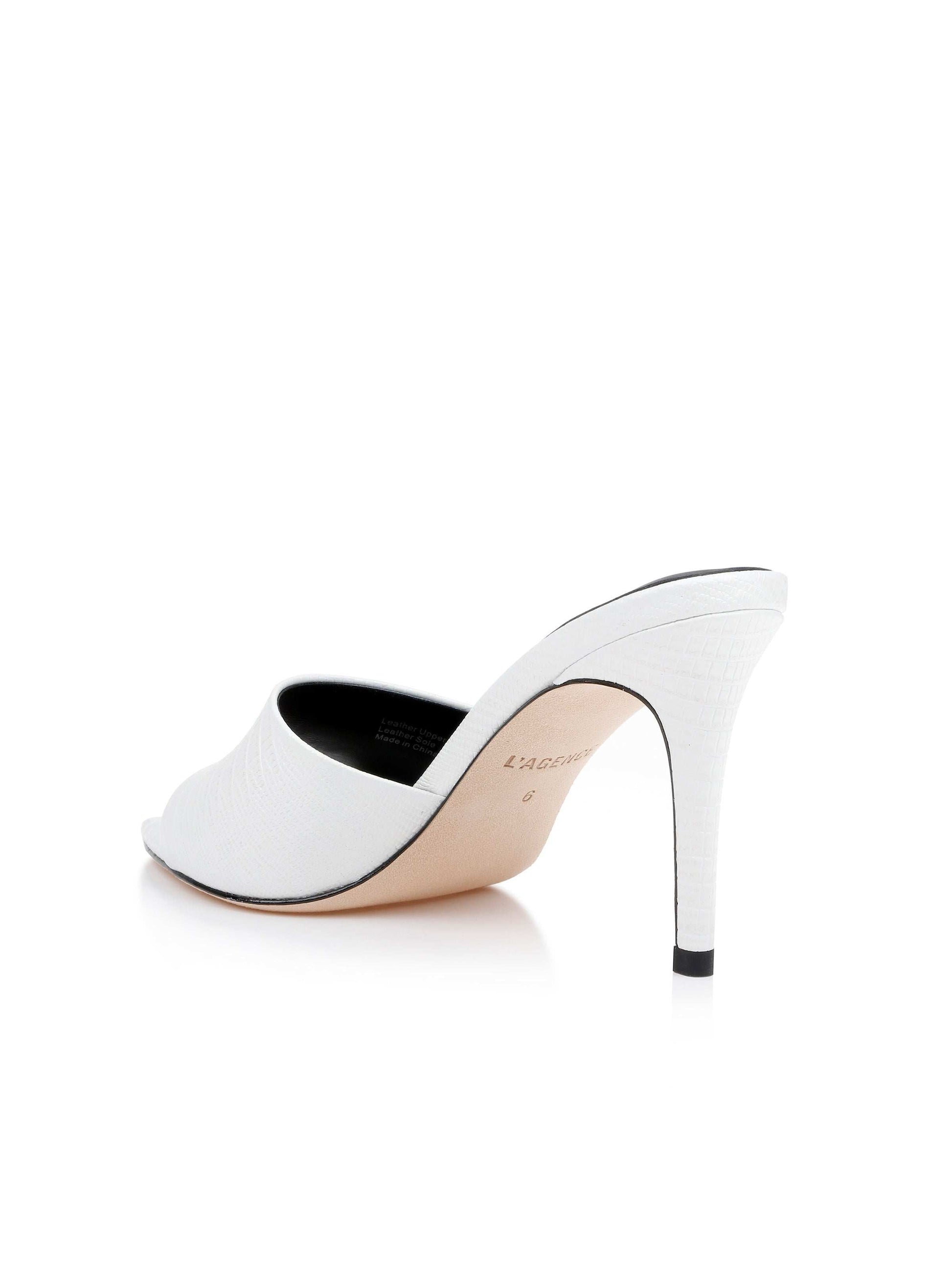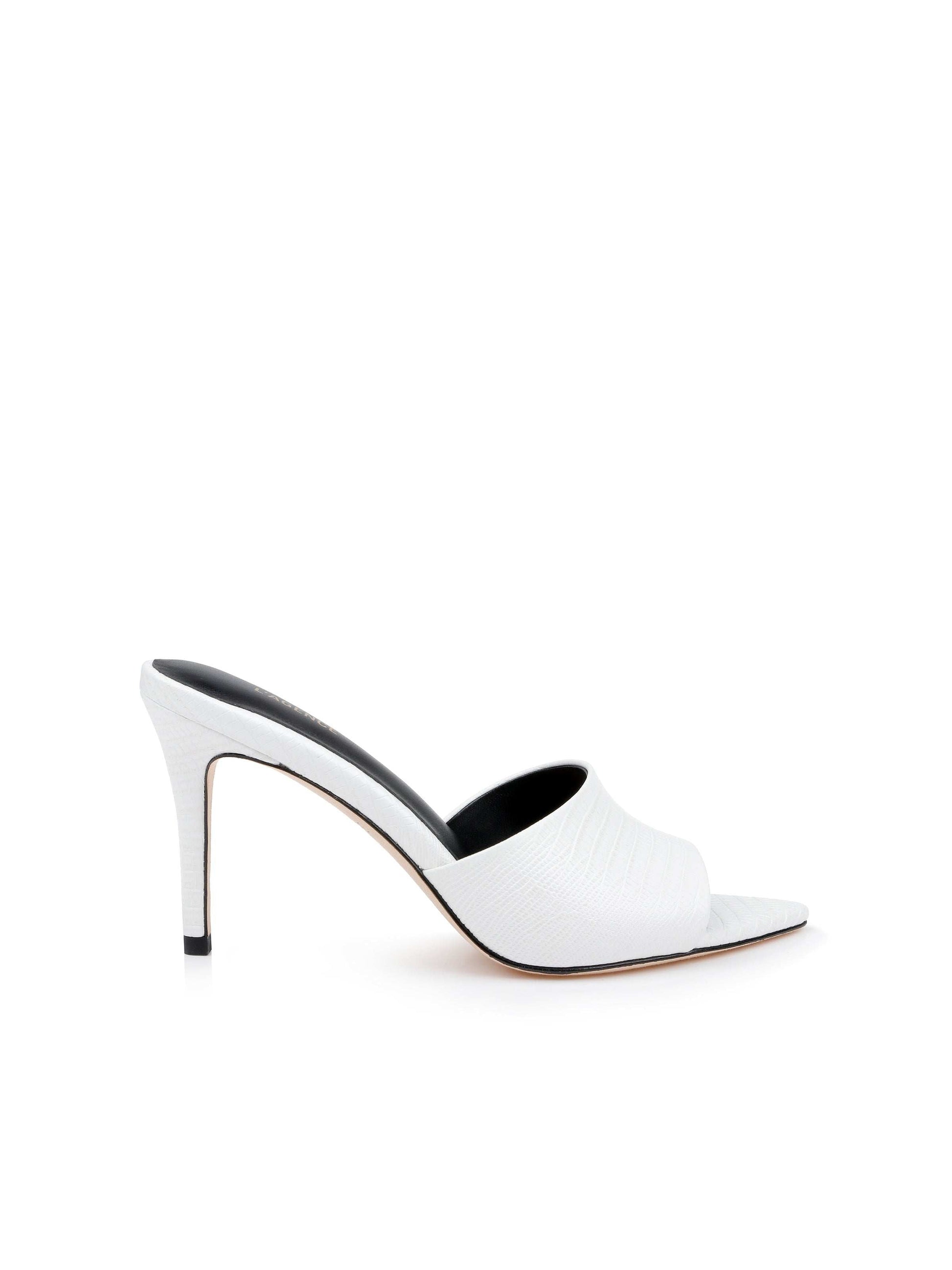 Our signature peep-toe mule, updated in lizard embossed white leather for an edgy spin on minimalist style.
