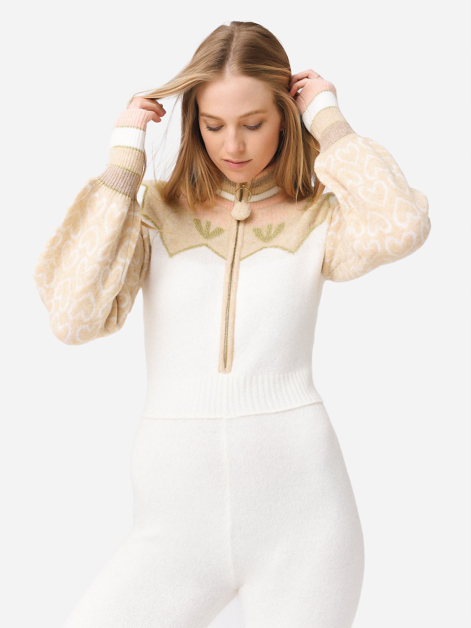Ultra-soft knit jumpsuit with signature jacquard motifs.