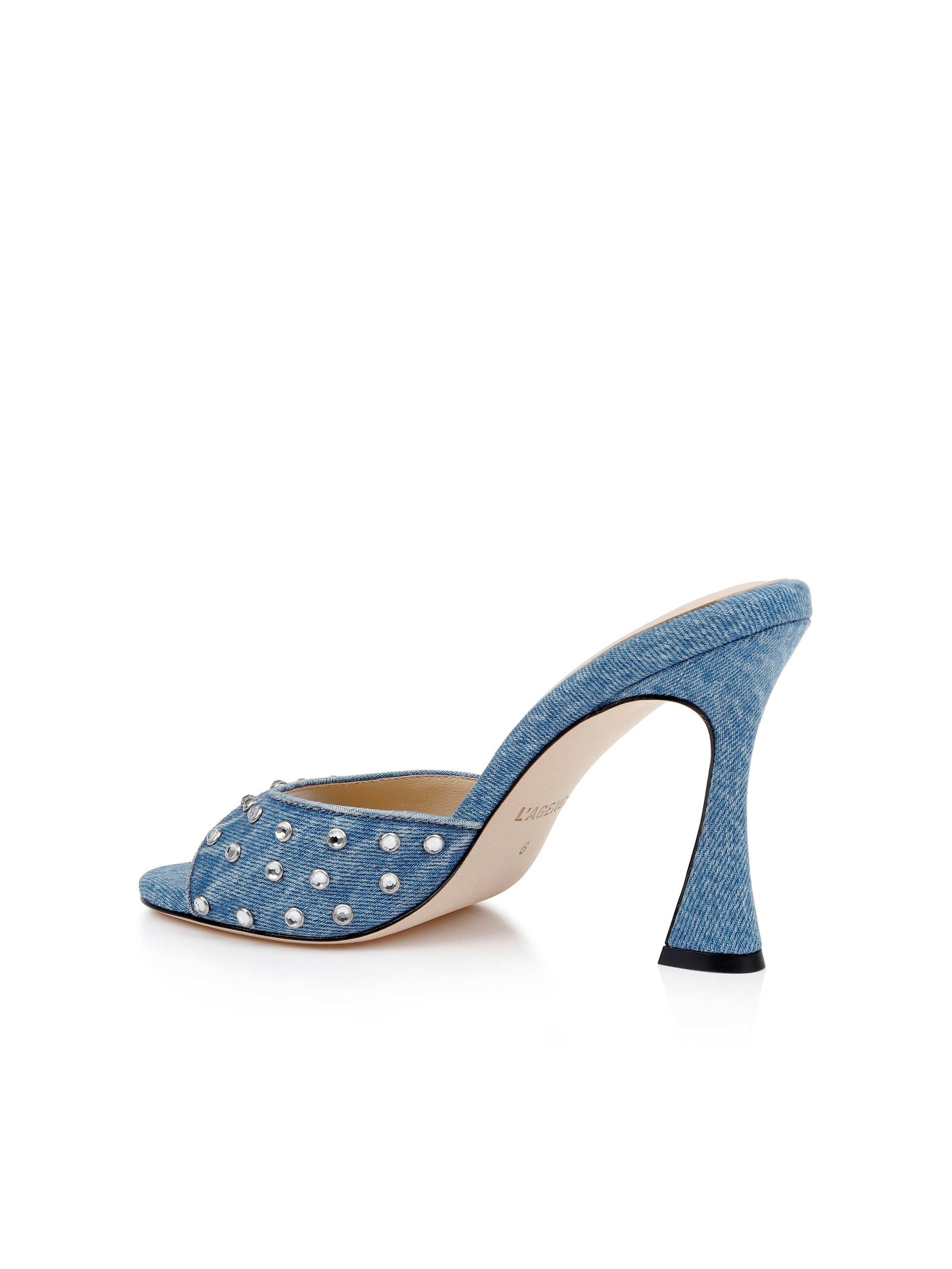 Our signature open-toe heel gets a fresh update in light-wash denim, finished with rhinestone embellishments for an extra glam factor.
