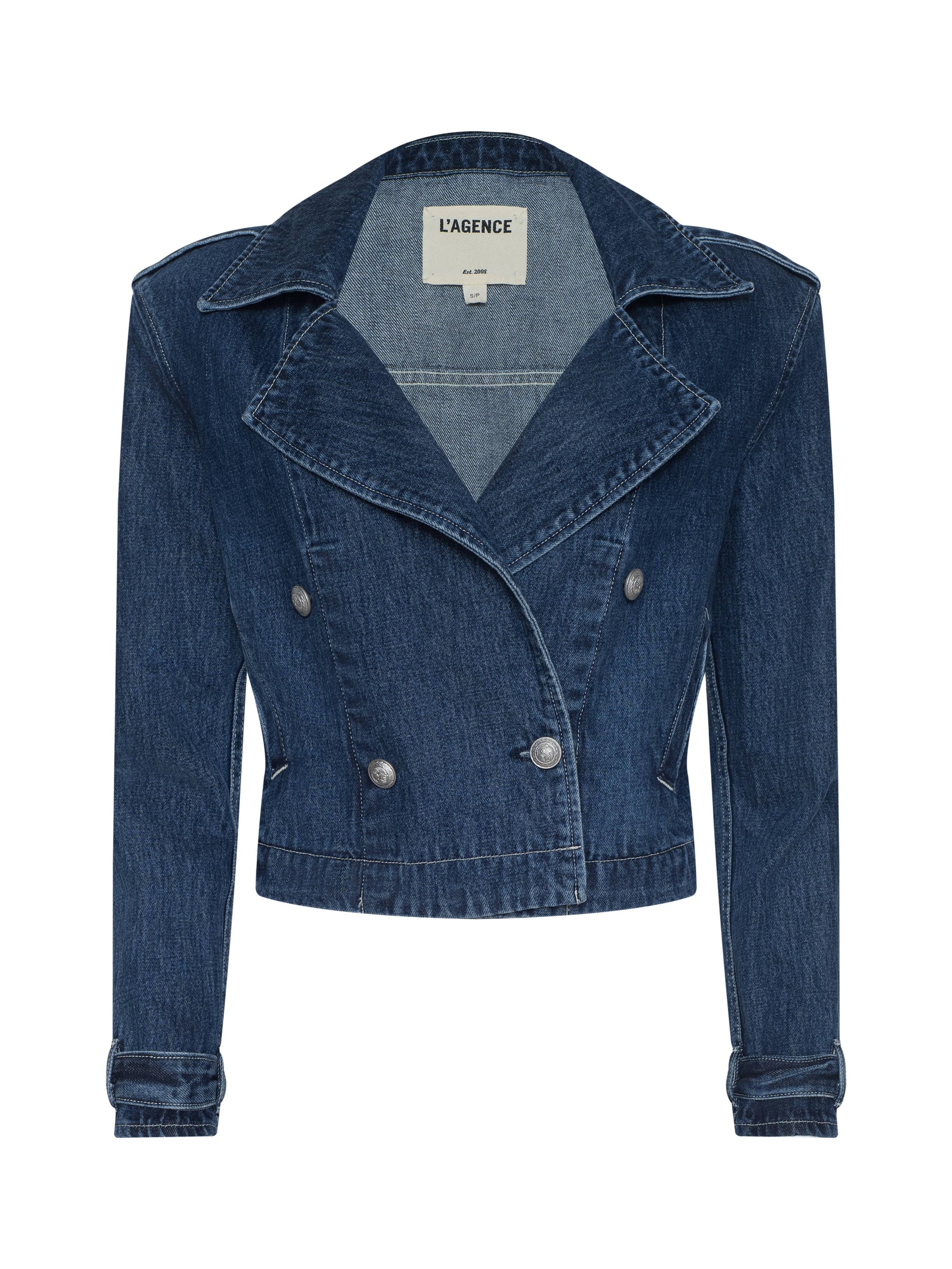 The Maddox double breasted jacket combines the sharp, sophistication of a trench with the cool factor of denim. Detailed with epaulets and belted cuffs, this cropped denim trench makes a chic alternative to a jean jacket. Strong shoulders and angled welt pockets create a flattering, defined silhouette.