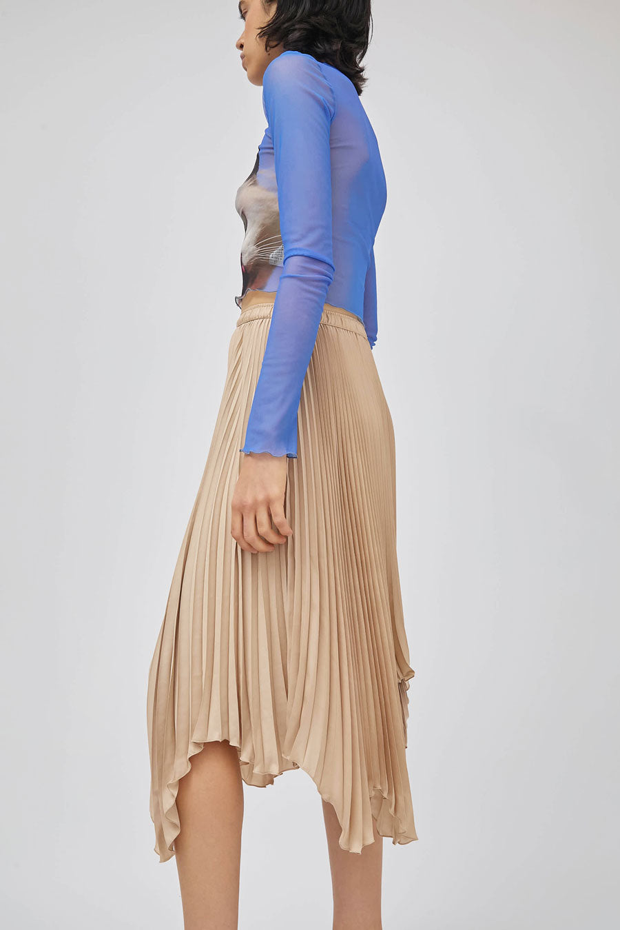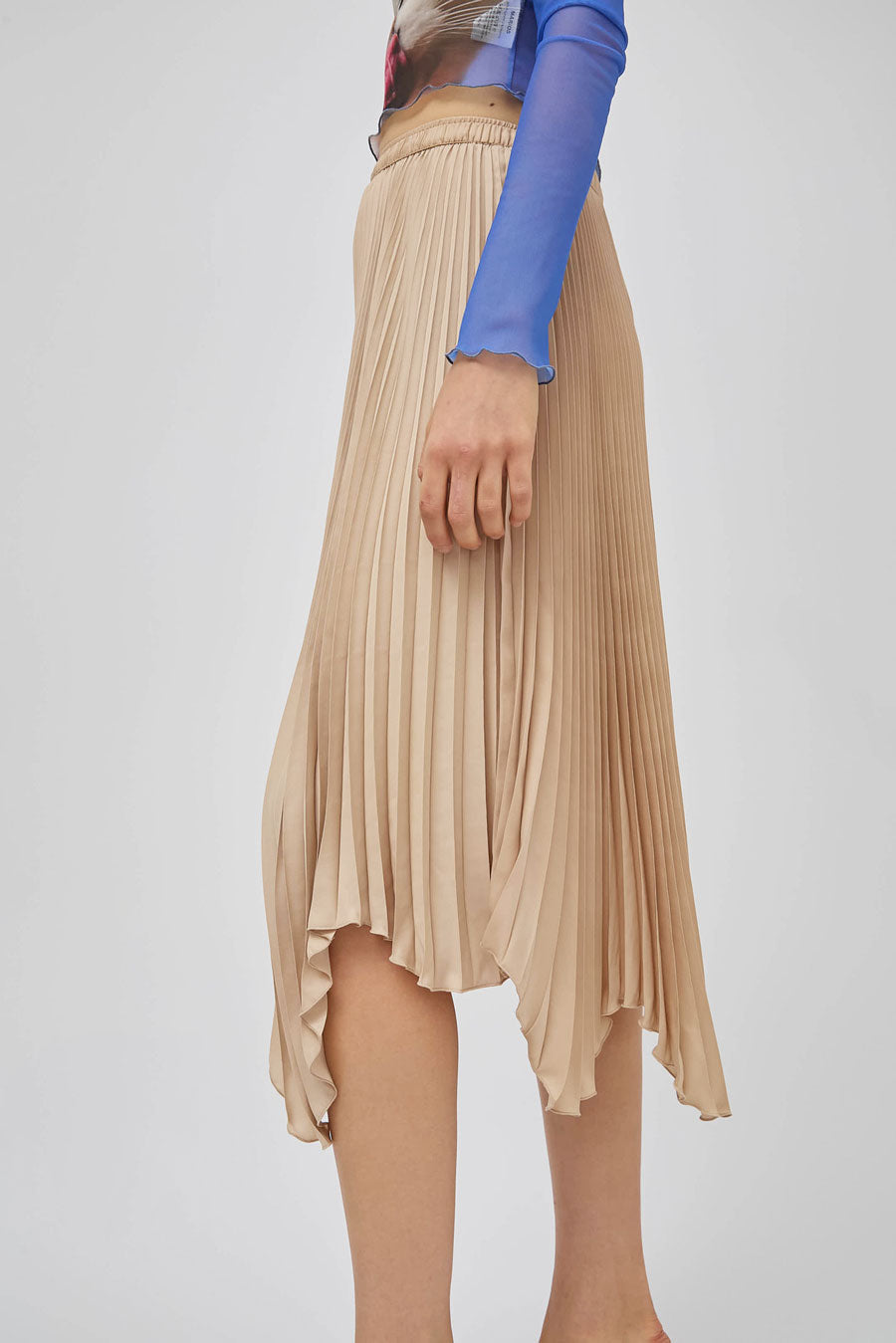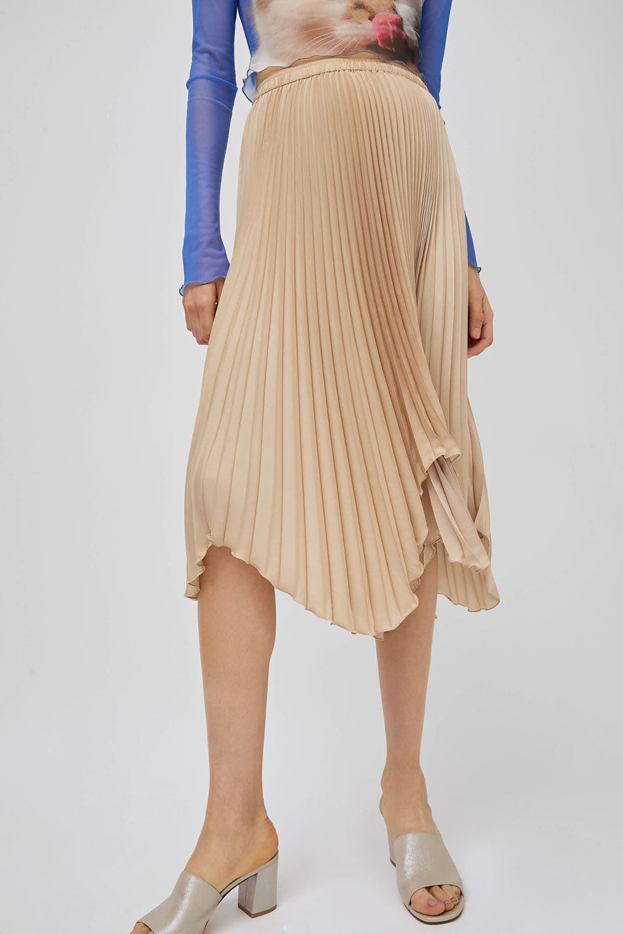 Flouncy pleated skirt hits below knee. Elasticated waistband and impish wiggly hemline.