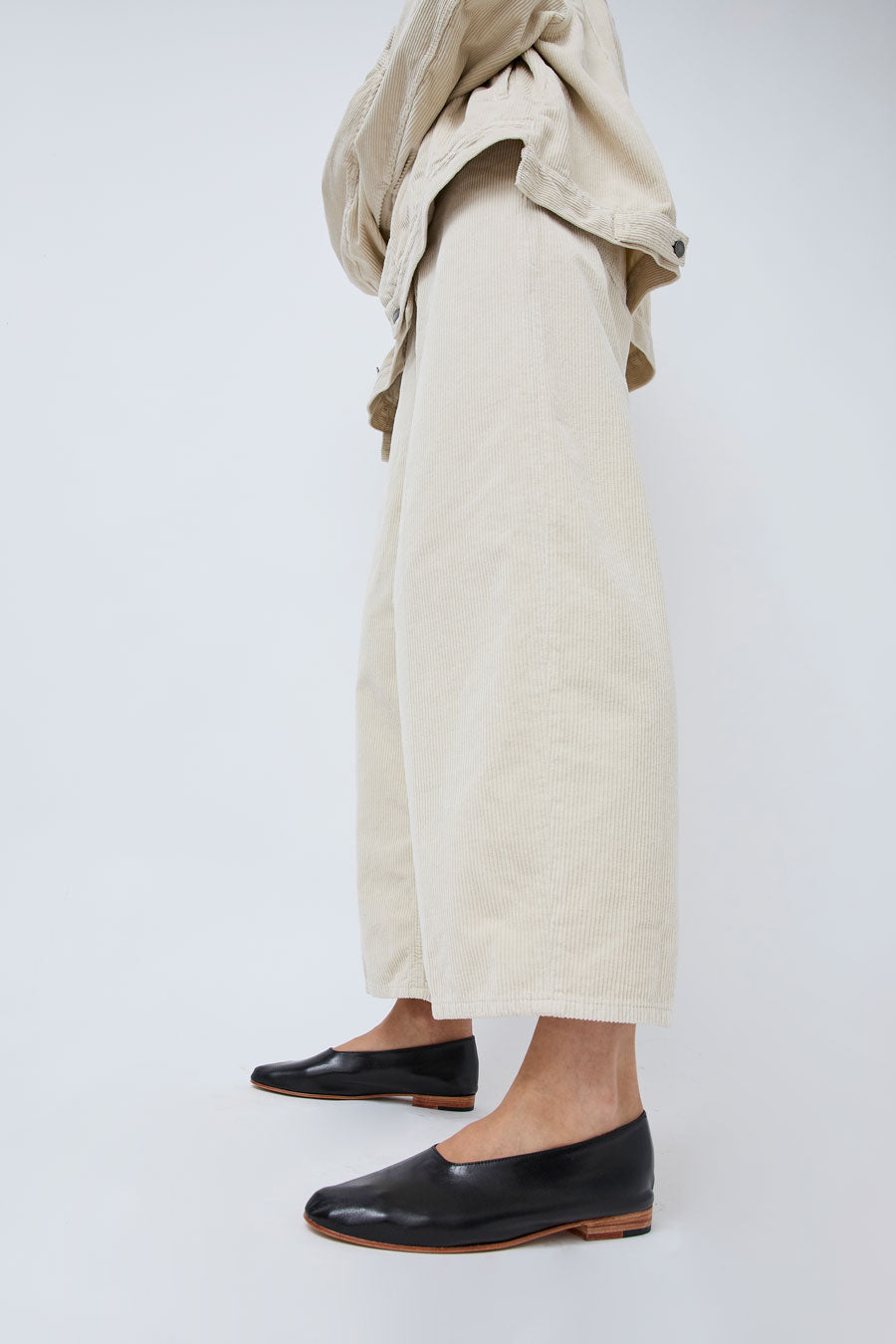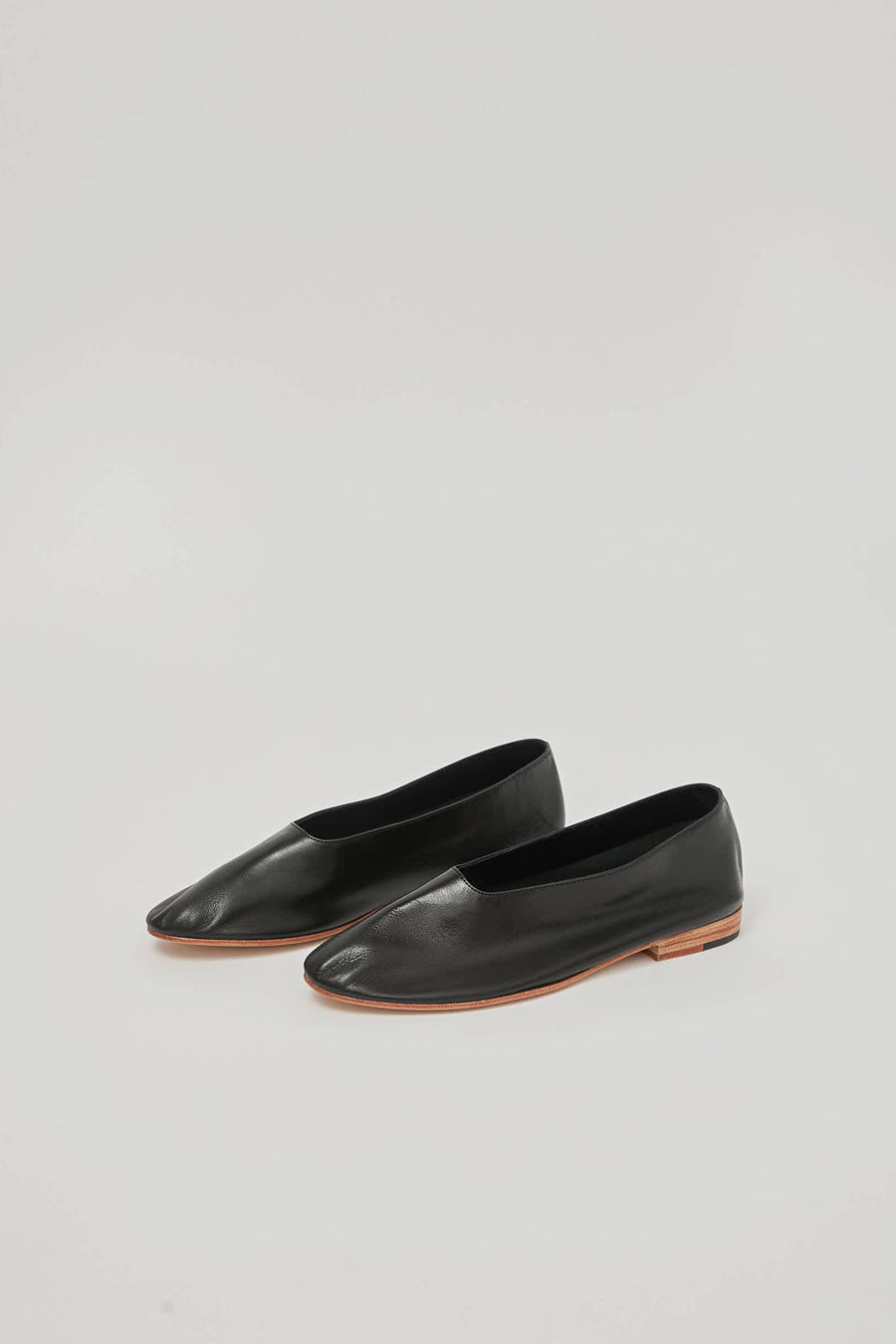 Minimal slip on shoe with rounded toe and soft kid leather upper. Narrow silhouette and a small wood effect stacked heel for extra comfort. Leather sole, insole and lining.