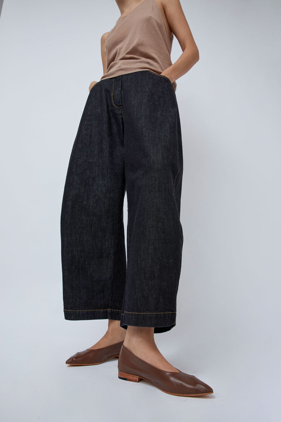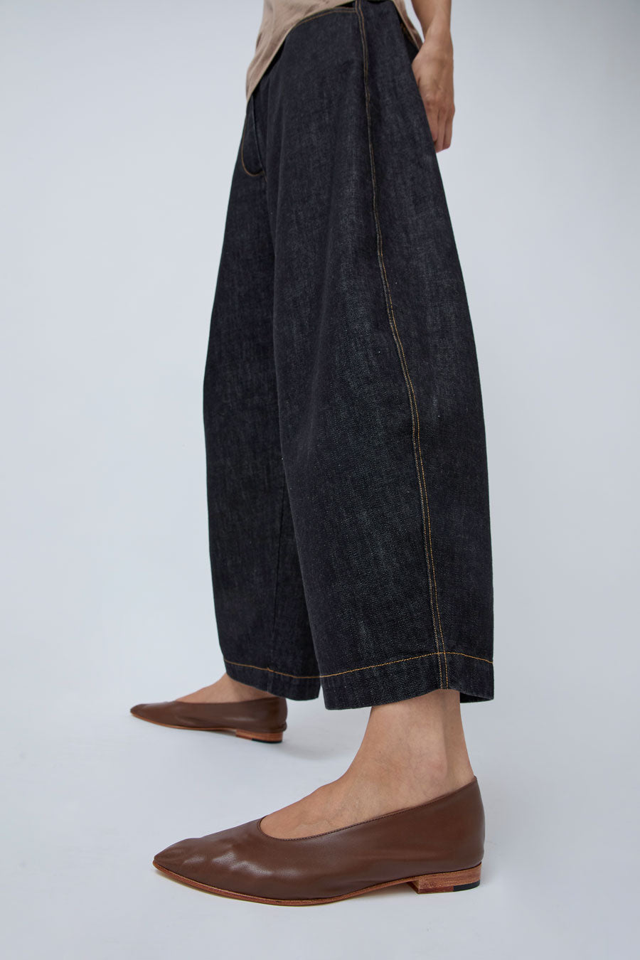 Minimal slip on shoe with pointed toe and soft kid leather upper. Narrow silhouette and a small wood effect stacked heel for extra comfort. Leather sole, insole and lining.