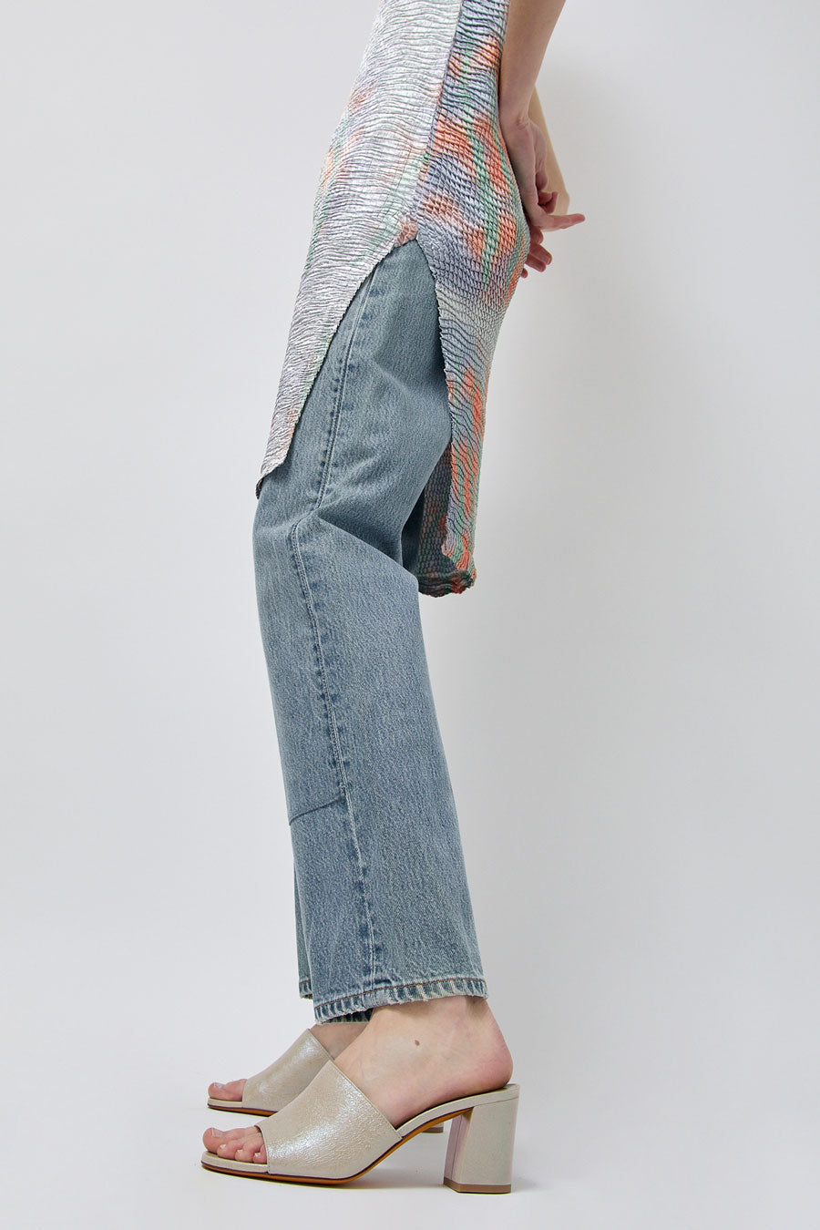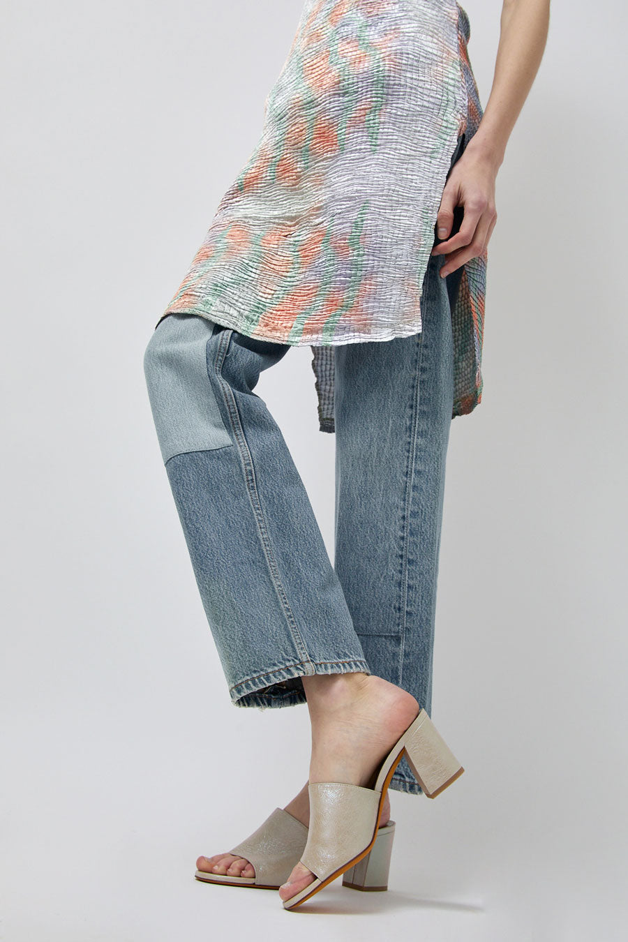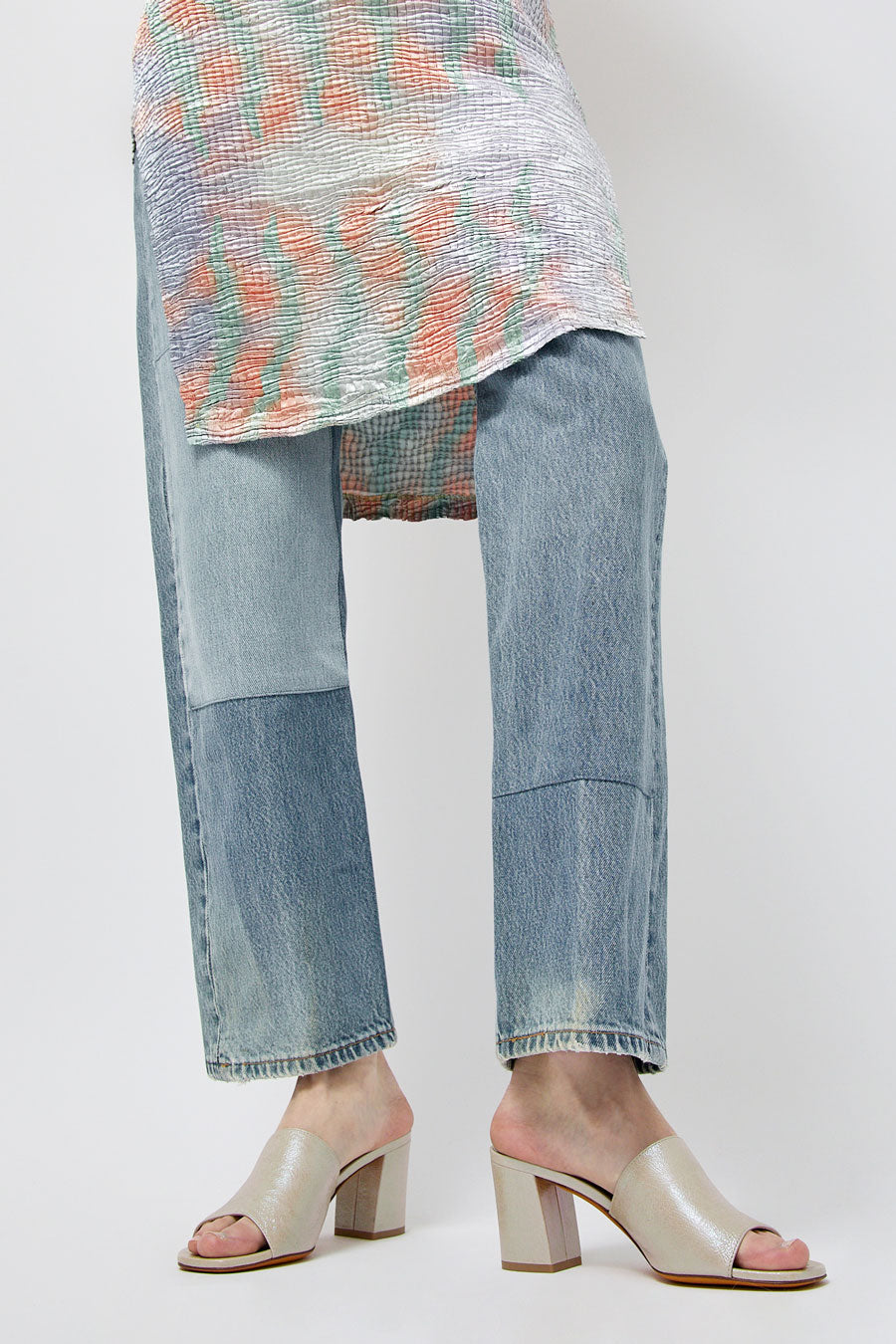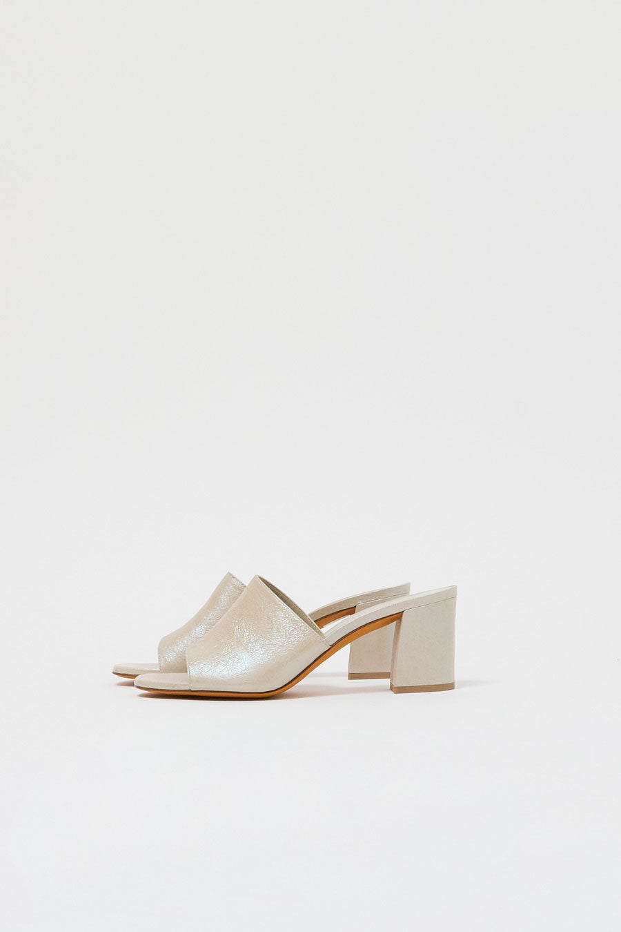 Open-toe mule in 100% calf leather with block heel. Textured, pearlescent beige.