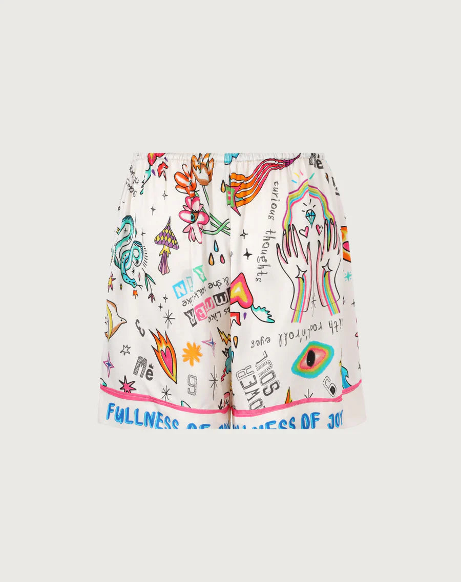 100% Viscose elastic waist shorts in our Enlightenment pattern. Tie closure at waist. Shorts read “JOYFULNESS OF JOY” across hemline. Pair with our matching shirts for a vibrant, psychedelic look.